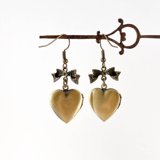 Heart Locket Earrings | Working Lockets with Bow Detail - Antique Bronze