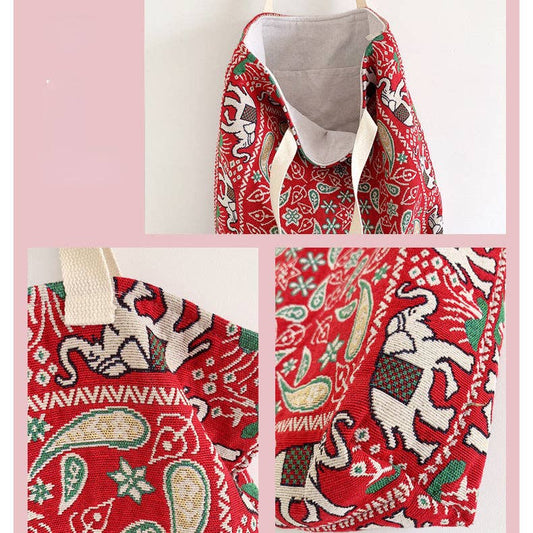 Vintage Bohemian Style Red Elephant Embroidery Tote Bag