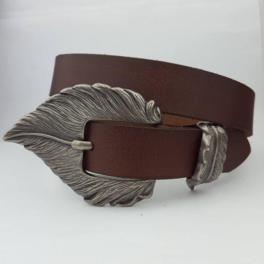 Embossed Sparrow Swallow Bird Vintage Aged Leather Belt in Black & Brown - Antique Brass