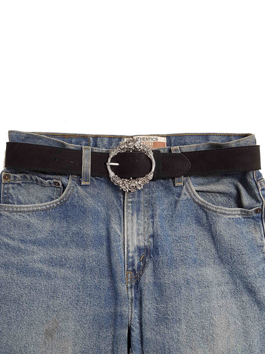 Genuine Suede Leather w. Floral Etched Buckle - Black