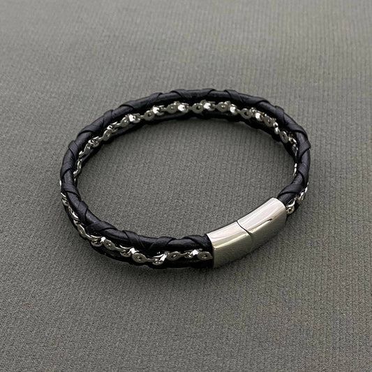 Men's Stainless Steel Chain PU Leather Woven Bracelet