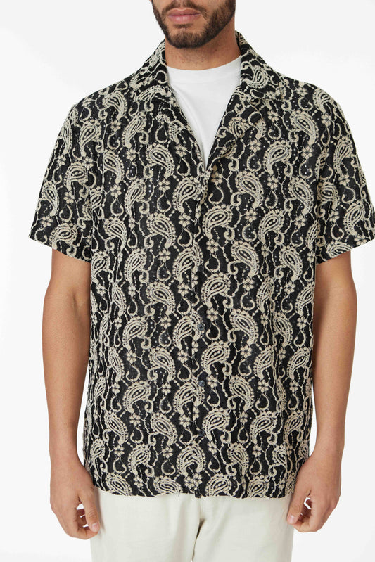 Crochet/Textured Short Sleeve Men's Shirt - Black/Beige