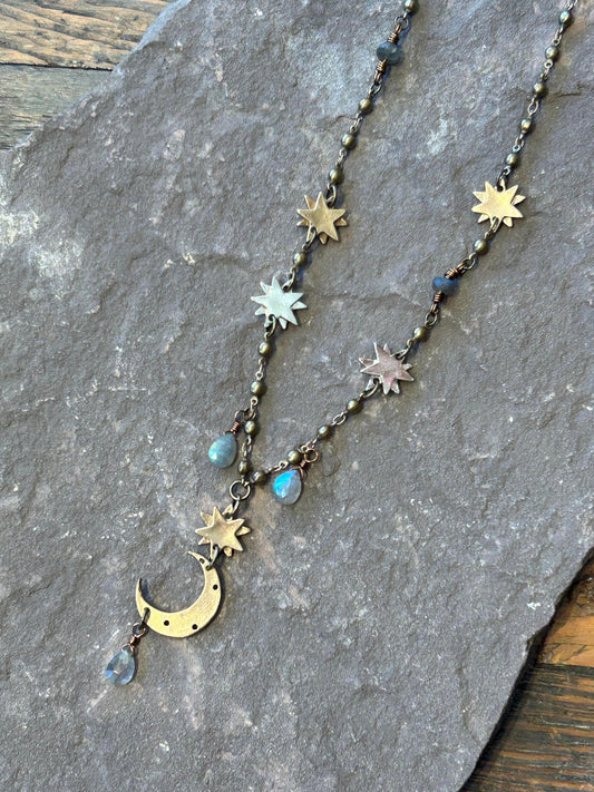 Catron Natural Gemstone Spike Necklace with Crystal Spacers - Labradorite