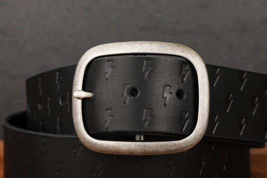 Black Leather Belt with Embossed Lightning Bolts and Antique Silver Buckle