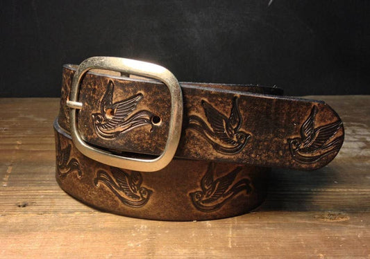 Embossed Sparrow Swallow Bird Vintage Aged Leather Belt in Black & Brown - Antique Brass