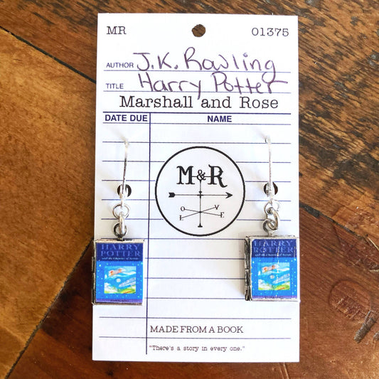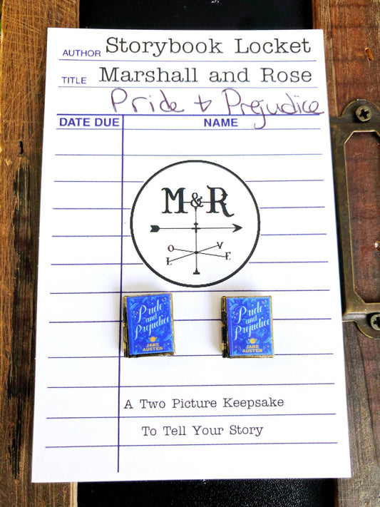 Post Earrings Book Locket Pride and Prejudice- Blue Filagree