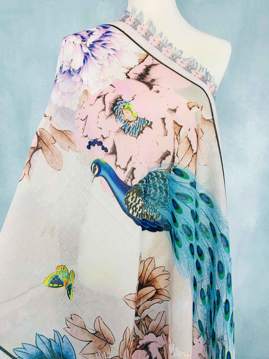 Pink-Teal Peacock & Peoney Frayed-Edge Scarf/Shawl
