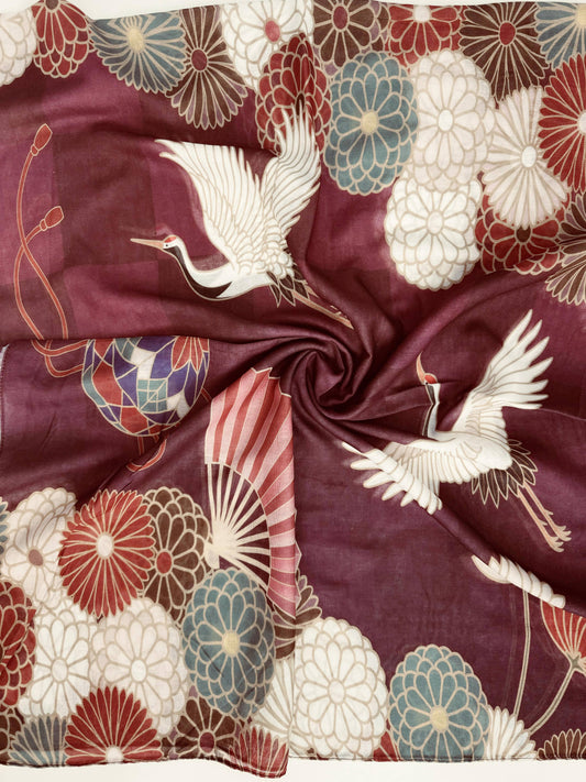 Burgundy-Multi Crane & Floral Scarf