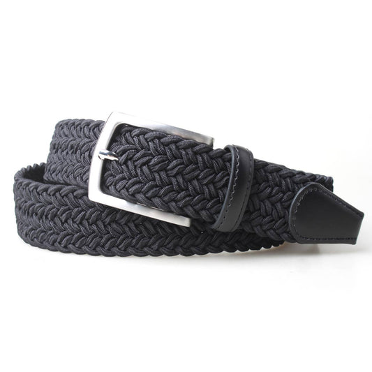 Mens Thick Braided Stretch Woven Fabric Belt w/ Leather Trim - Black