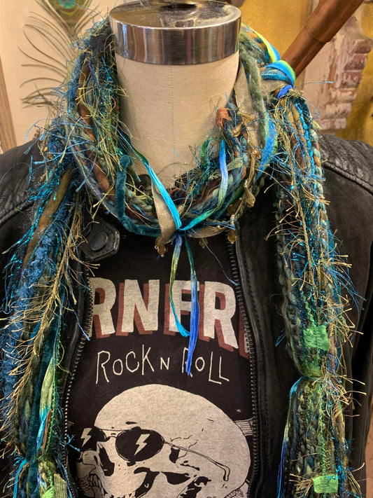 Ariel - Scarf in Turquoise, olive with hand dyed ribbon