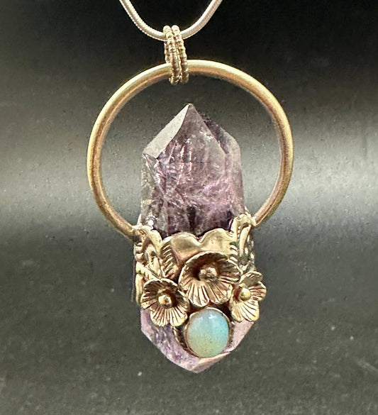 Amethyst double point pendant opal, handcrafted, white metal
