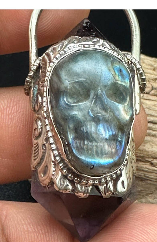Double point amethyst pendant, labradorite skull, handcrafted