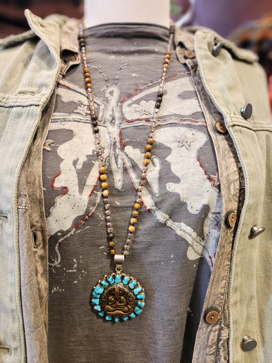 Turquoise and Quartz Dimensional Buddha Pendant with Yellow Quartz Beaded Chain