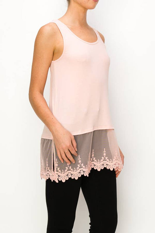 Soft Relaxed Tank With Delicate Floral Laced Hem - Pink