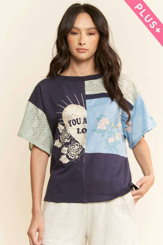 Plus Patchwork Multi Bodice Short Sleeve Top - Navy