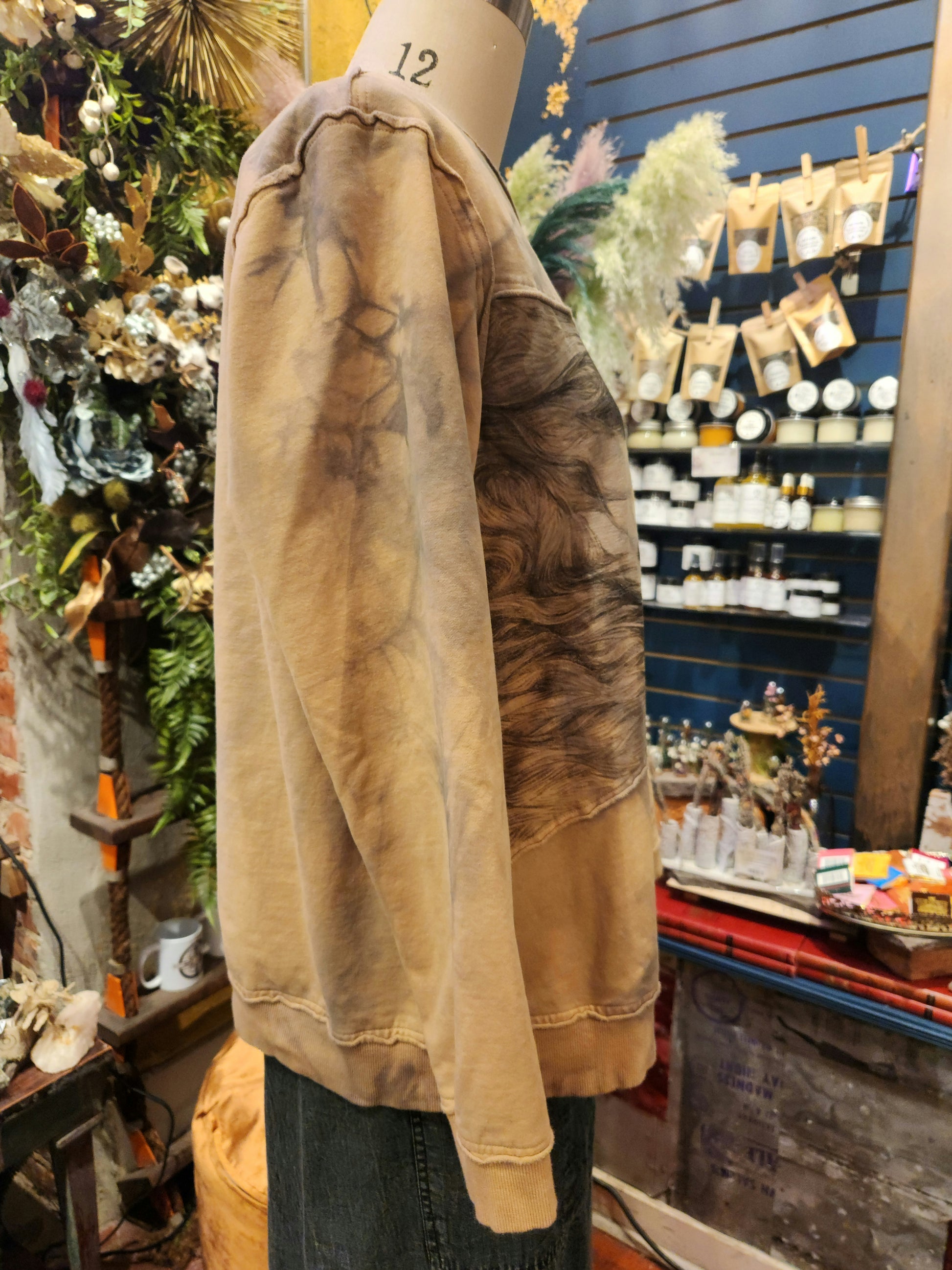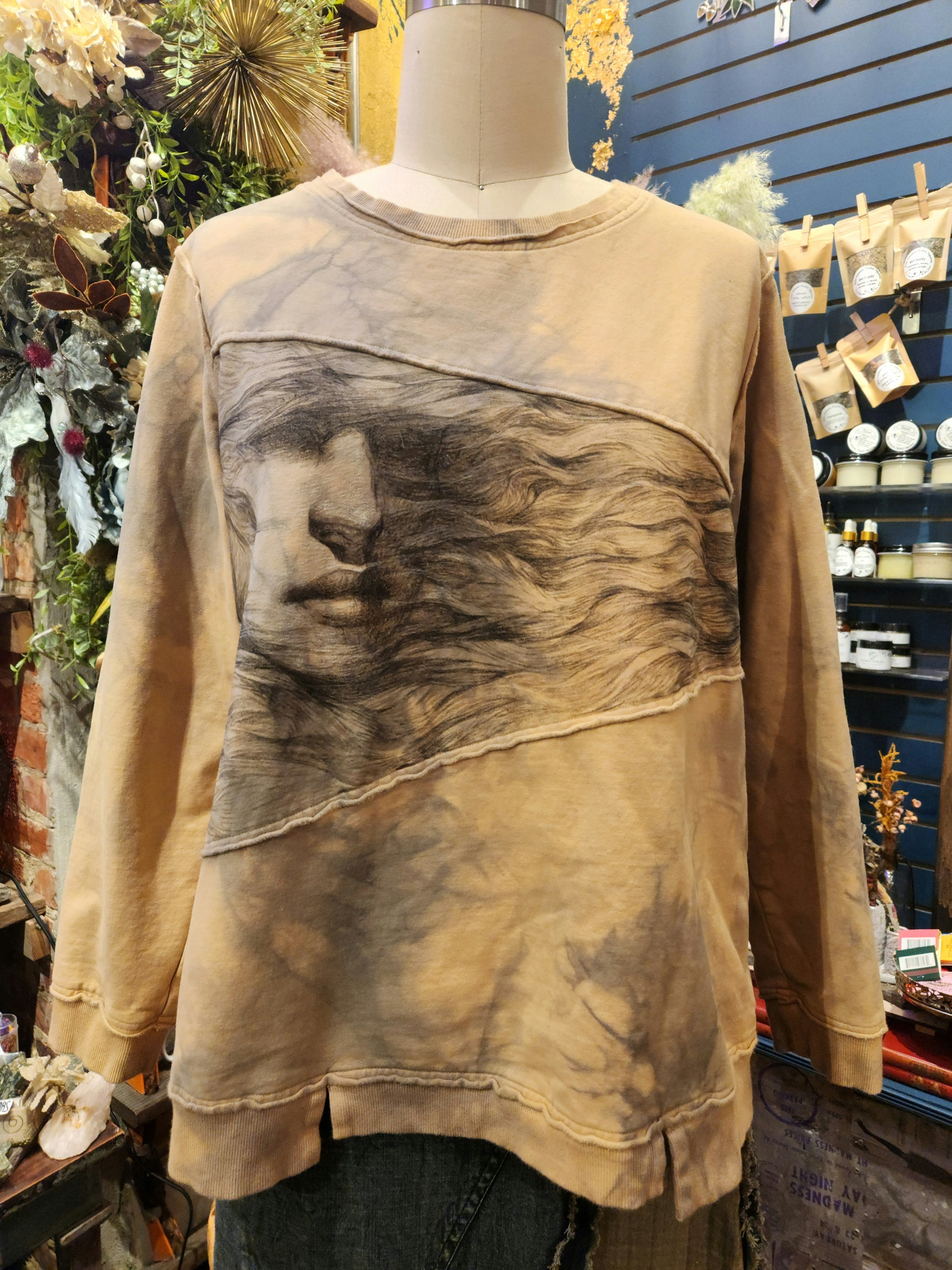Hand dyed crewneck adorned with an original face painting on the front of the garment.