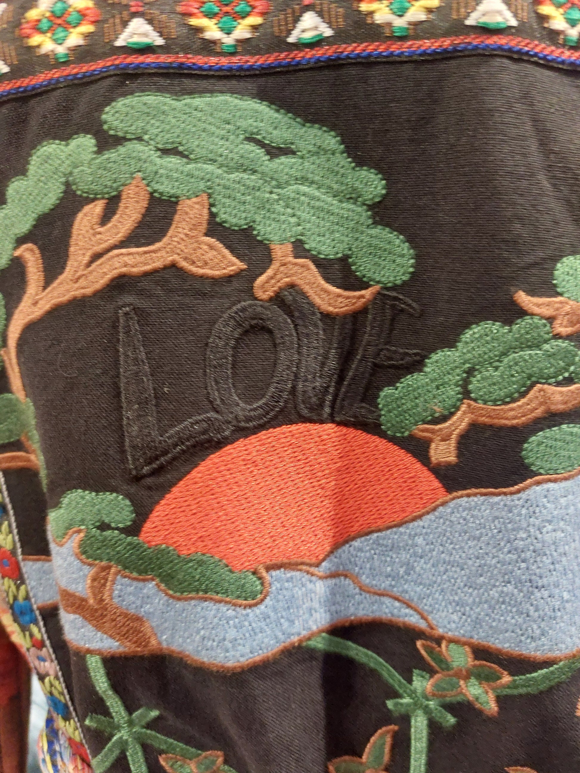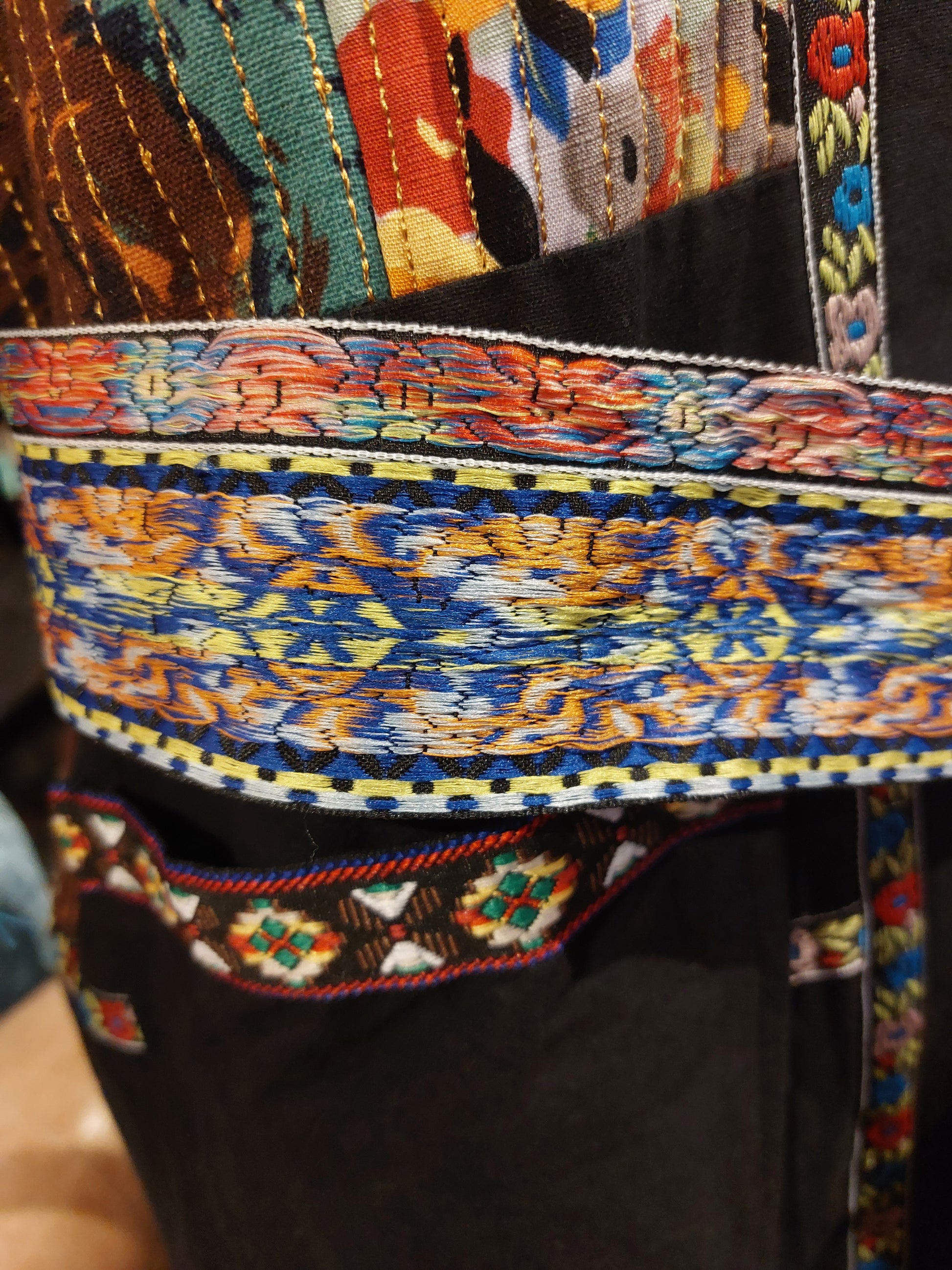 Patchwork belted mixed media jacket. 100% cotton shell. 100% cotton lining