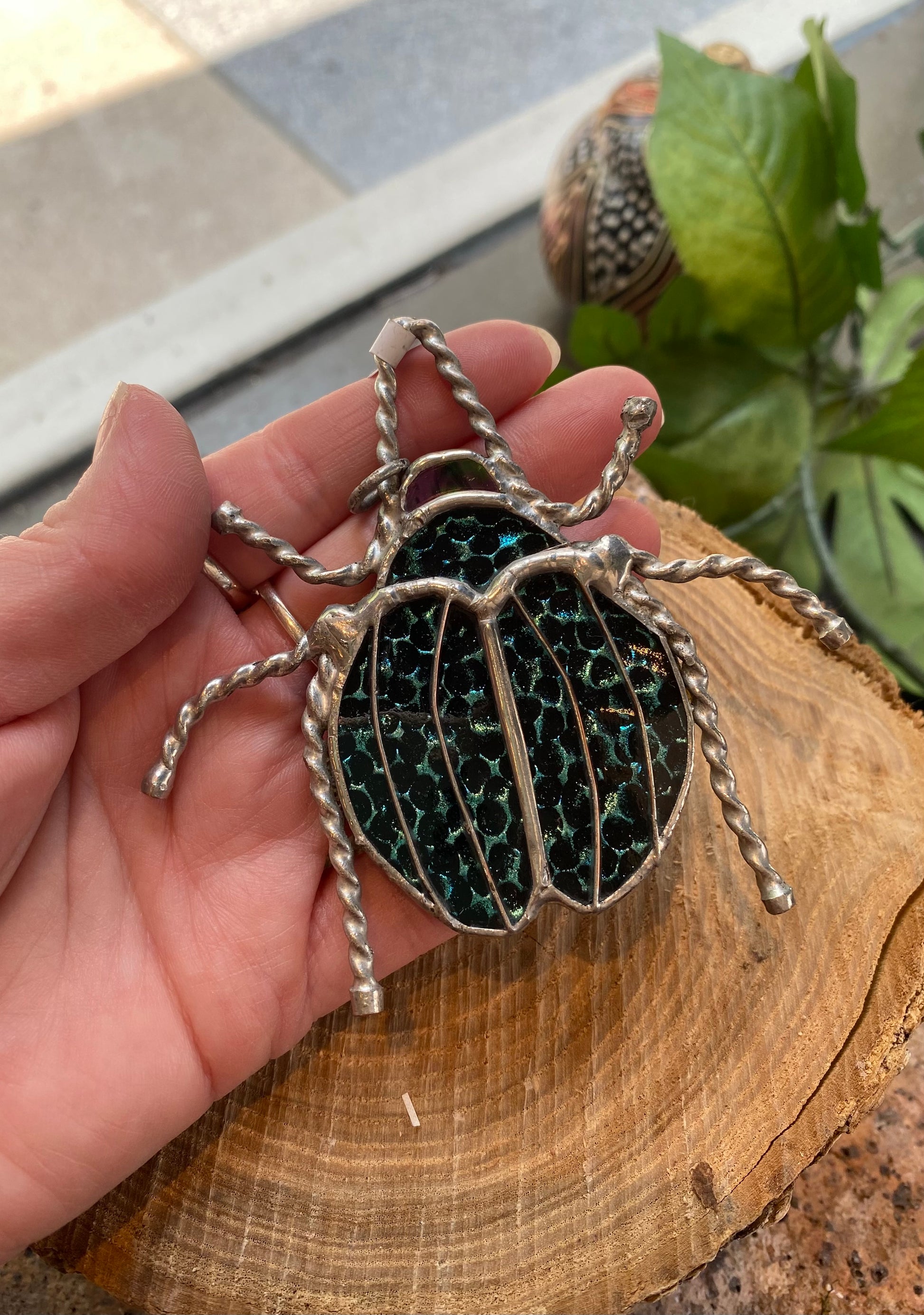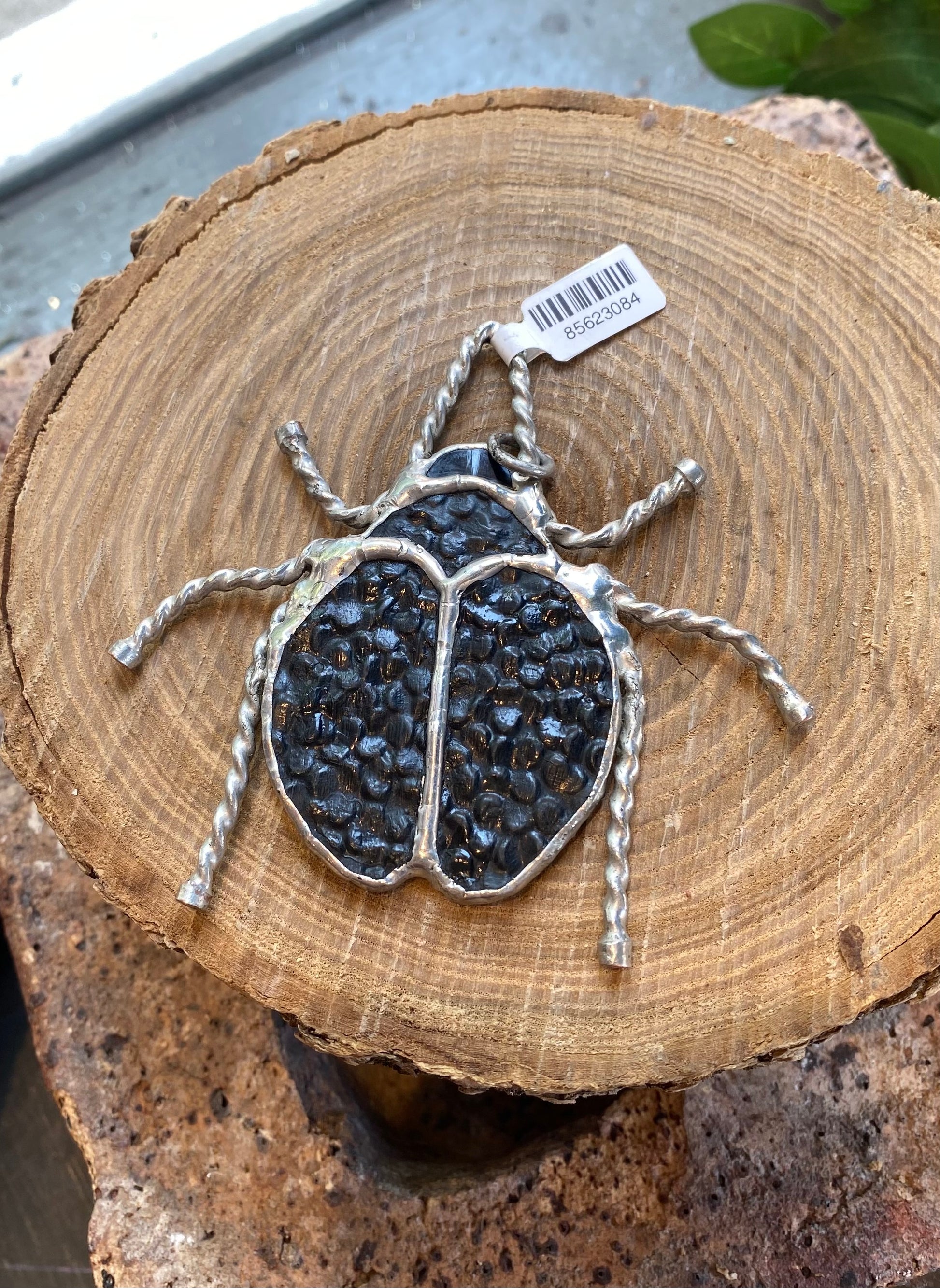 Blue Beetle Van Gogh glass pendant, approximately 4 in (l) x 4 in (w). Hypoallergenic stainless steel findings, and lead-free solder.ย