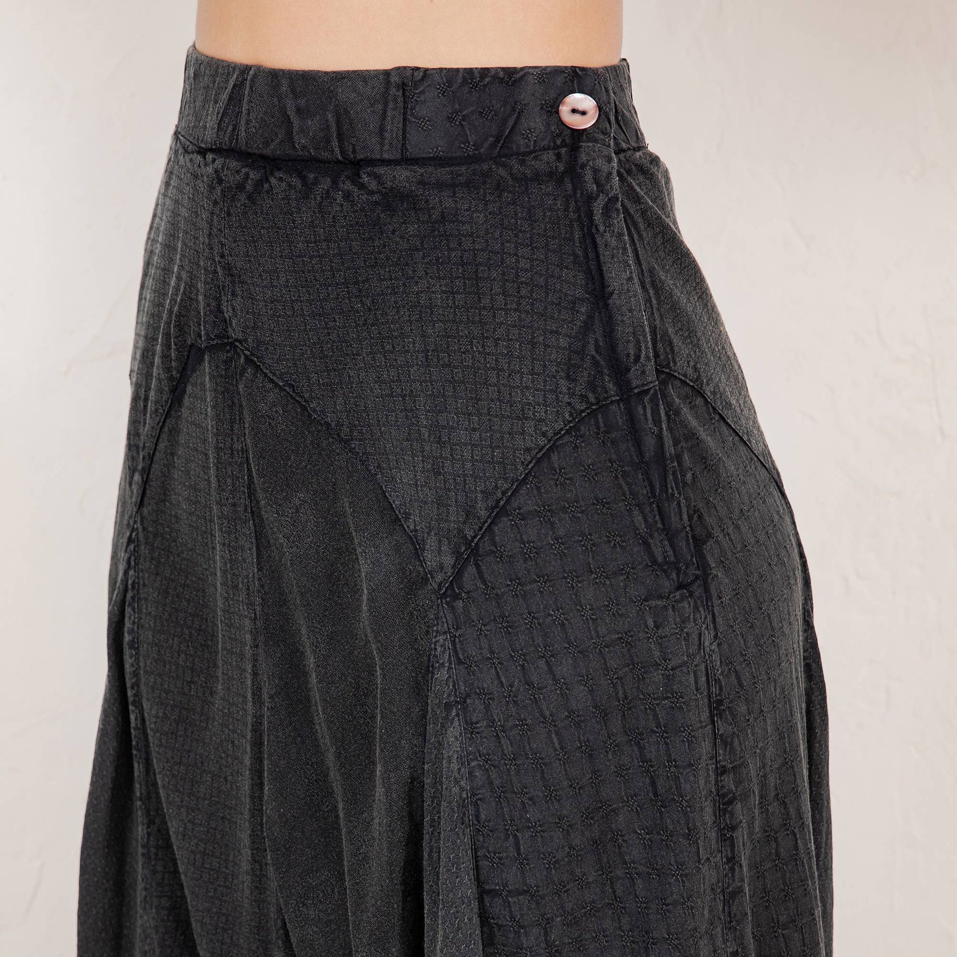 Boho Fall collection mid-length skirt. Captivating design with asymmetrical bias panels. Made from stonewashed rayon fabric for a vintage-inspired look. Delicate frill detailing adds whimsical touch. Crafted with meticulous attention to detail.