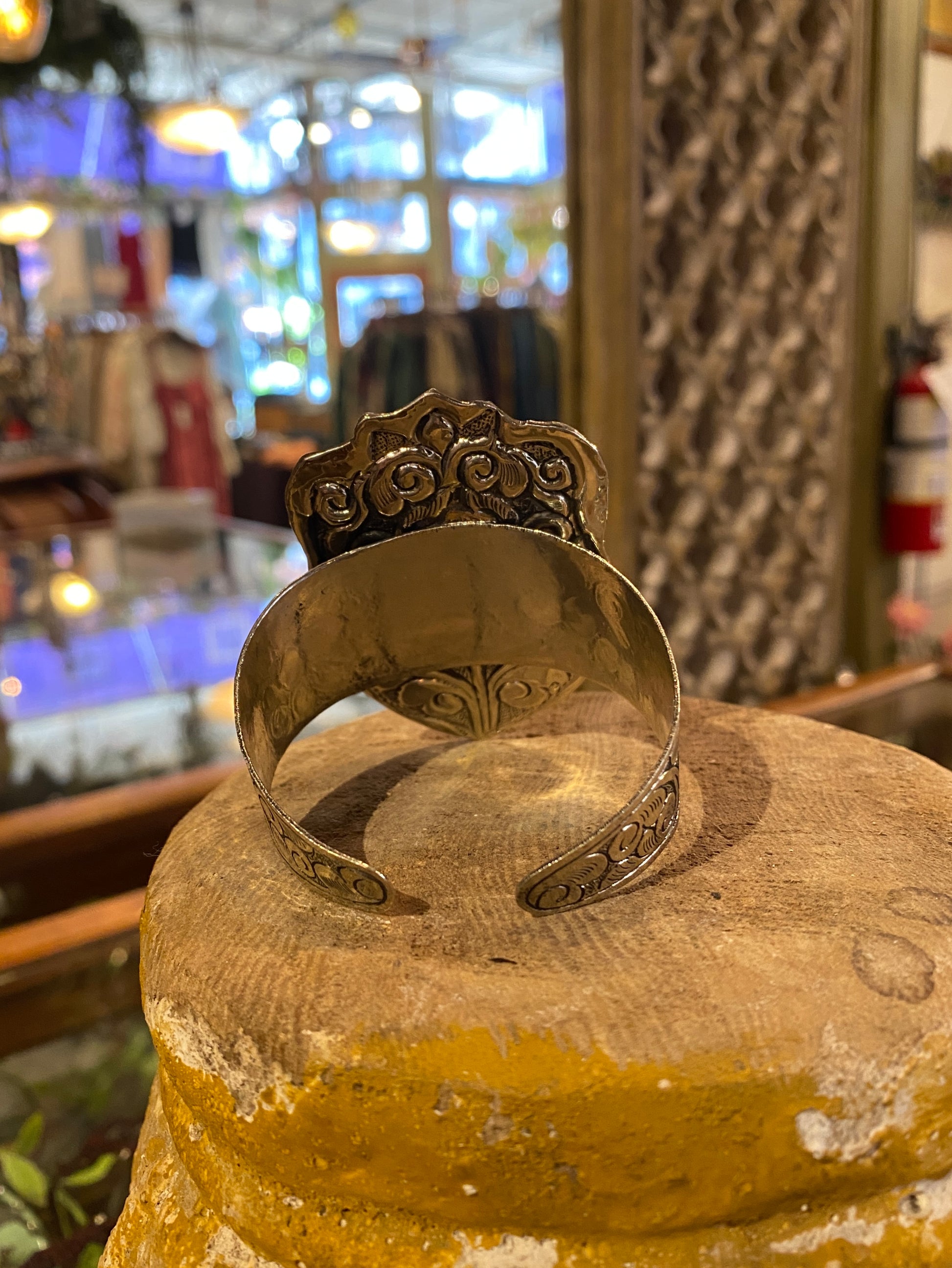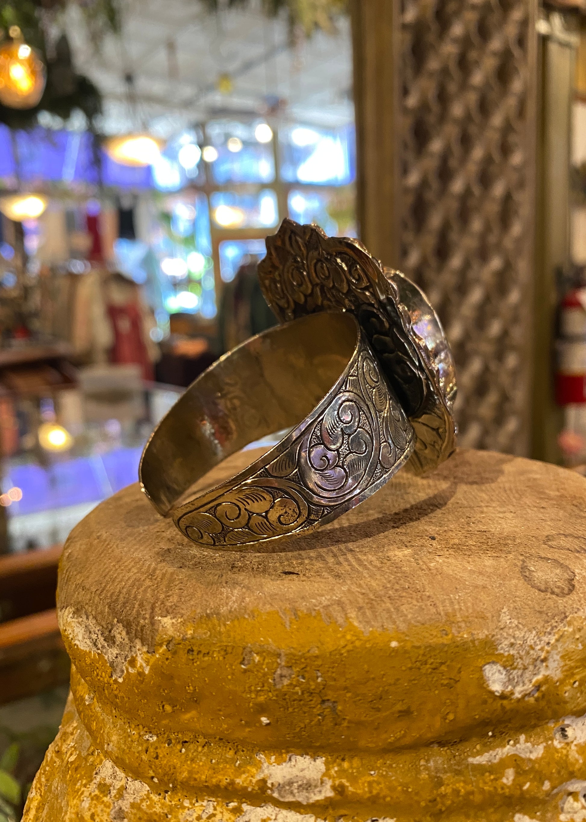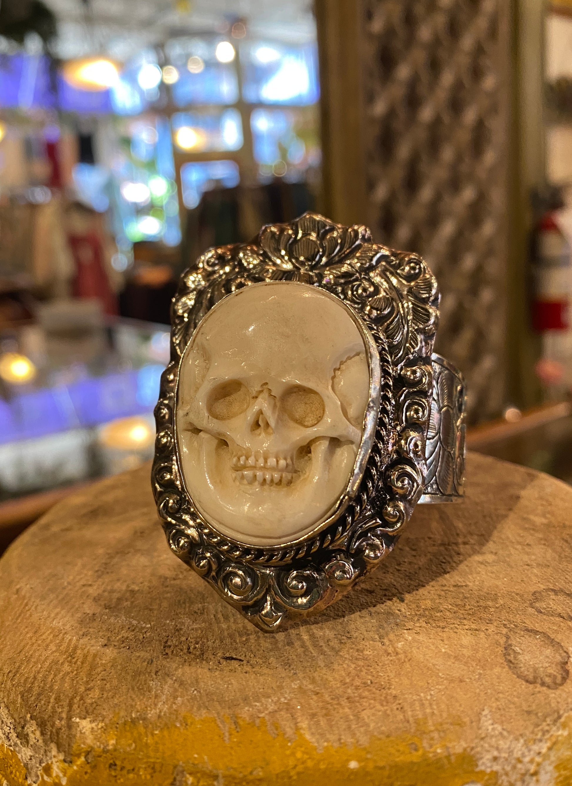 Embrace edgy elegance with this striking bone skull cuff bracelet by Tara Gasparian. Carved bone skull takes center stage, framed by meticulously stamped and detailed mixed metals in sterling silver, bronze, and brass. Crafted with nickel-free materials for comfortable all-day wear, this bold statement piece blends artisanal craftsmanship with alternative style. Perfect for those who dare to stand out.ย