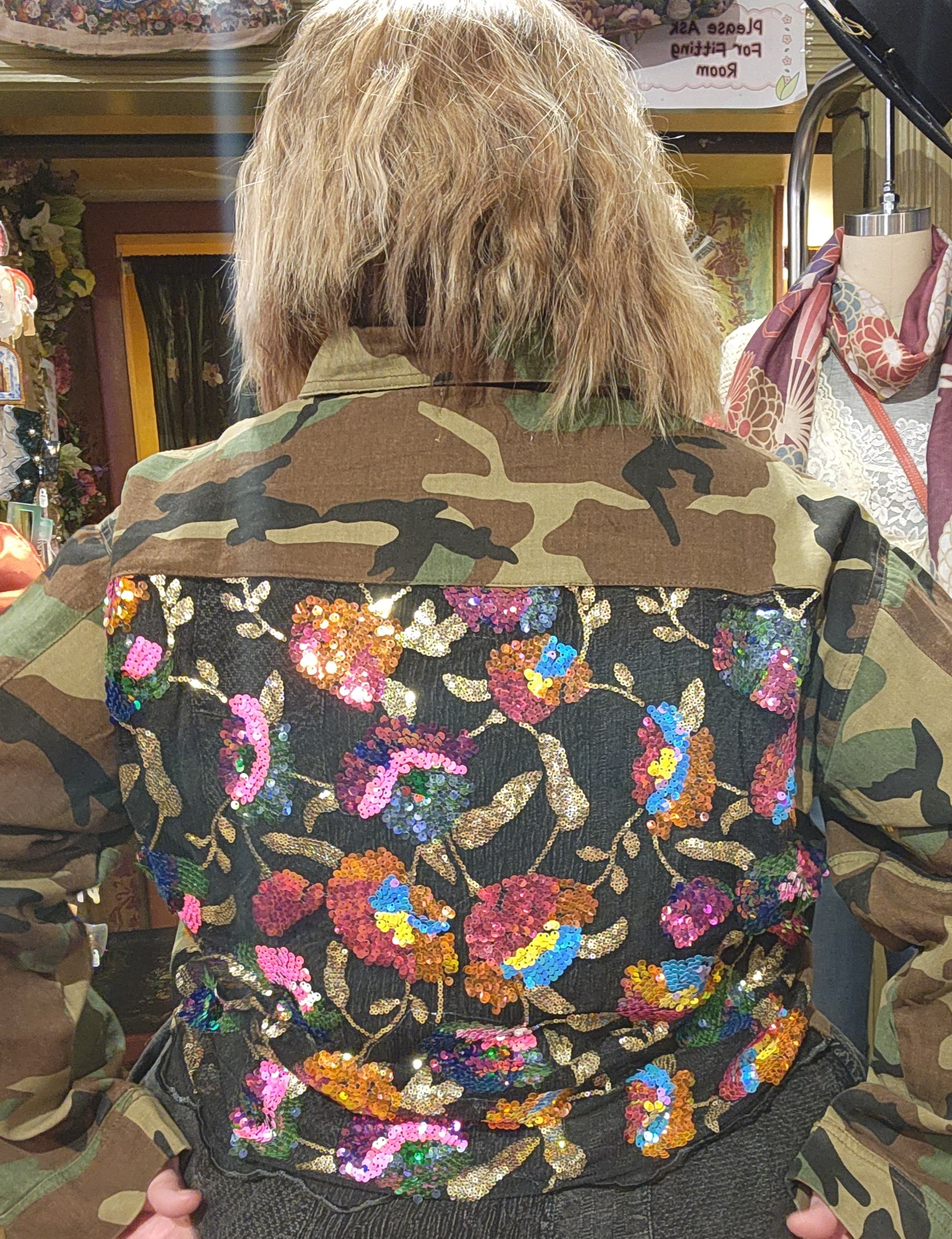 Make a bold statement with this eye-catching curve jacket. Featuring striking camo print throughout with sequin mesh back and pocket details, this piece delivers standout style for those who dare to be different. The sequin accents add shimmer and dimension, while the contrasting design elements create visual interest from every angle. Hand wash only to preserve the sequin embellishments and print quality. Embrace your unique style with confidence.