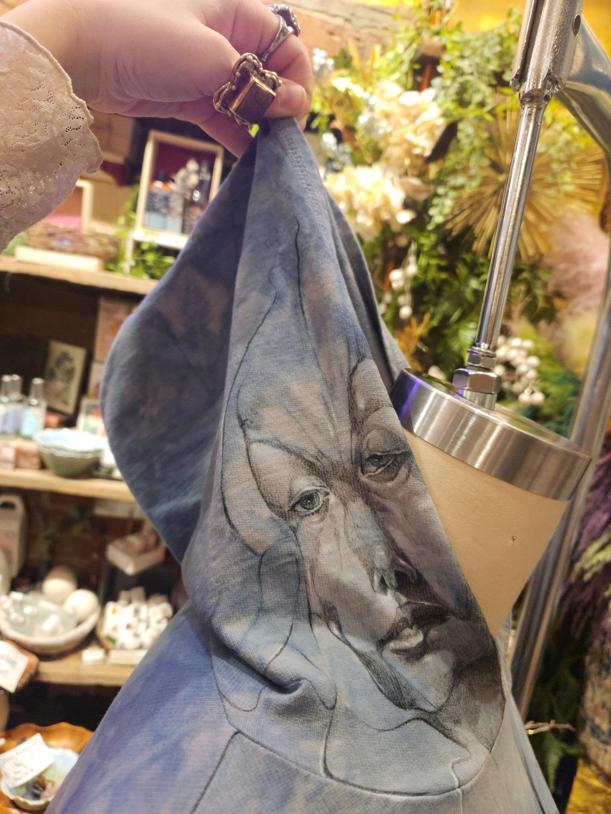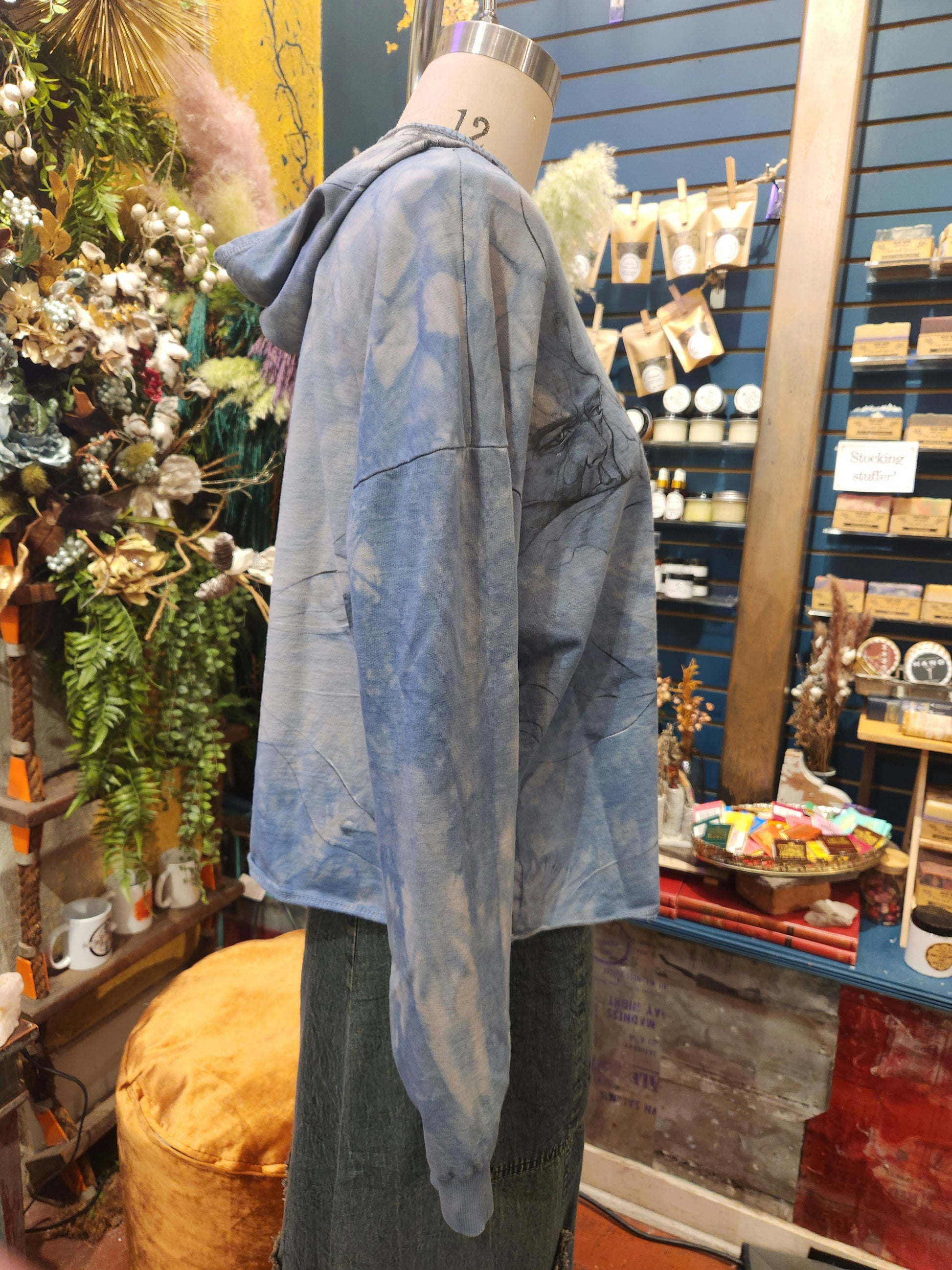 Hand dyed hoodie adorned with multiple original face paintings on the front and hood of the garment.