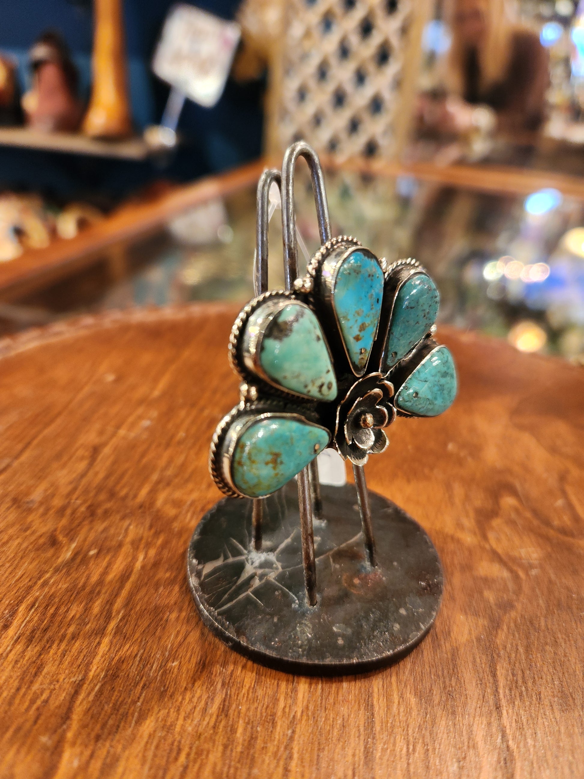 Tara Gasparian Chrysocolla Ring, featuring chrysocolla stone petals expanding from a metal floral center. Designs originate from vintage and antique pieces found through travel, then placed into bronze and silver plated ornate ring settings. Assembled in Tara Gasparian's San Diego Studio, this piece will become a statement favorite for your everyday wear.