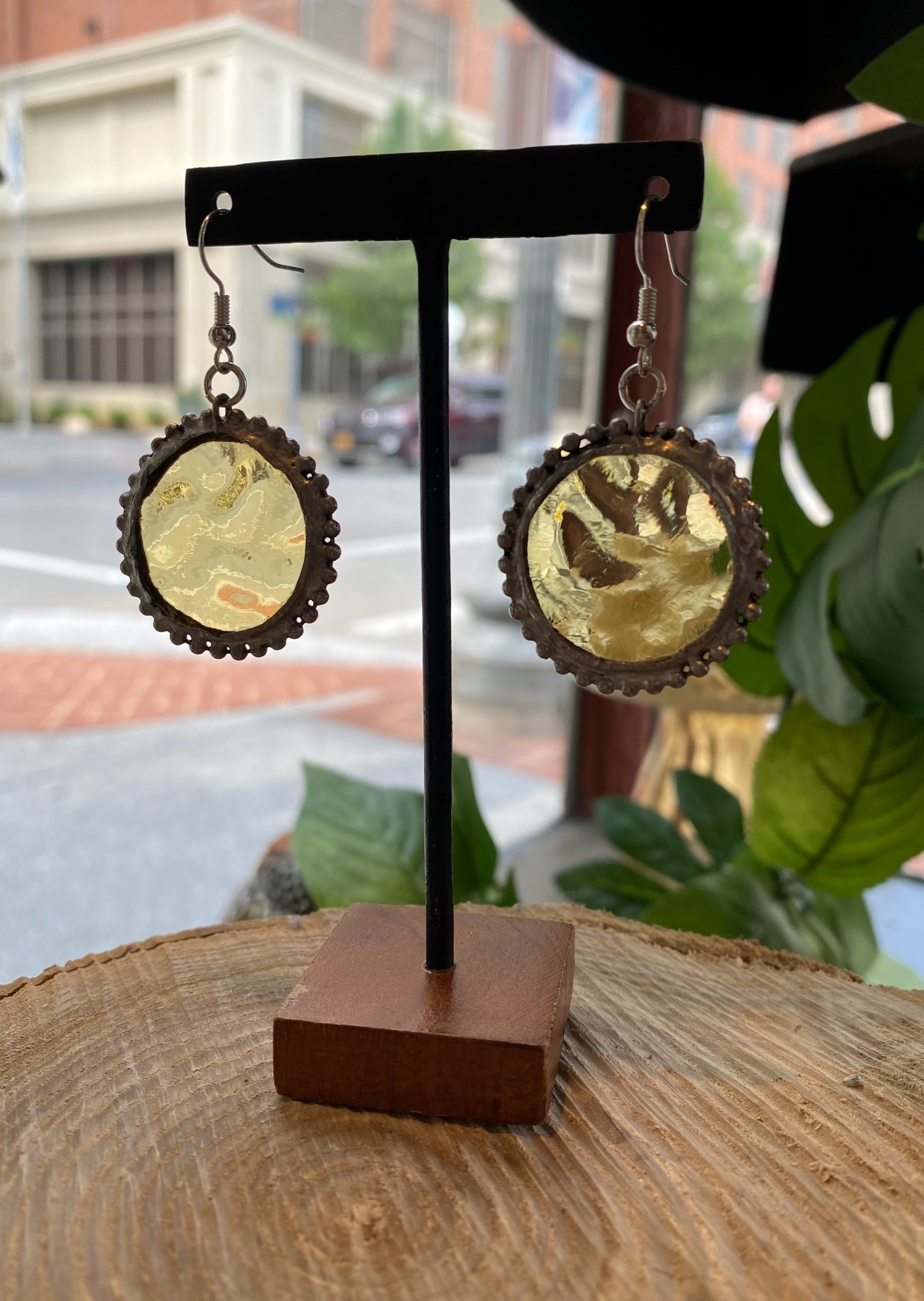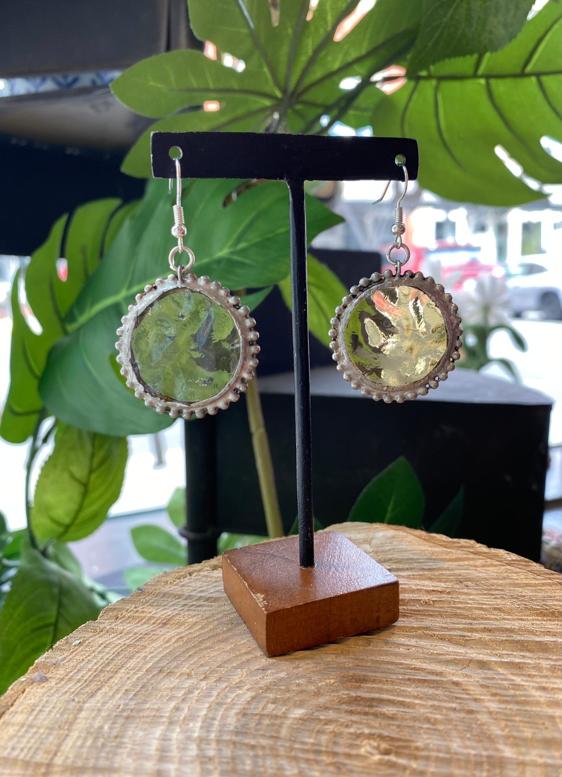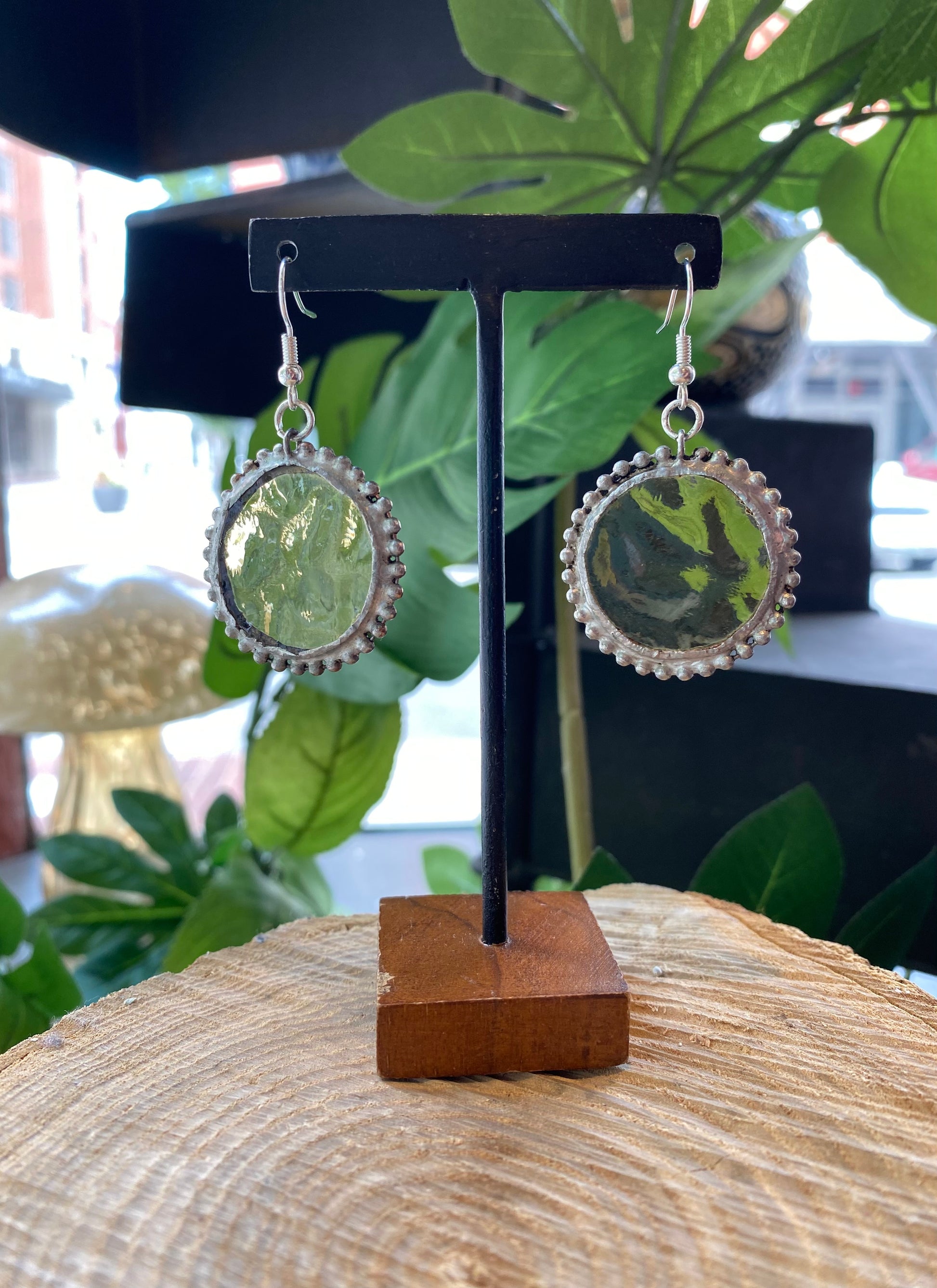 Glass circle earrings with beaded texture frame, approximately 1 in (l) x 1 in (w). Hypoallergenic stainless steel findings, and lead-free solder.ย