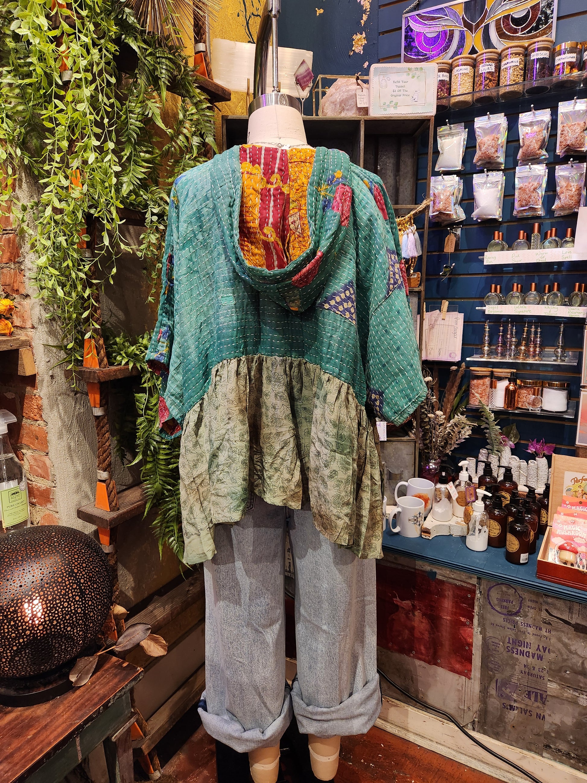 Your favorite throw on and go piece is made out of our vintage kantha embroidered sari with a crepe sari flounce. This poncho like silhouette is a flowy floaty dream.