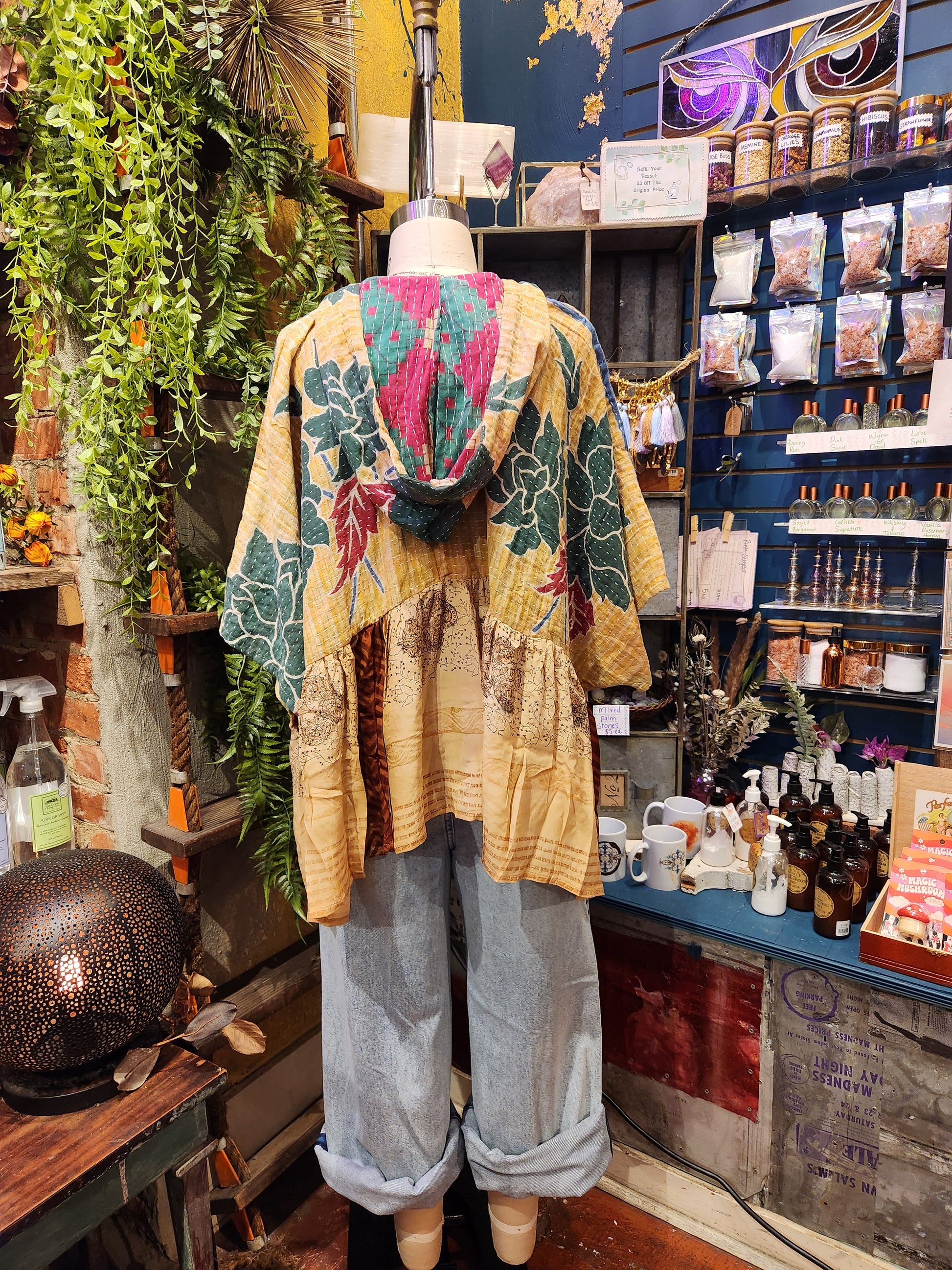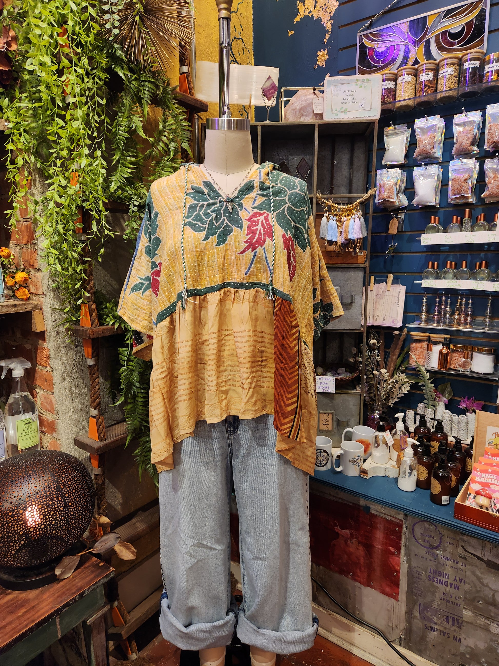 Your favorite throw on and go piece is made out of our vintage kantha embroidered sari with a crepe sari flounce. This poncho like silhouette is a flowy floaty dream.