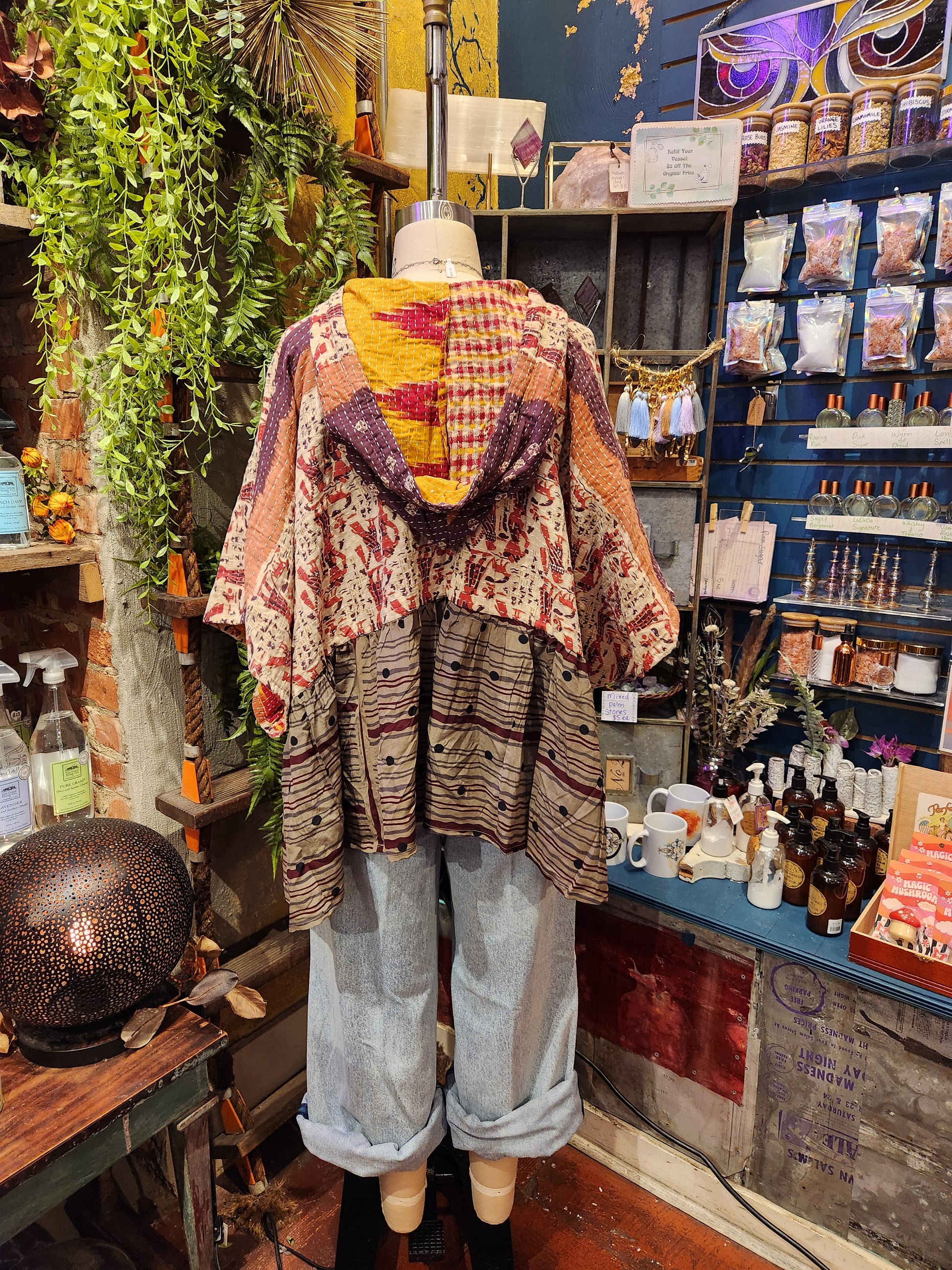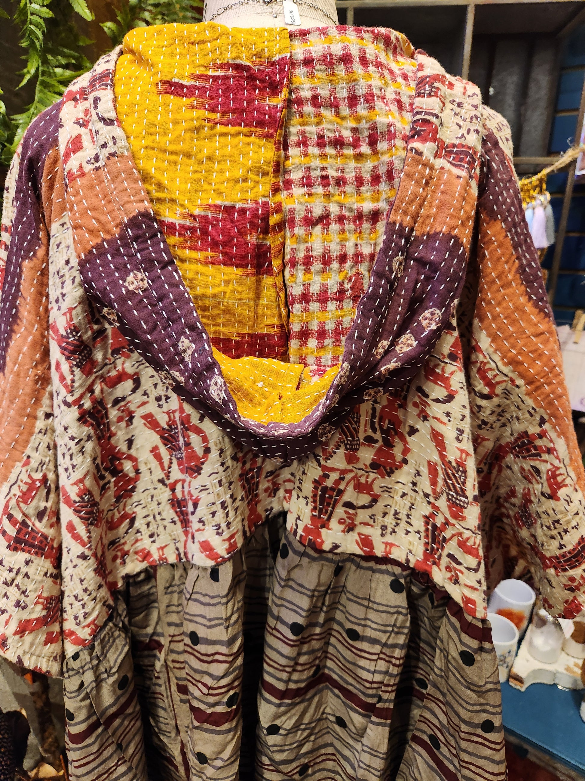 Your favorite throw on and go piece is made out of our vintage kantha embroidered sari with a crepe sari flounce. This poncho like silhouette is a flowy floaty dream.