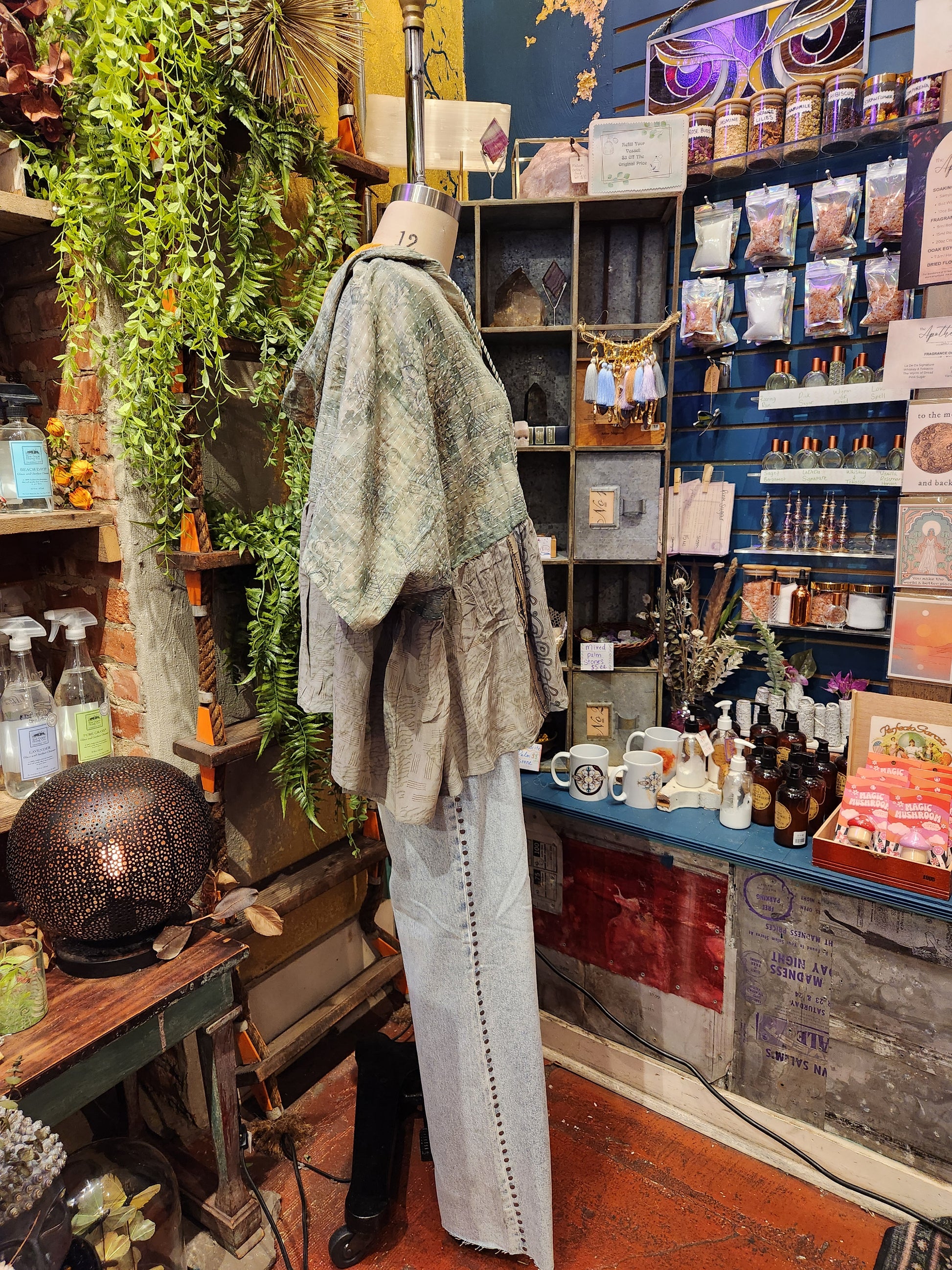 Your favorite throw on and go piece is made out of our vintage kantha embroidered sari with a crepe sari flounce. This poncho like silhouette is a flowy floaty dream.