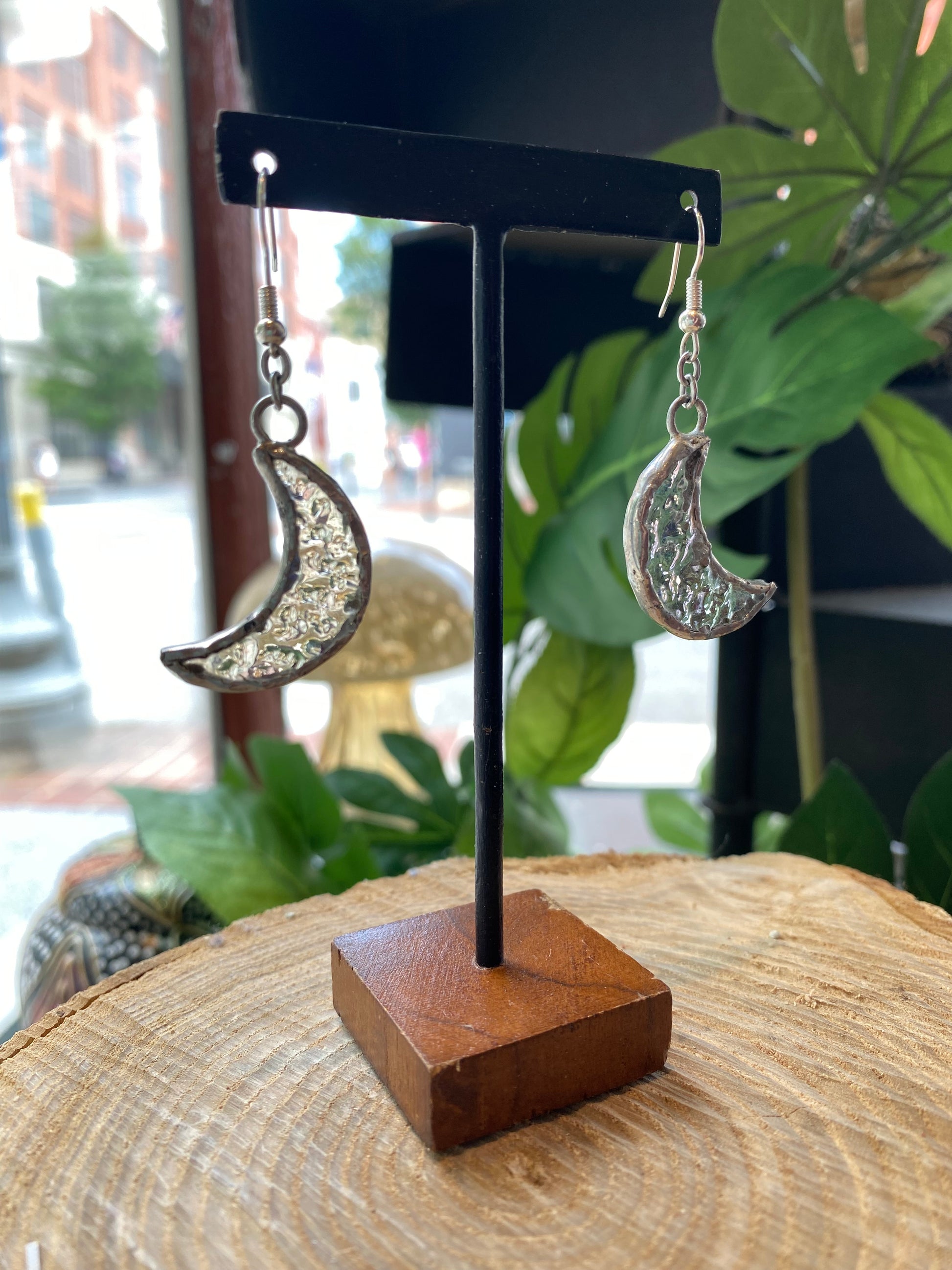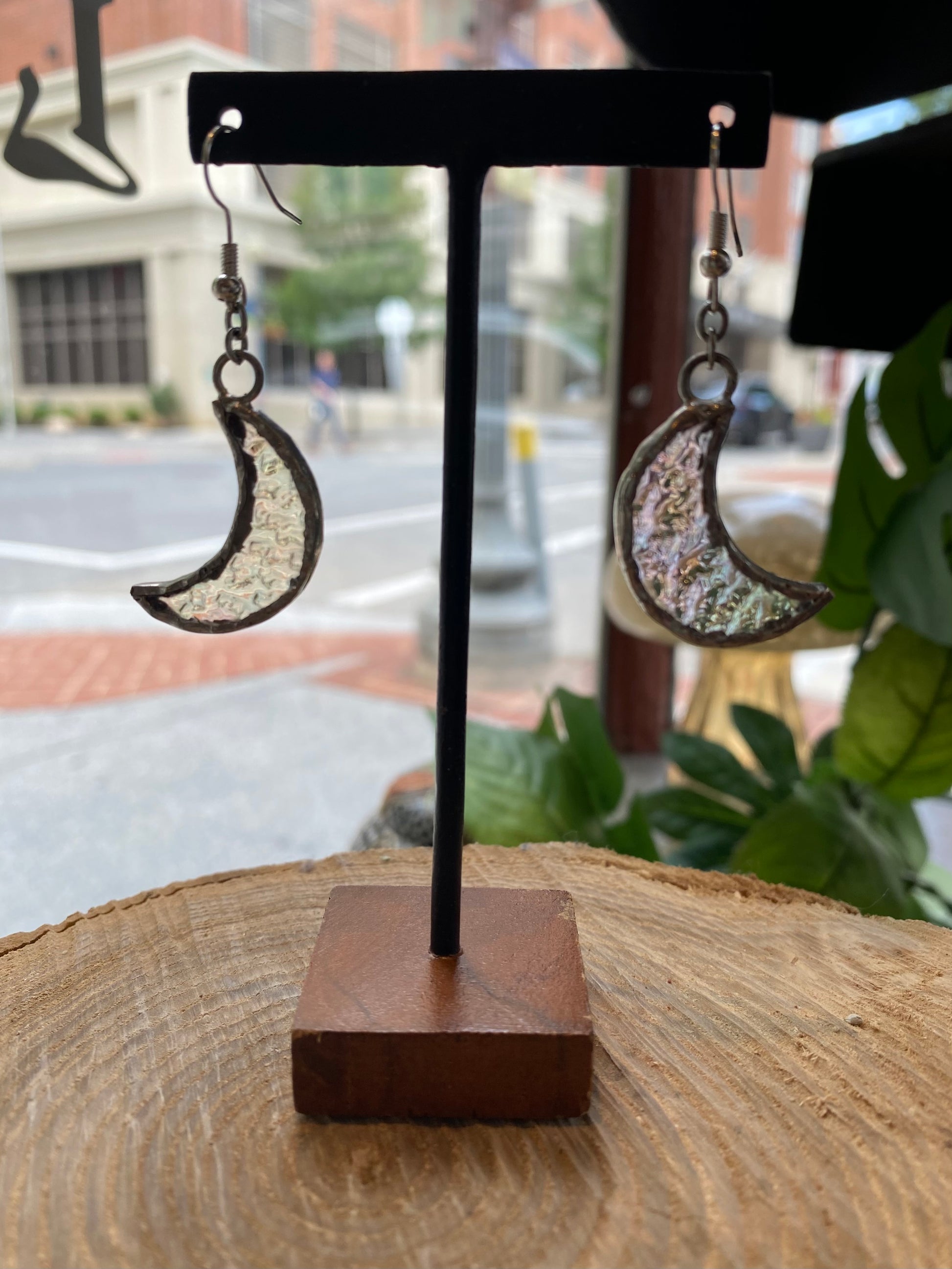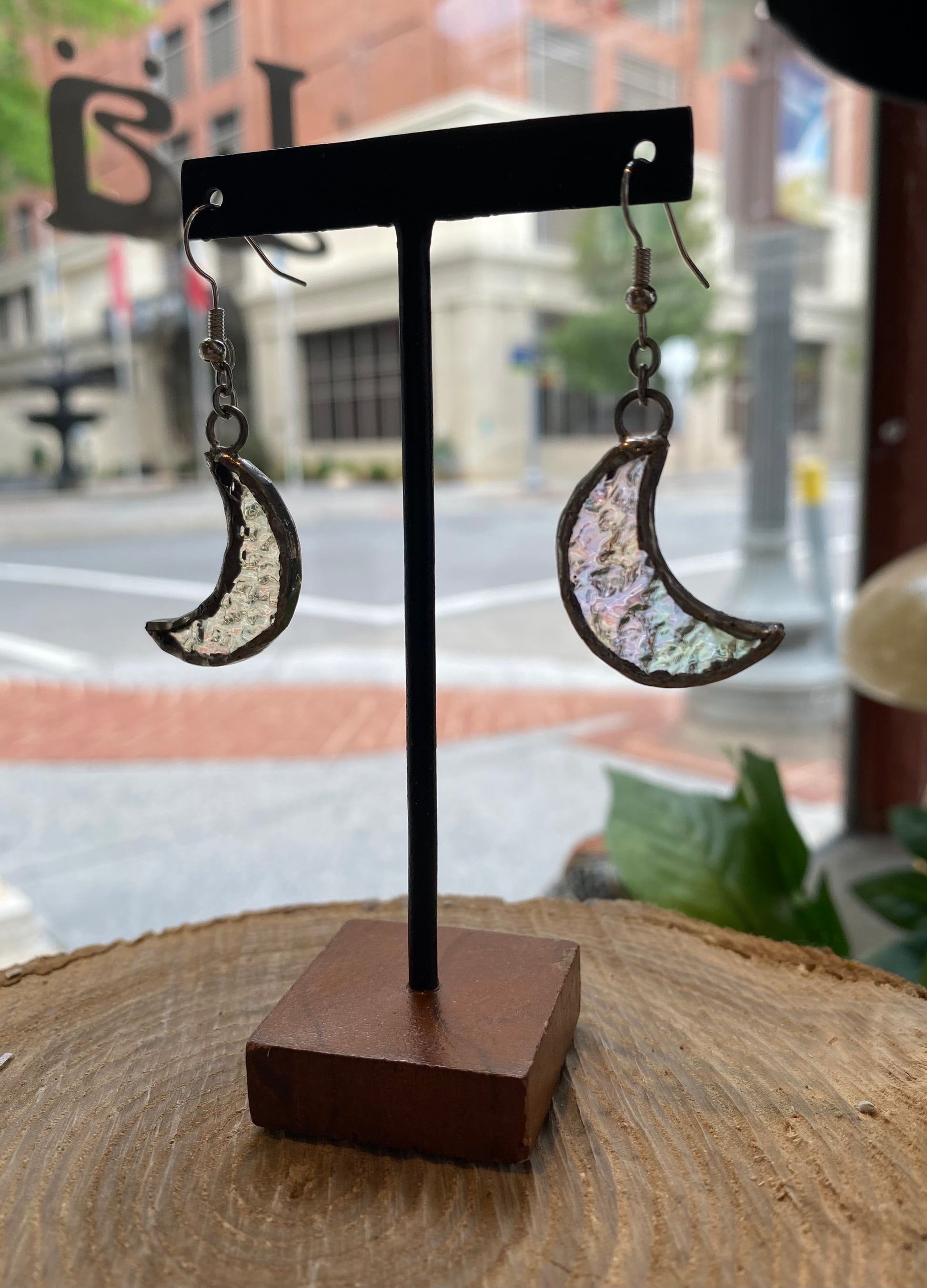 Glass crescent moon earrings, approximately 1 in (l) x 1 in (w). Hypoallergenic stainless steel findings, and lead-free solder.ย