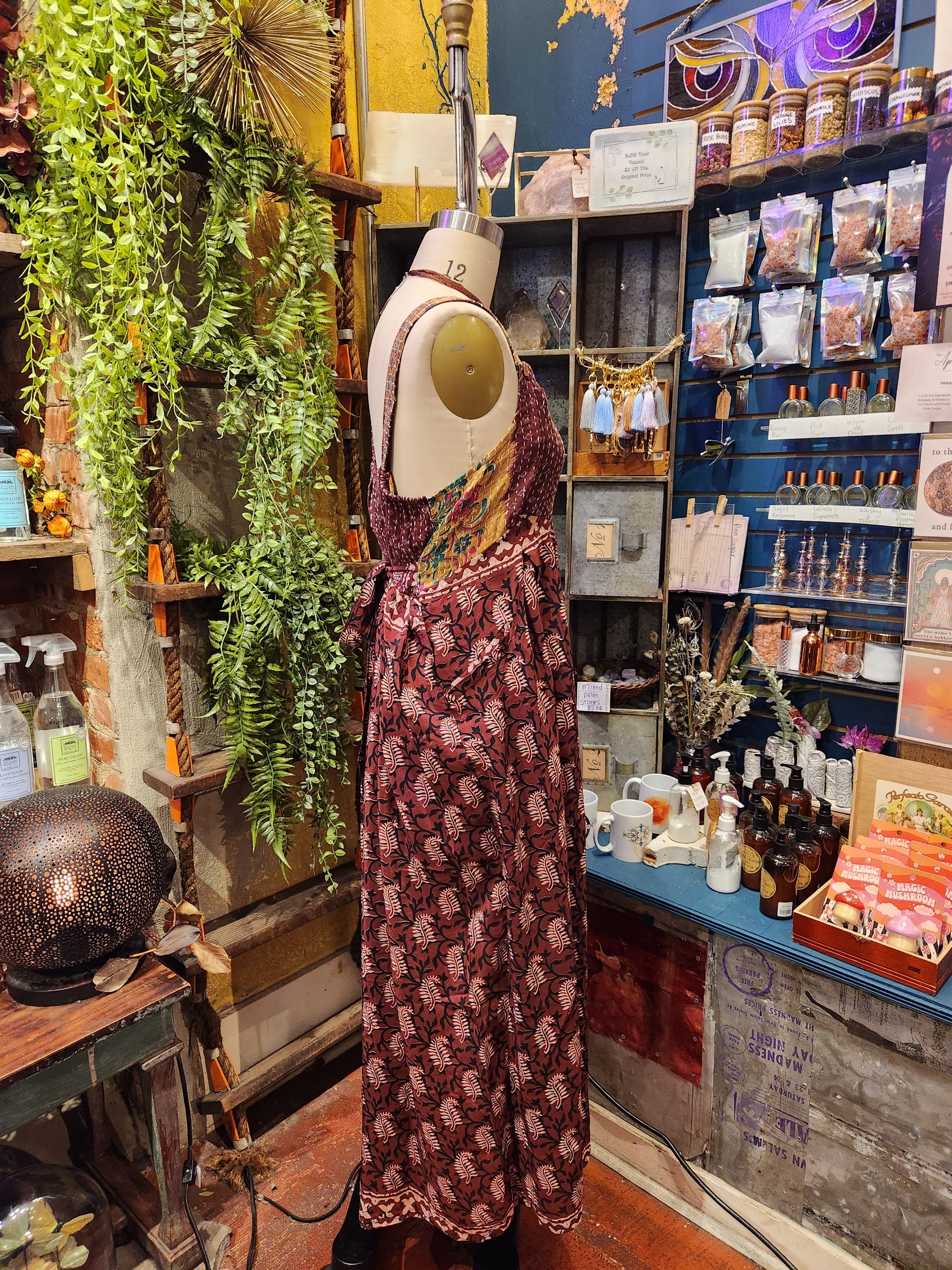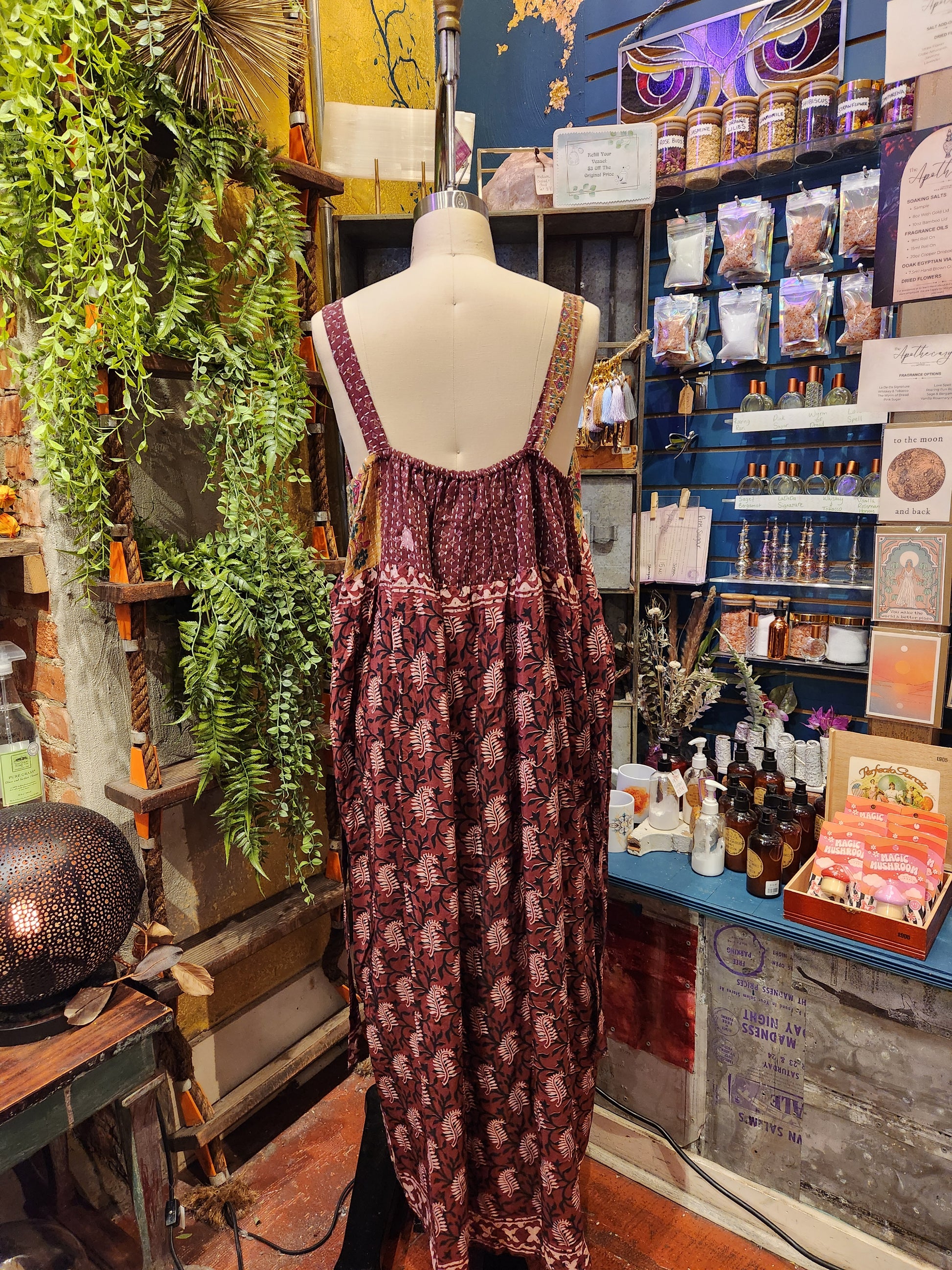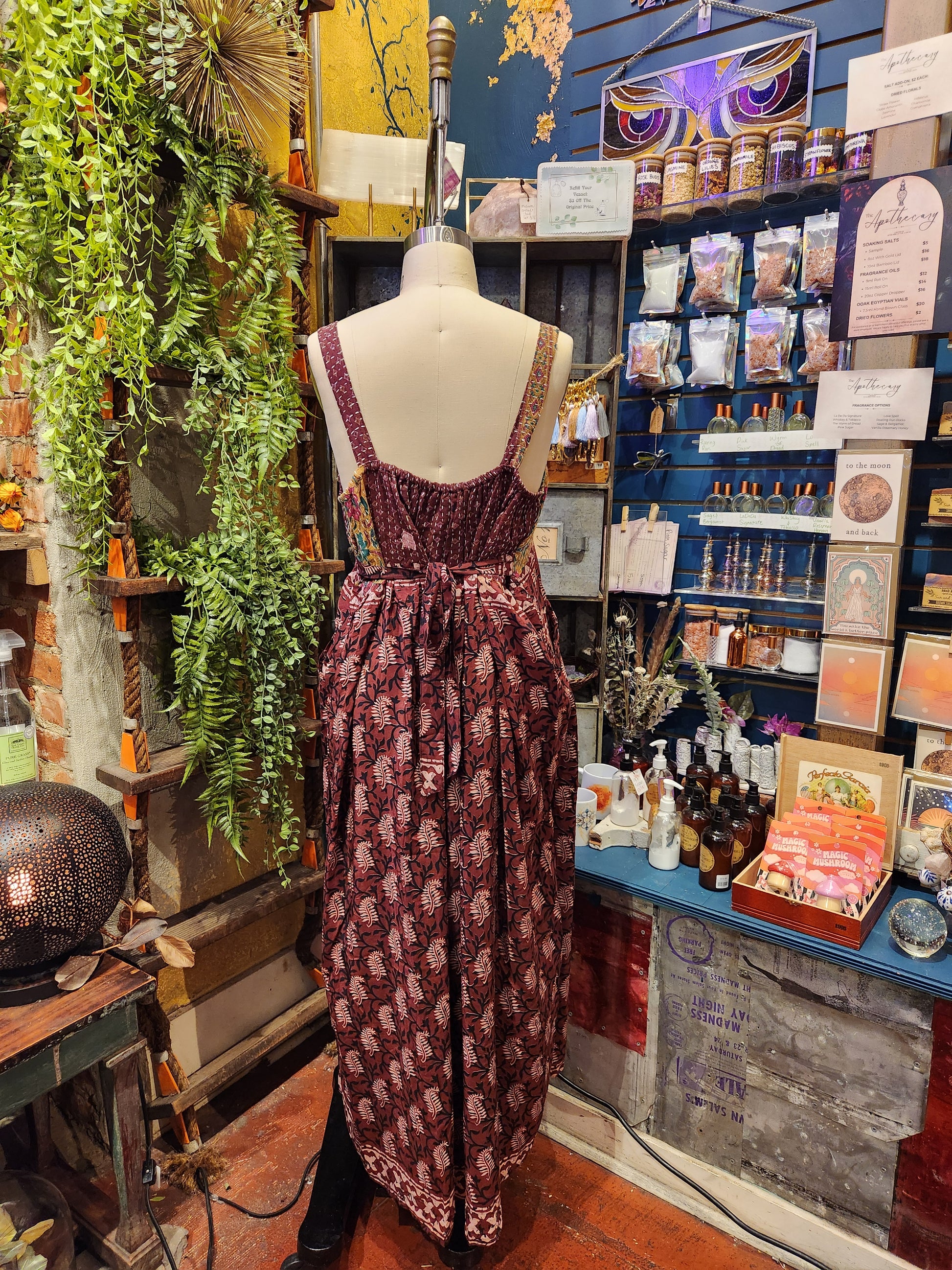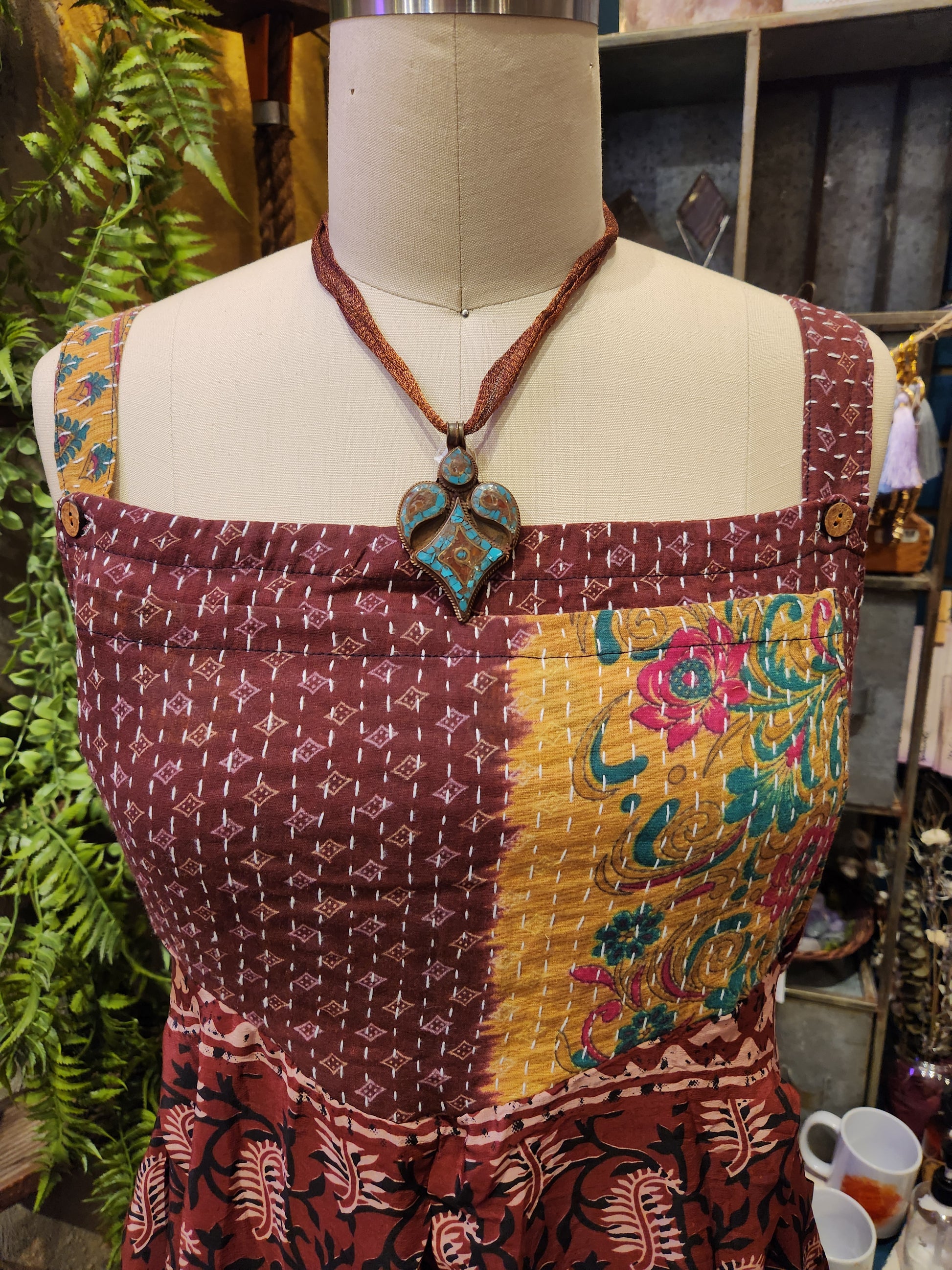 Perfect for EVERY season this overall dress features a kantha bib front with center pocket, adjustable button straps, tie back, crepe skirt and interior pockets on the skirt.