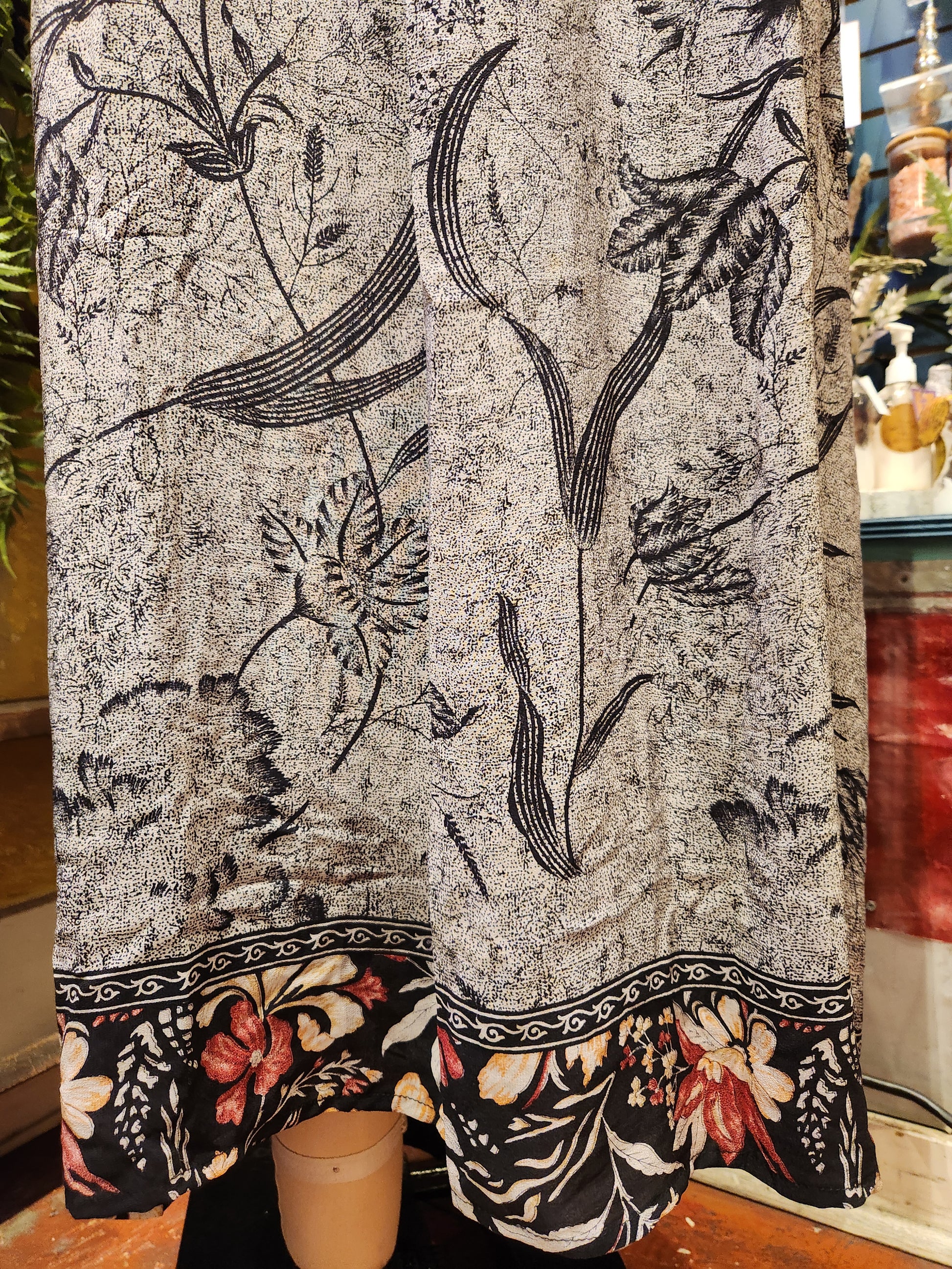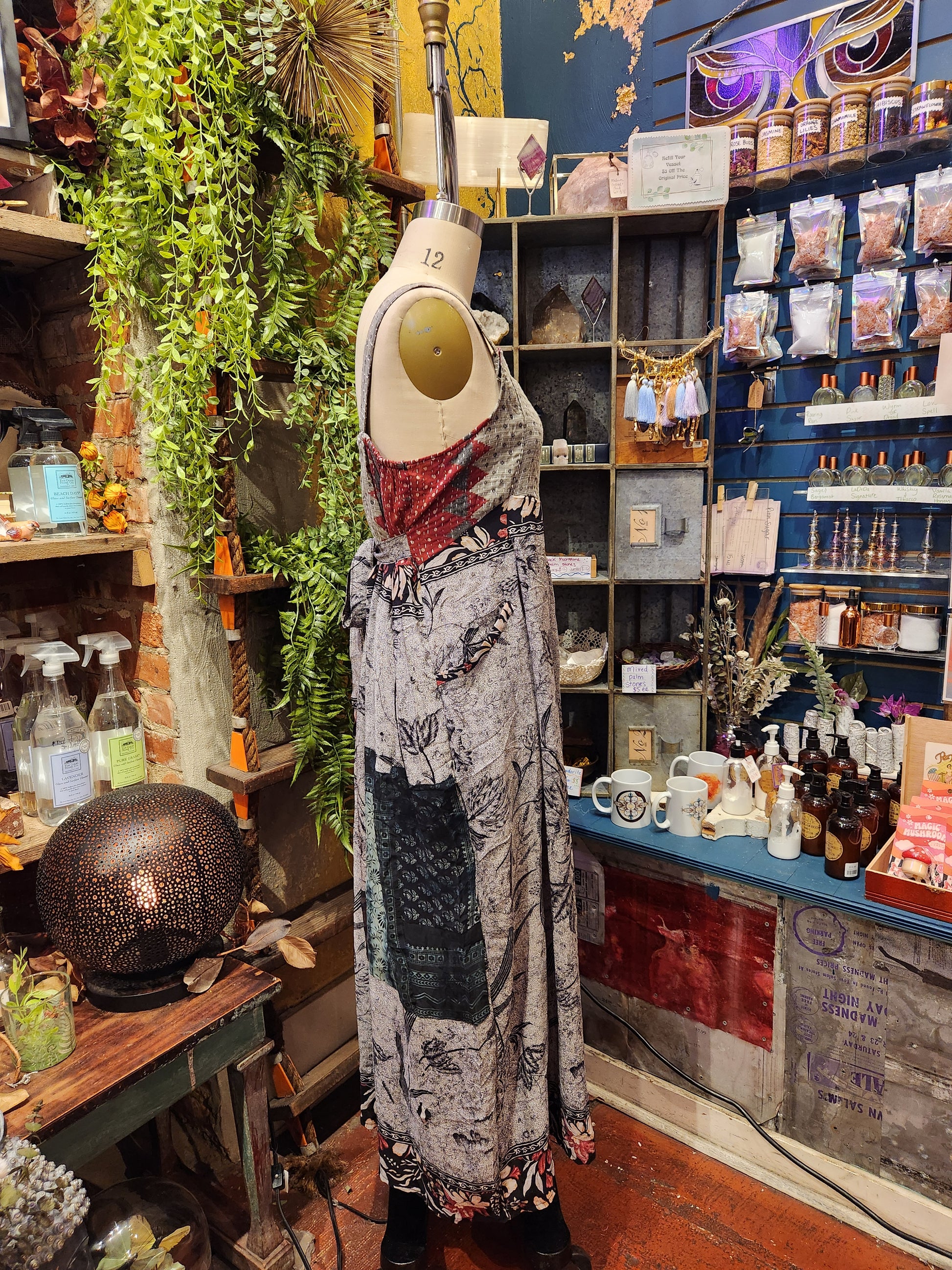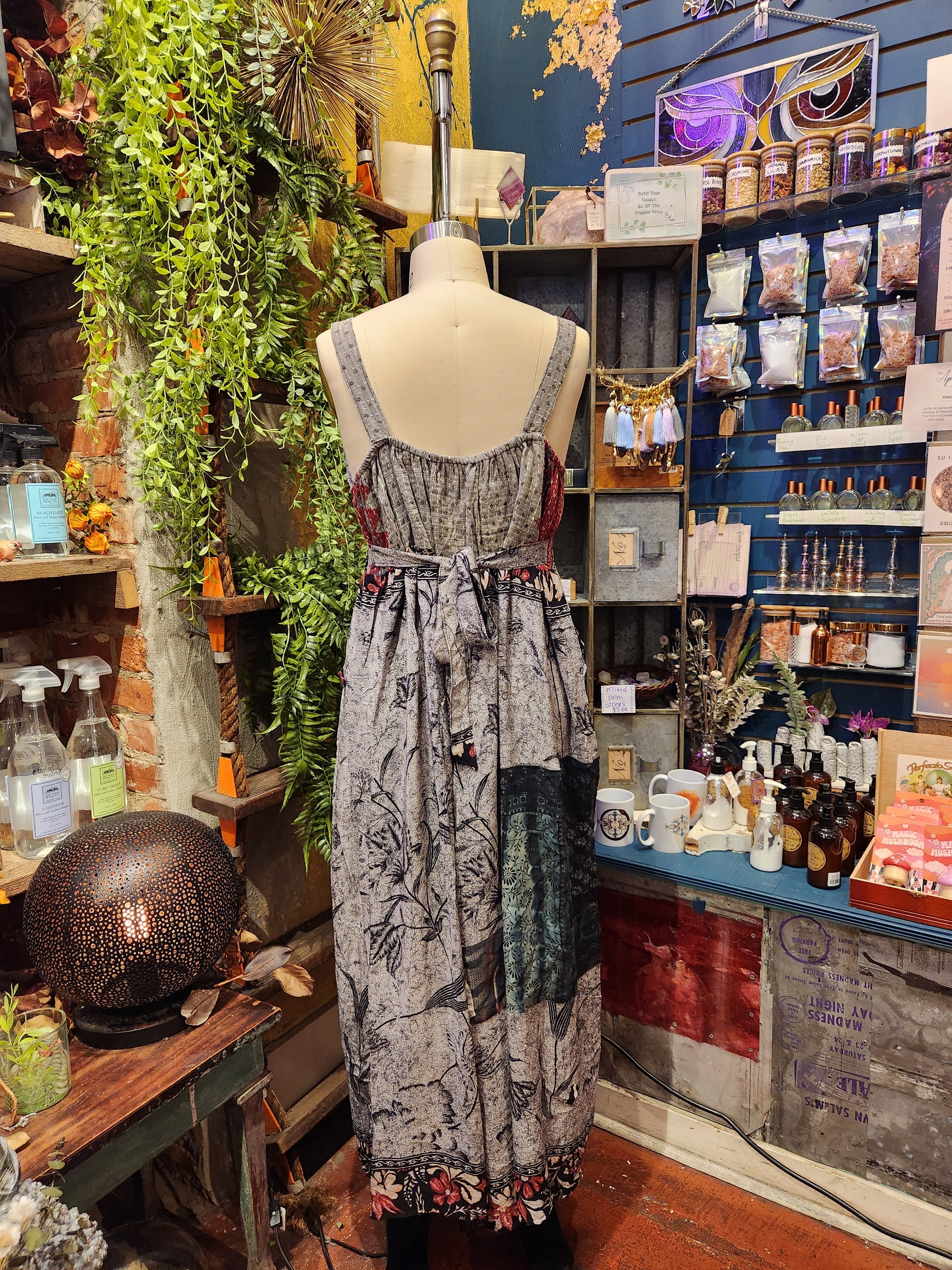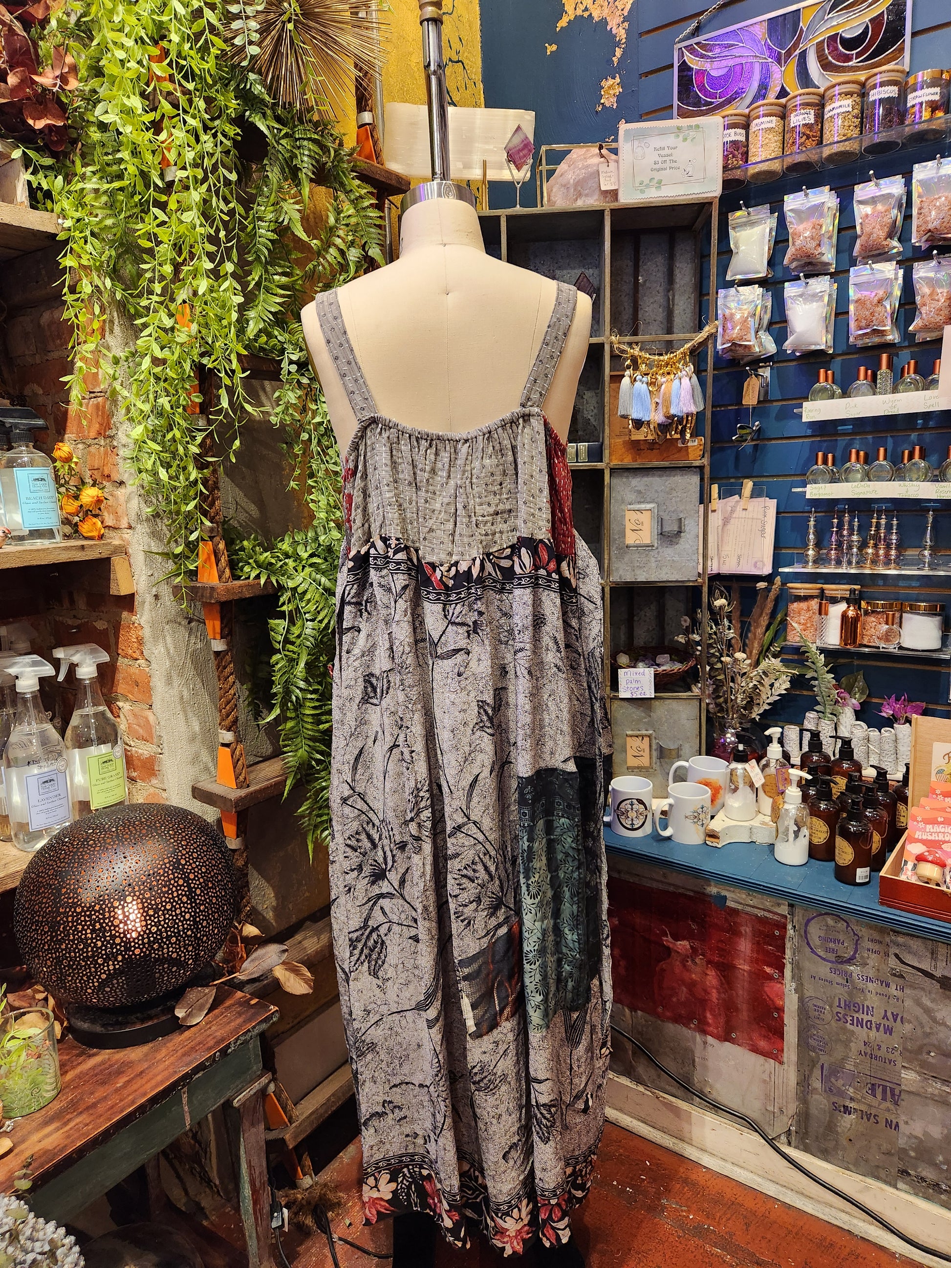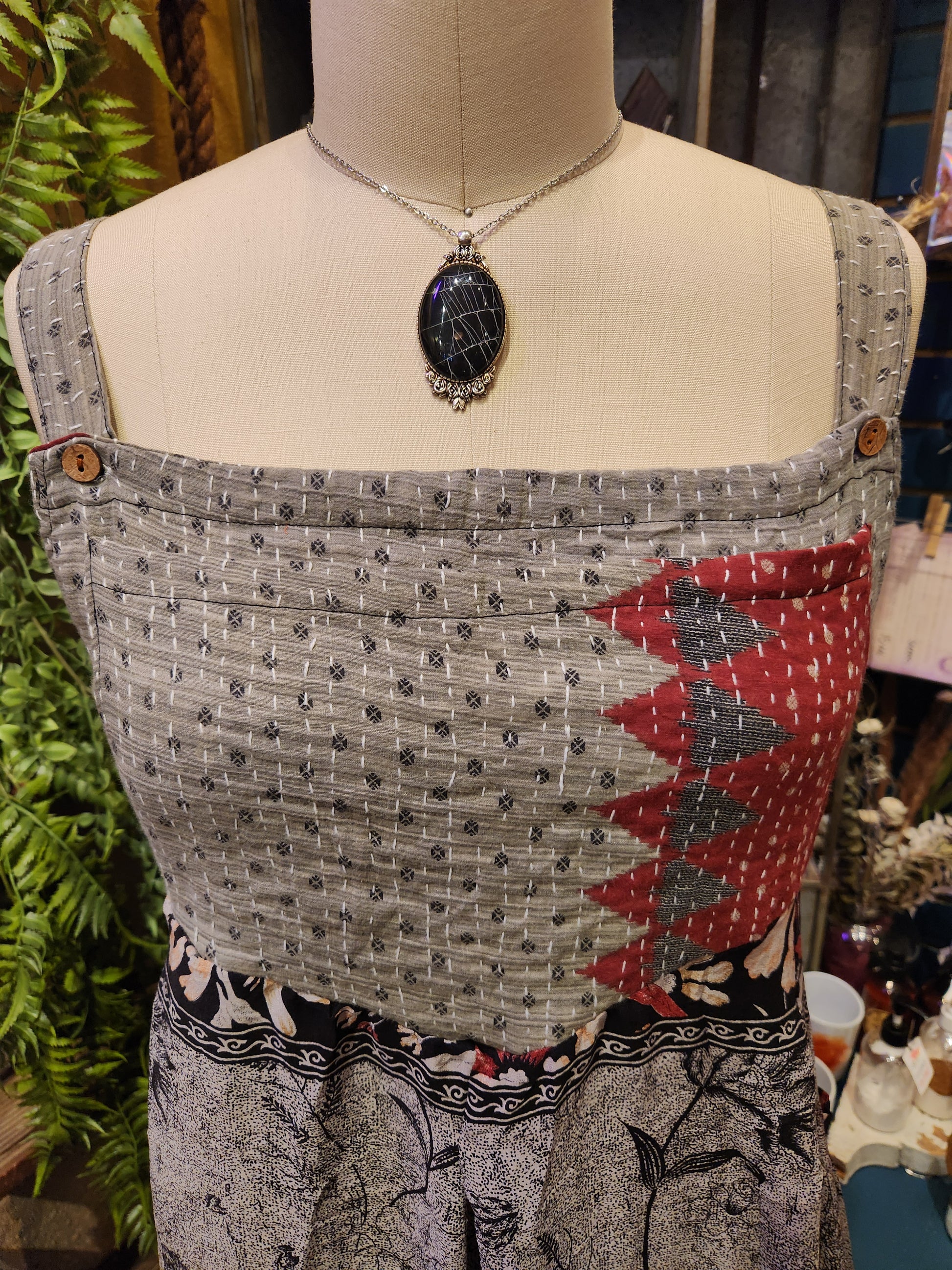 Perfect for EVERY season this overall dress features a kantha bib front with center pocket, adjustable button straps, tie back, crepe skirt and interior pockets on the skirt.