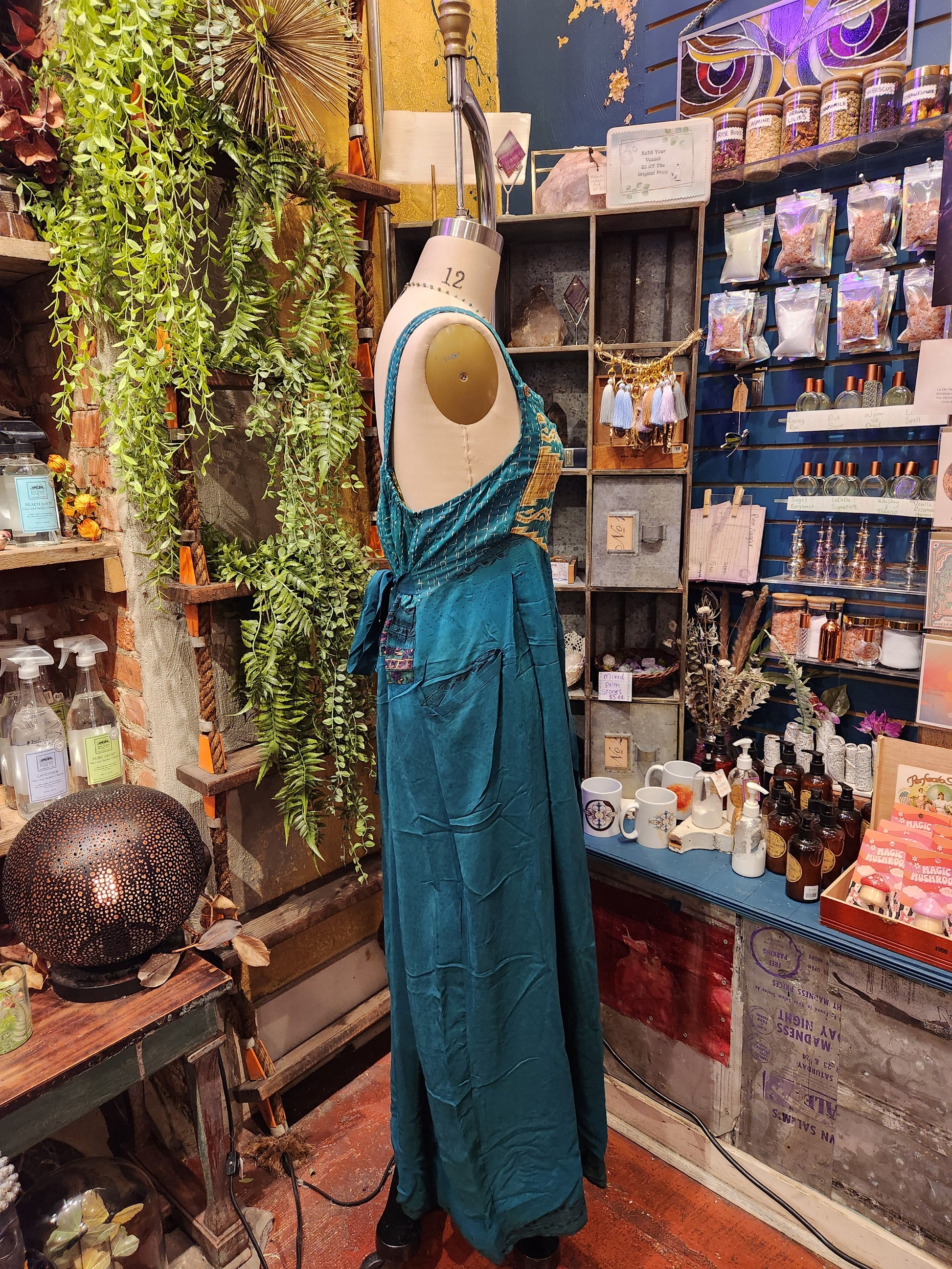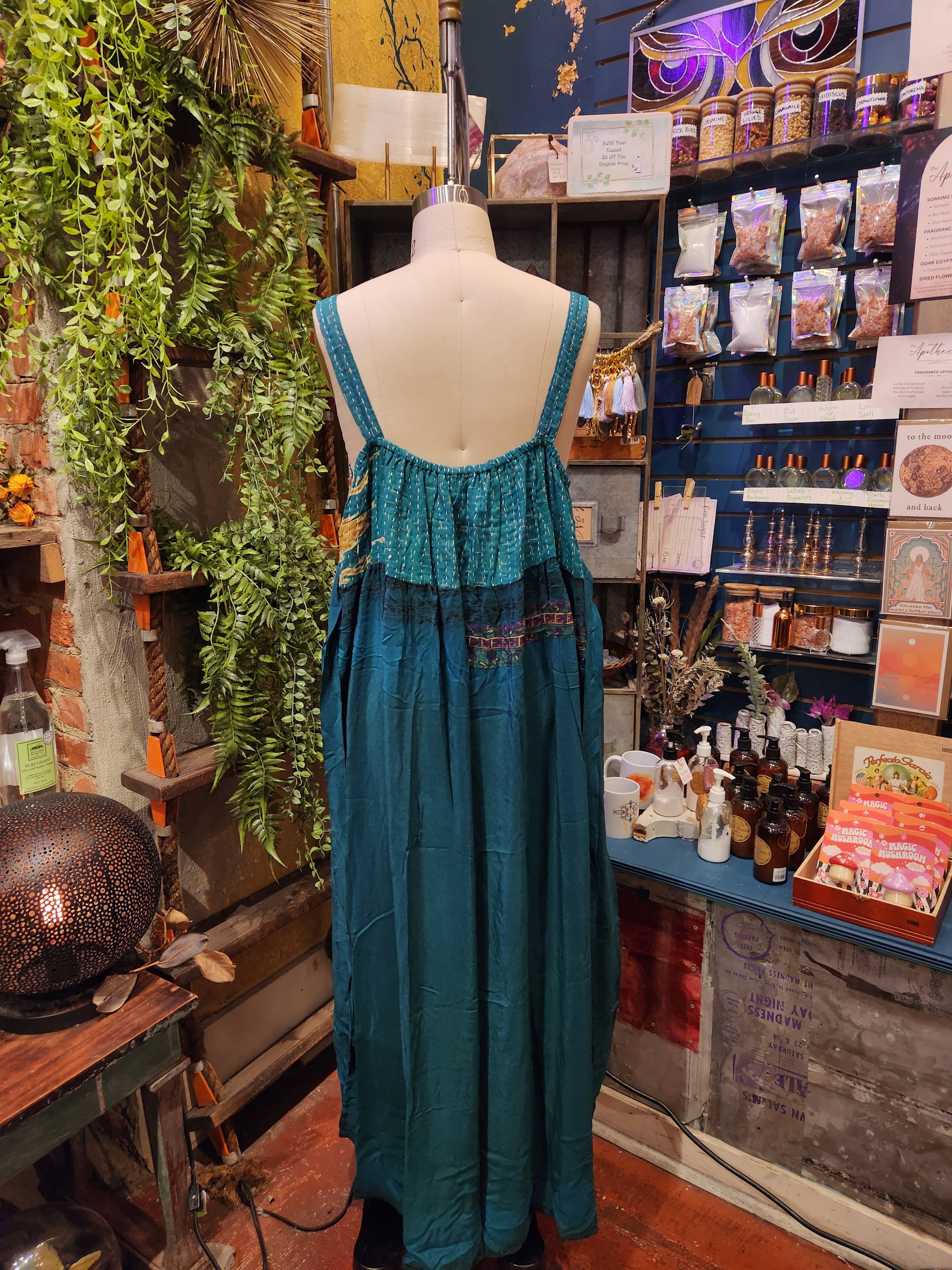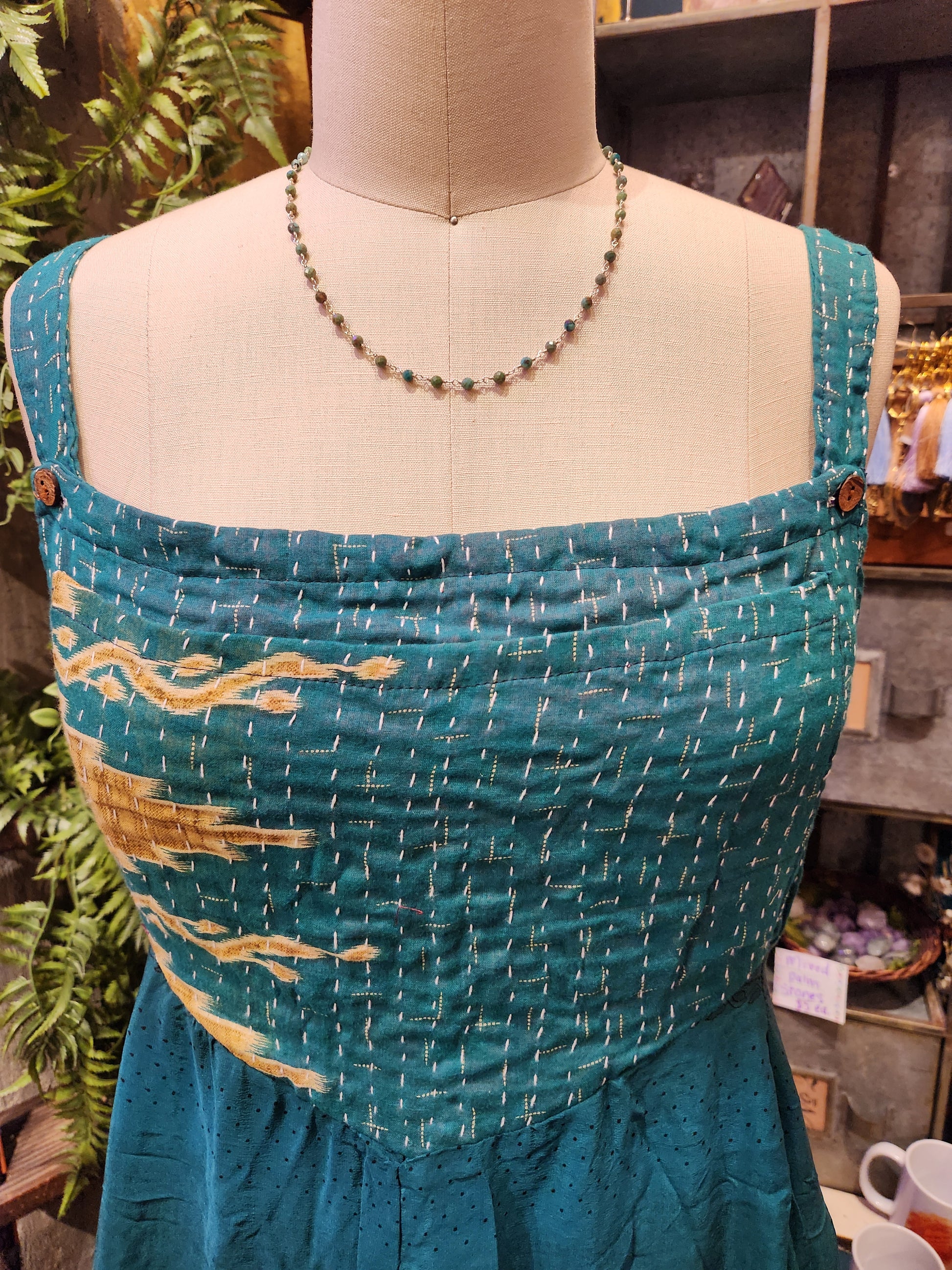 Perfect for EVERY season this overall dress features a kantha bib front with center pocket, adjustable button straps, tie back, crepe skirt and interior pockets on the skirt.