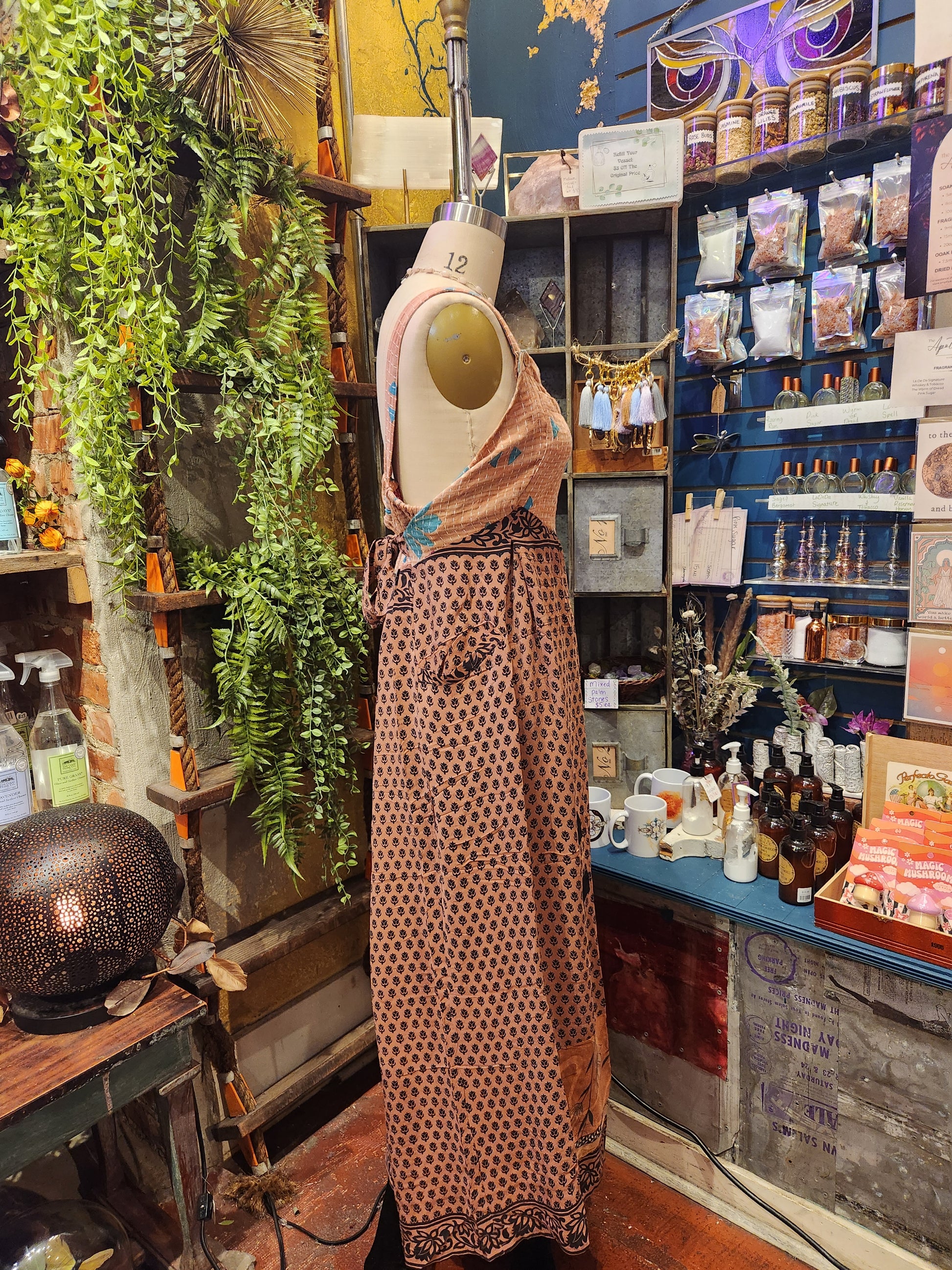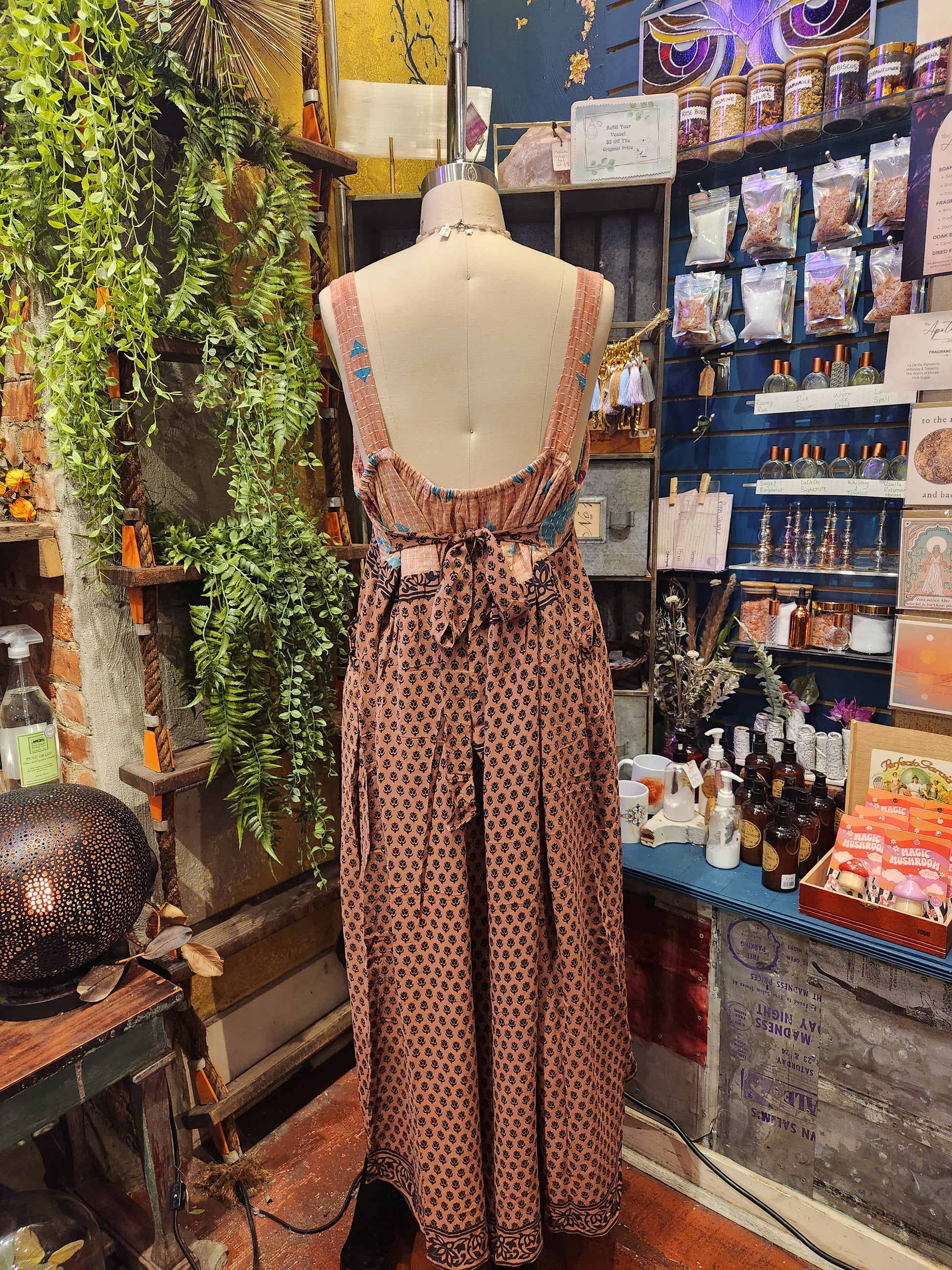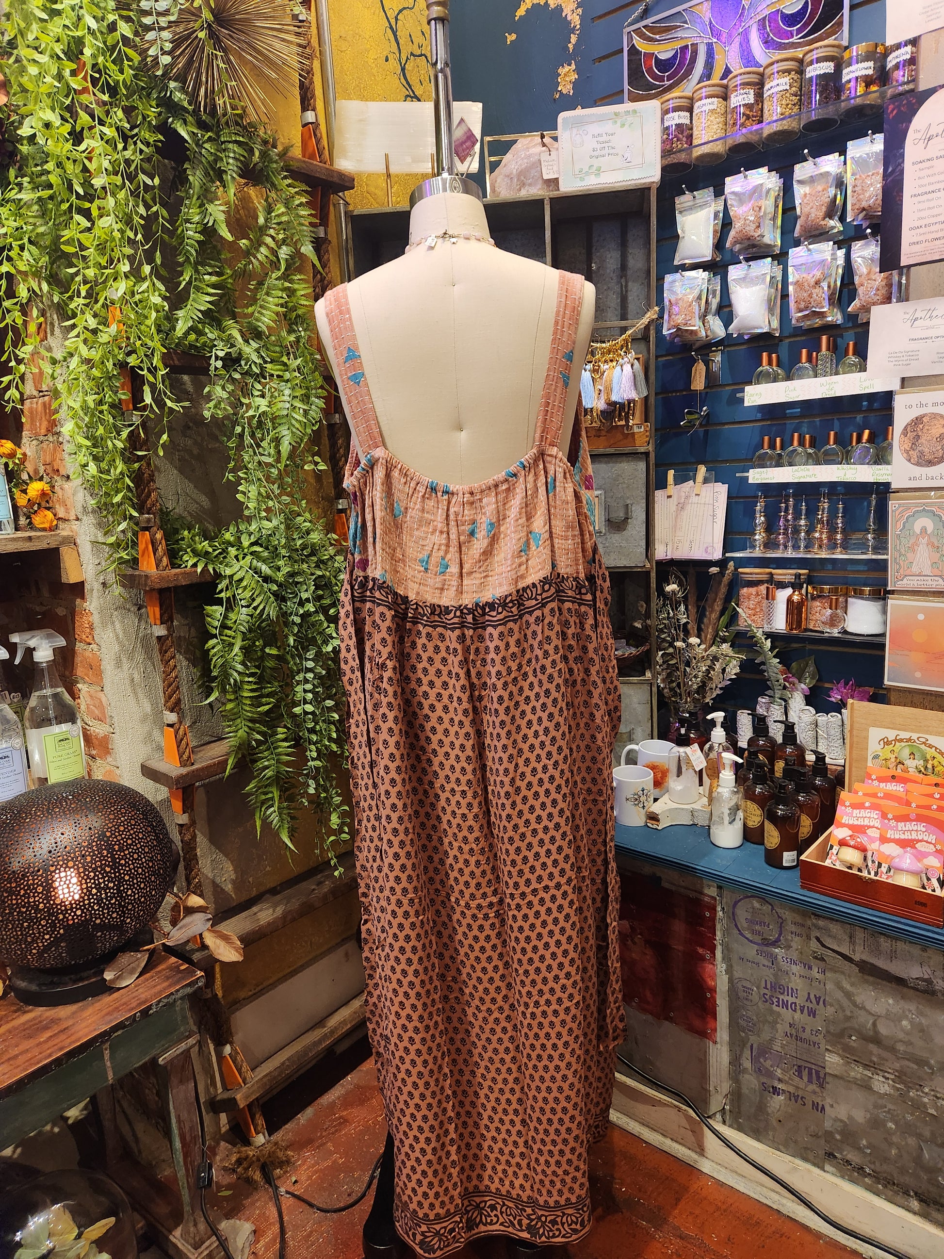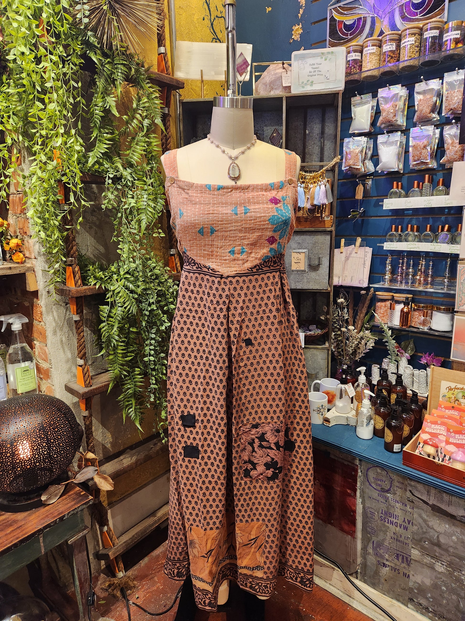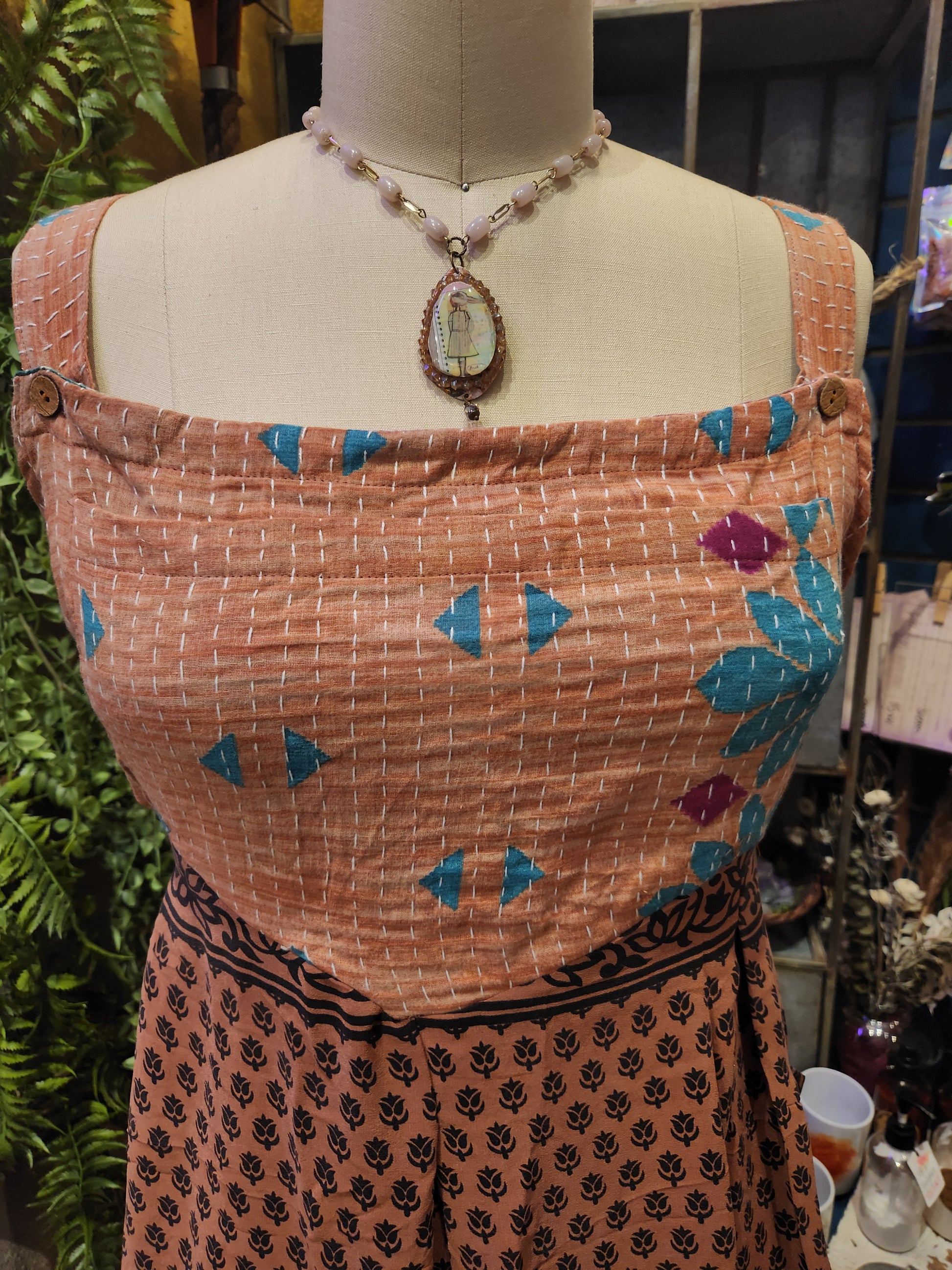Perfect for EVERY season this overall dress features a kantha bib front with center pocket, adjustable button straps, tie back, crepe skirt and interior pockets on the skirt.