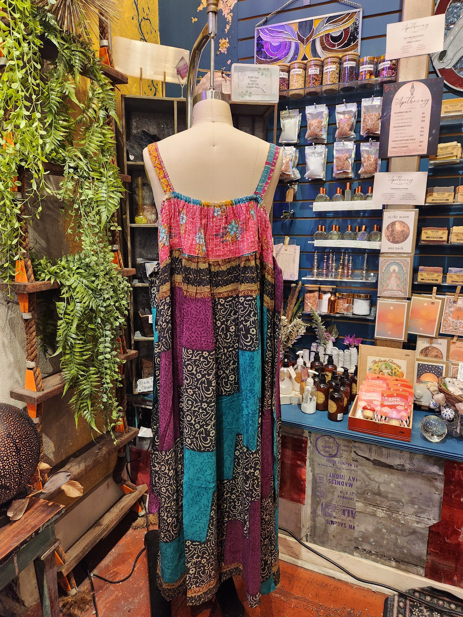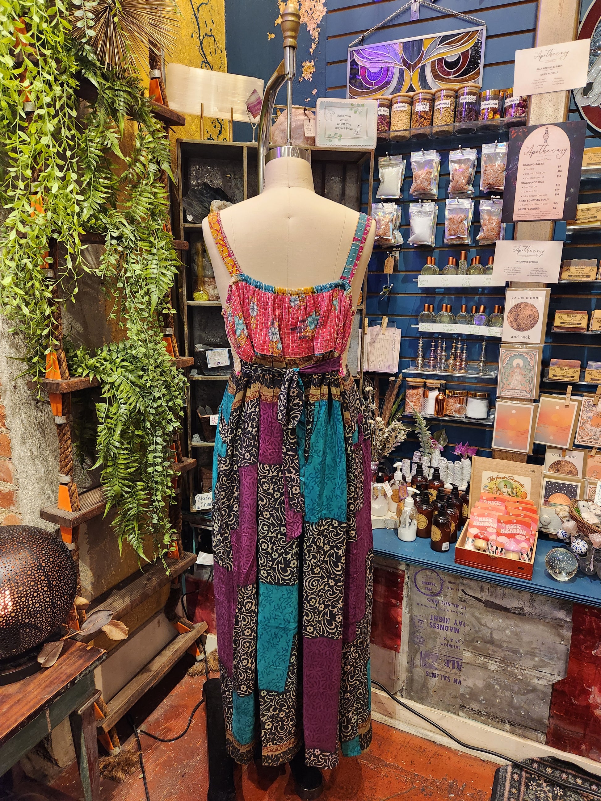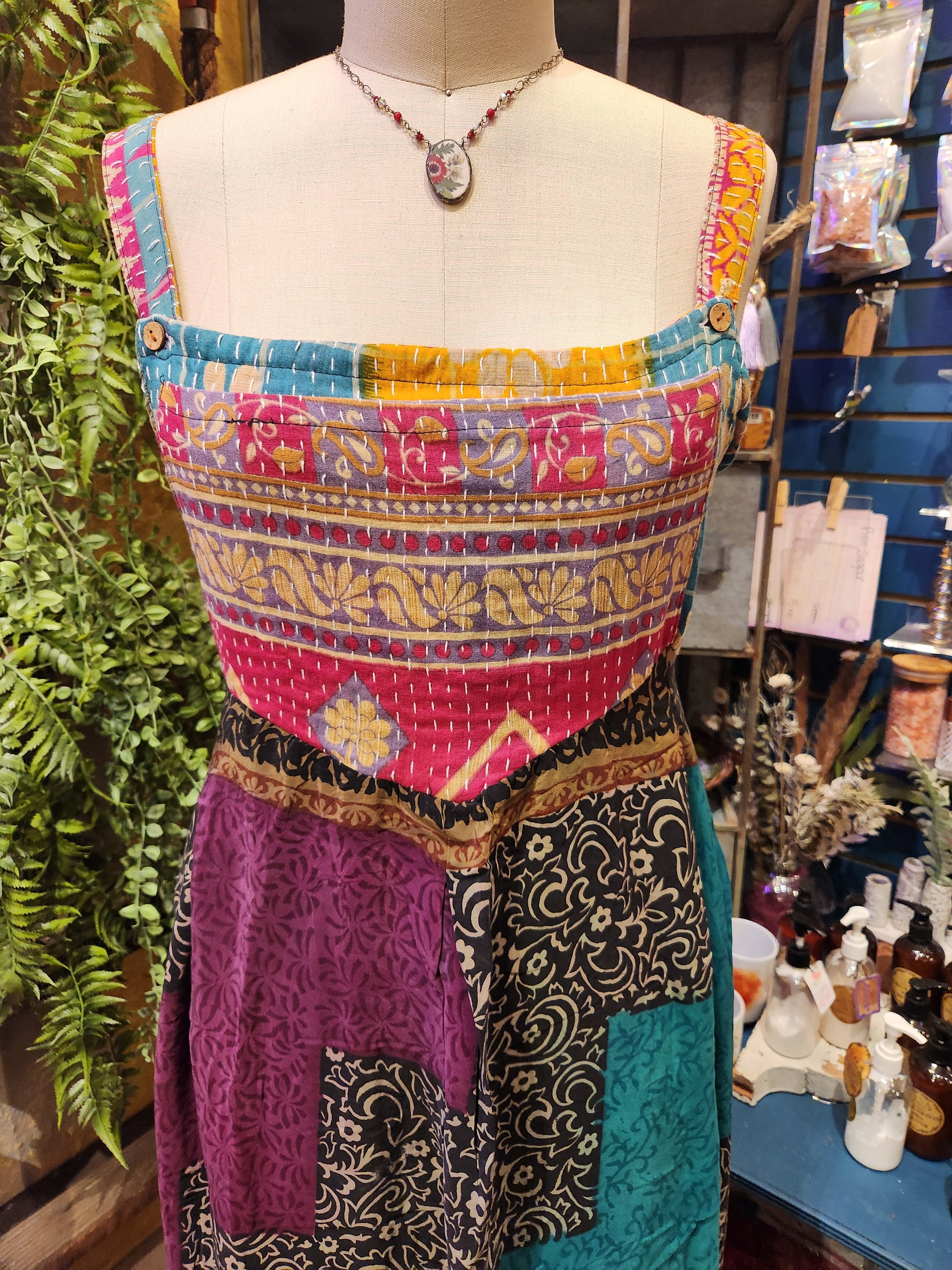 Perfect for EVERY season this overall dress features a kantha bib front with center pocket, adjustable button straps, tie back, crepe skirt and interior pockets on the skirt.