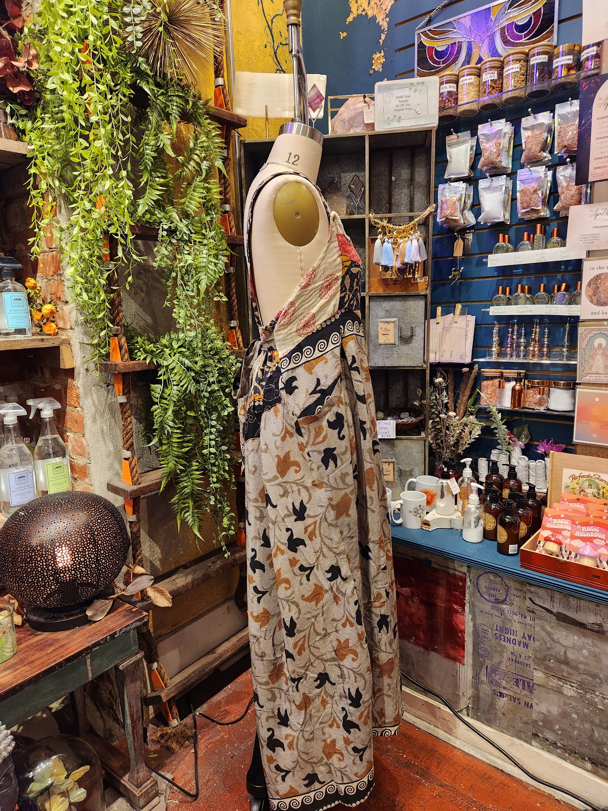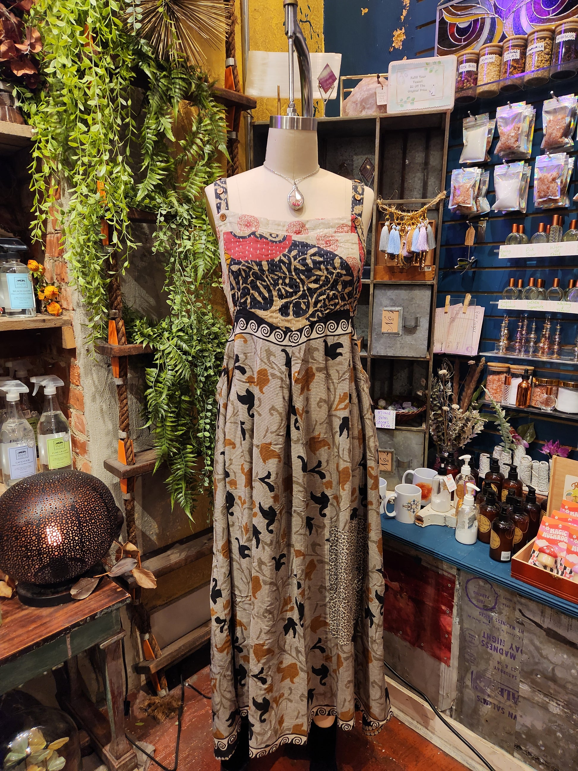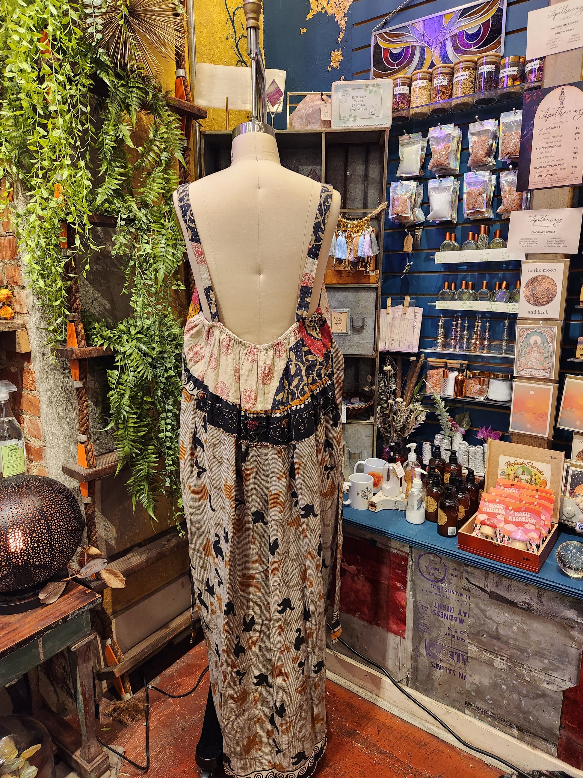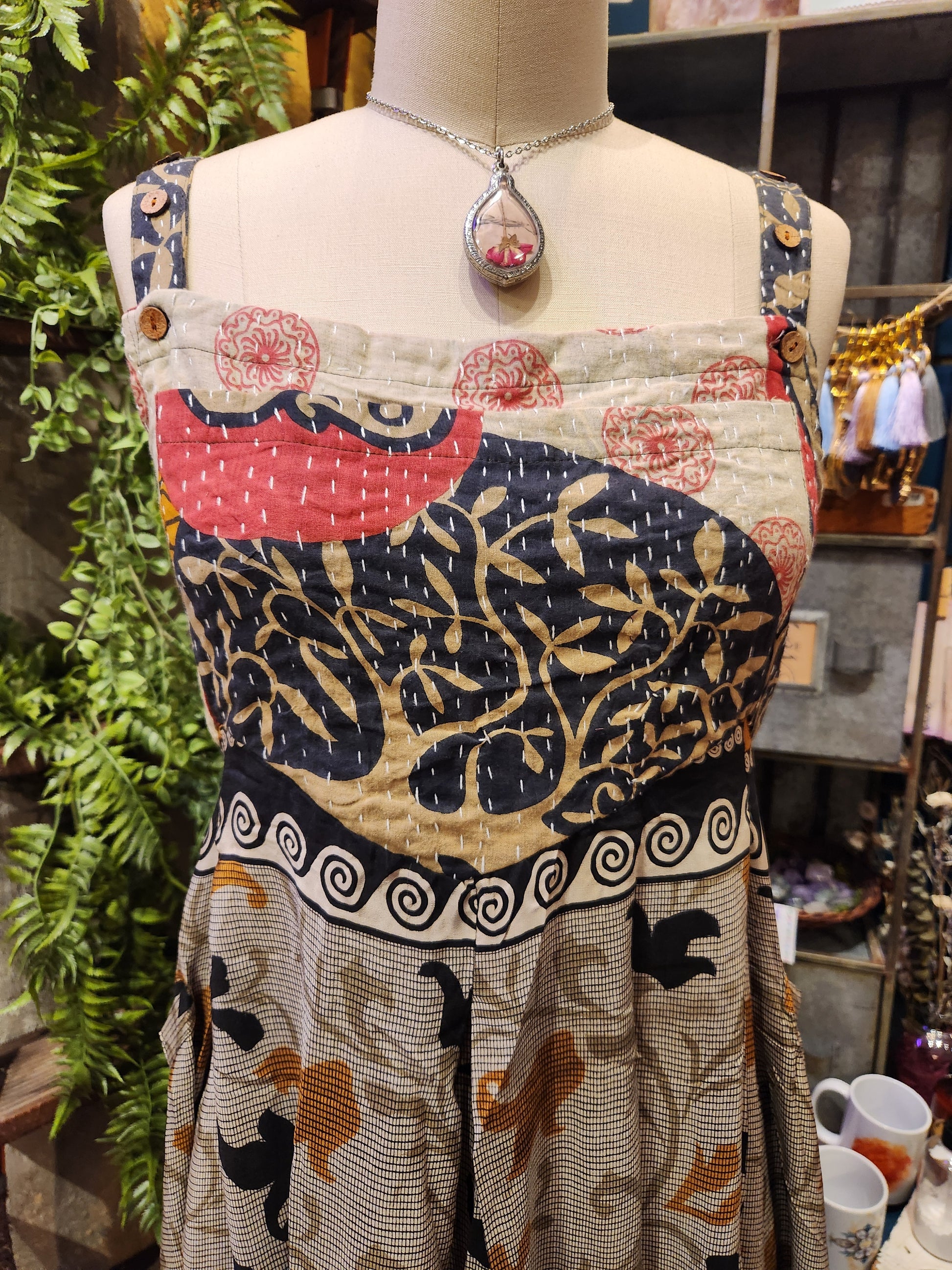 Perfect for EVERY season this overall dress features a kantha bib front with center pocket, adjustable button straps, tie back, crepe skirt and interior pockets on the skirt.