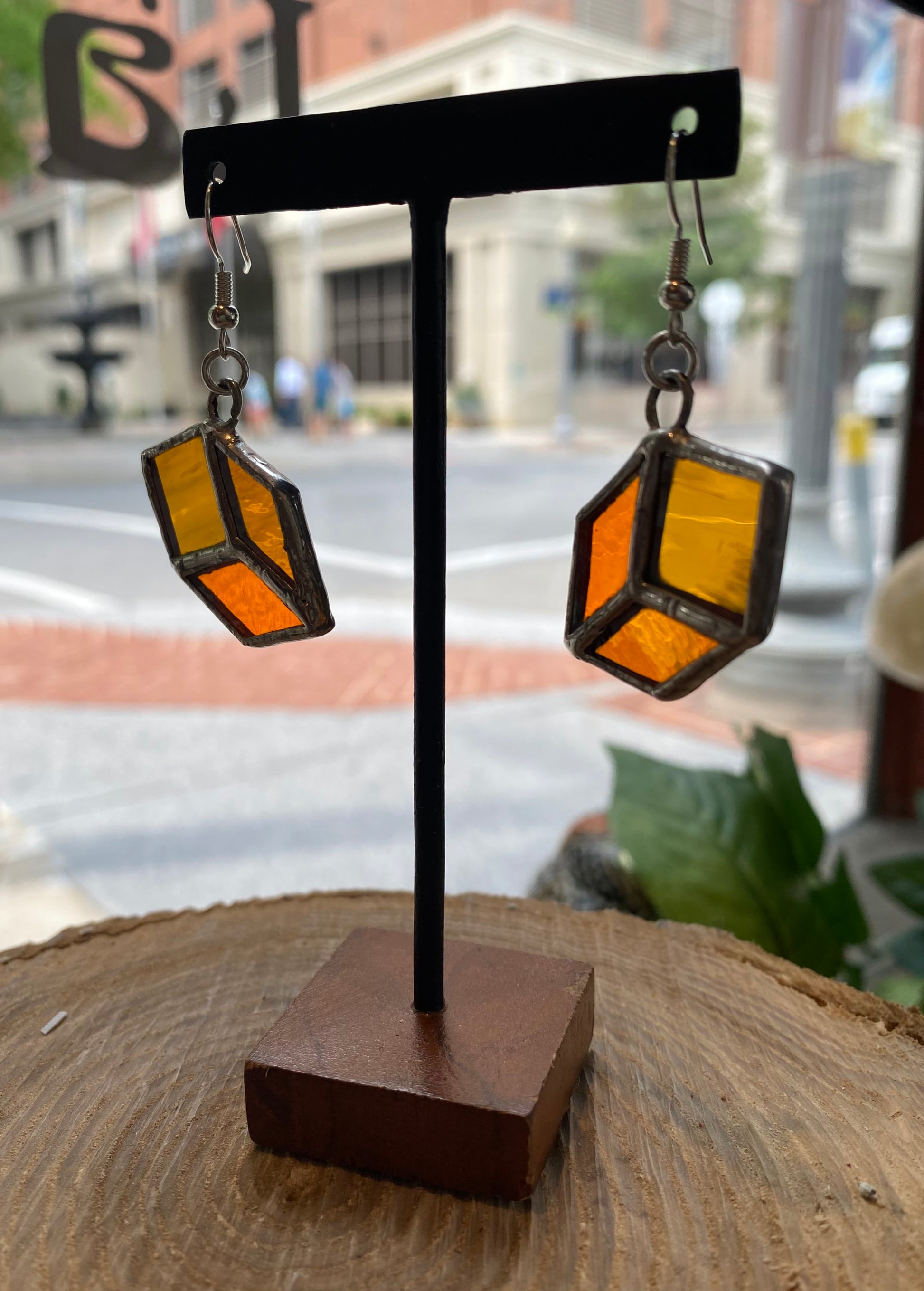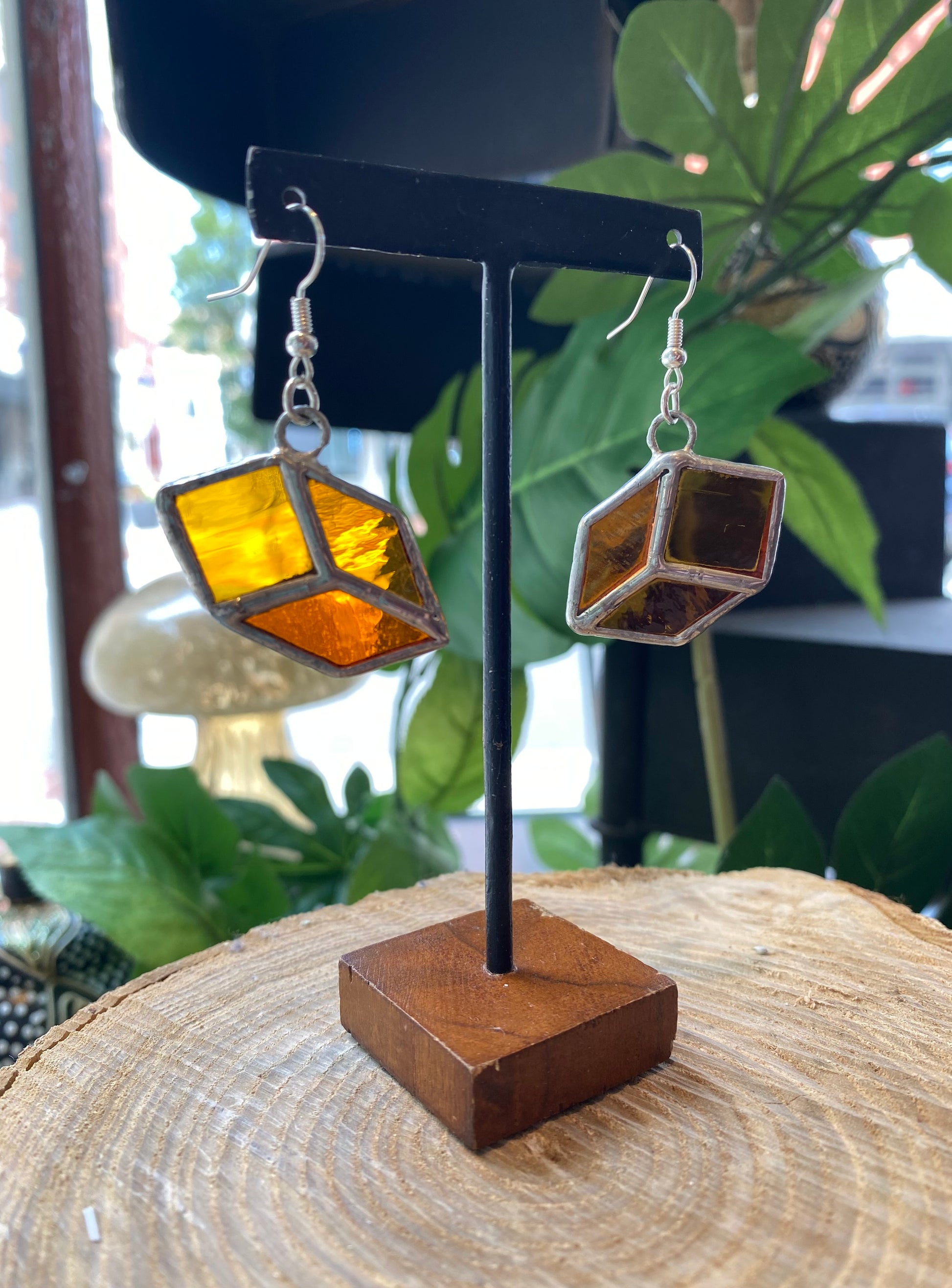 Glass geometric cube earrings, approximately 1.5 in (l) x 1 in (w). Hypoallergenic stainless steel findings, and lead-free solder.ย