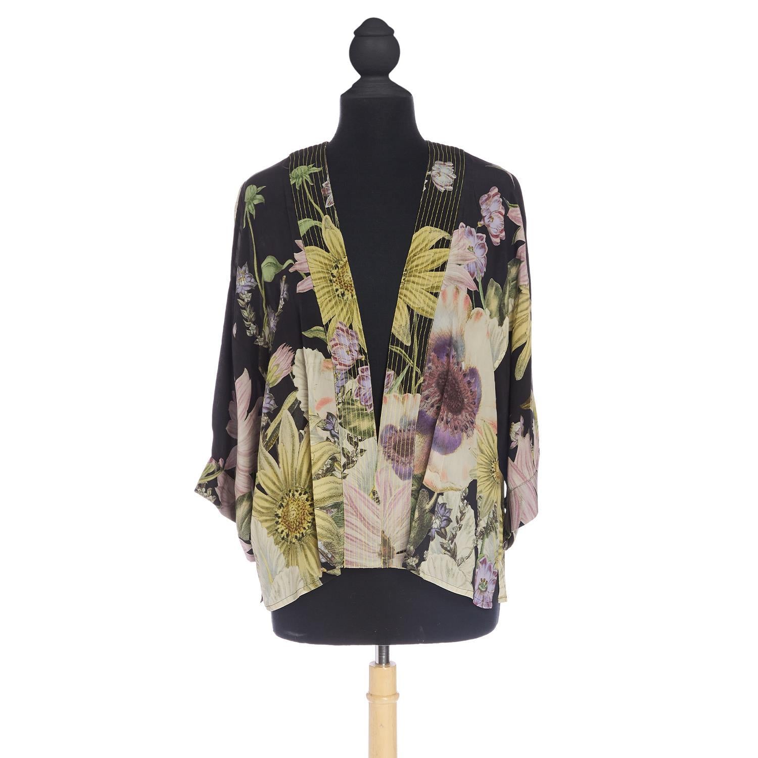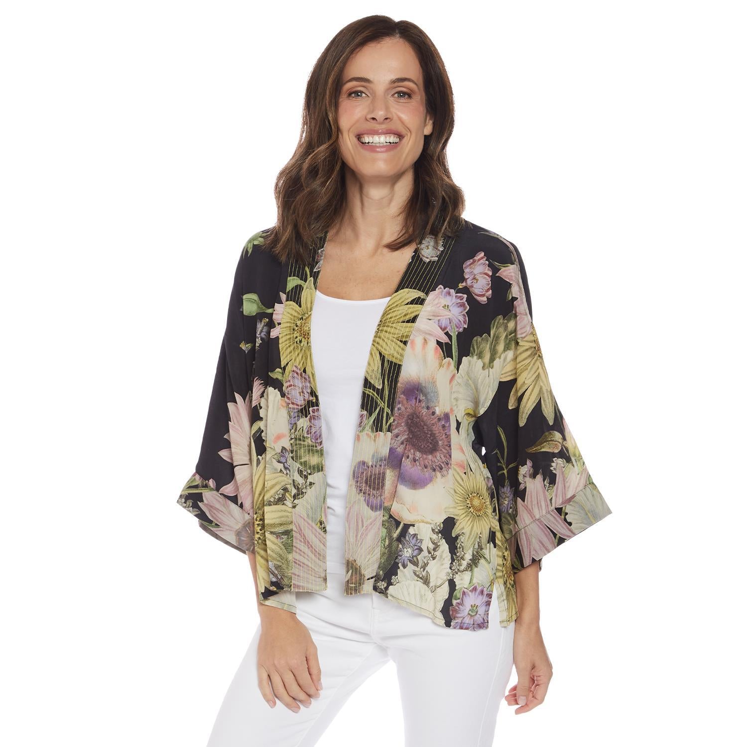 This popular kimono from One Hundred Stars features a crepe fabric that adds a subtle weight and a charming 1920s vibe, while reducing transparency. The waist-length design includes wide 3/4 sleeves, making it a versatile piece for any event. Whether layered over a simple cami or a classic black dress, this short kimono enhances your look effortlessly. Designed in one generous size, it flatters a variety of body shapes, making it a stylish and adaptable addition to your wardrobe.