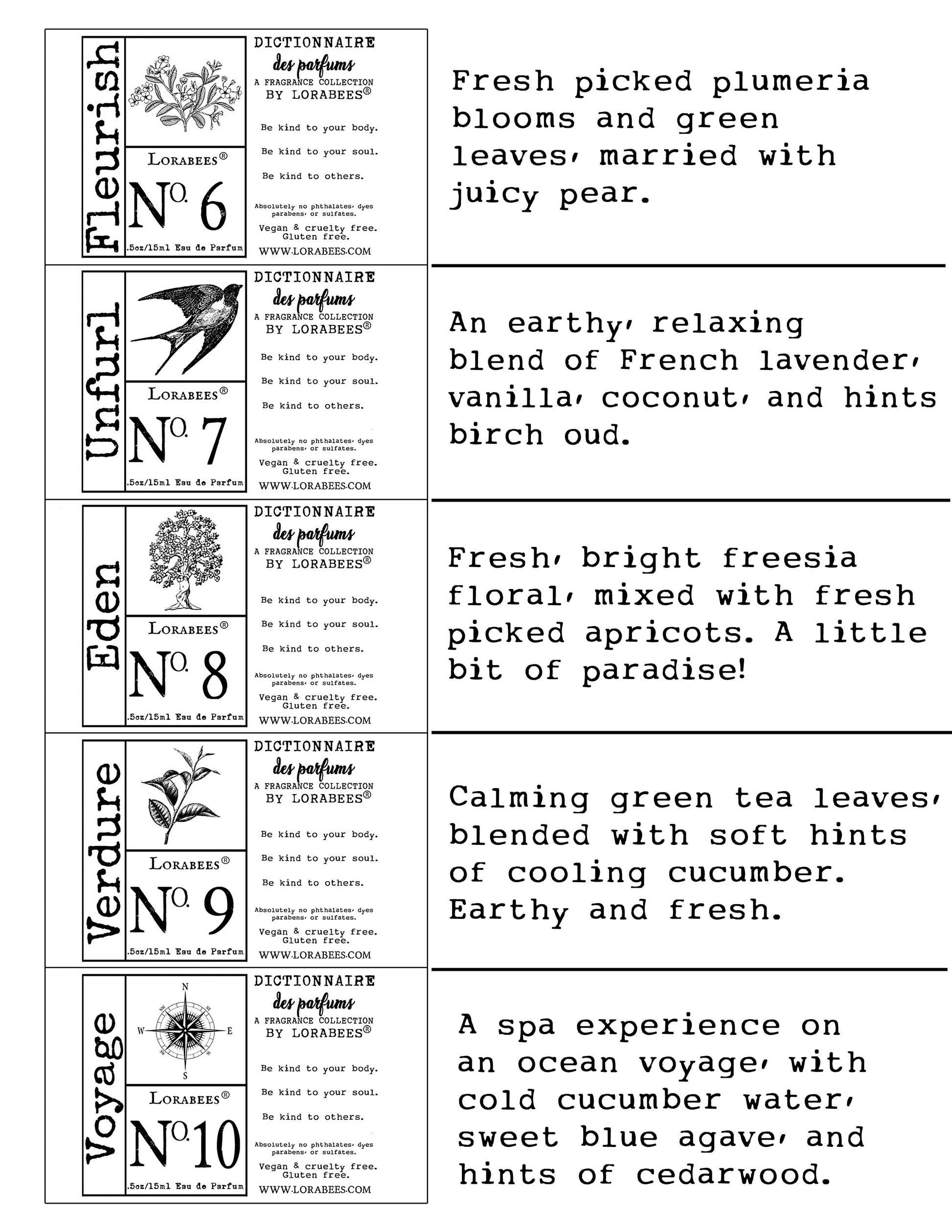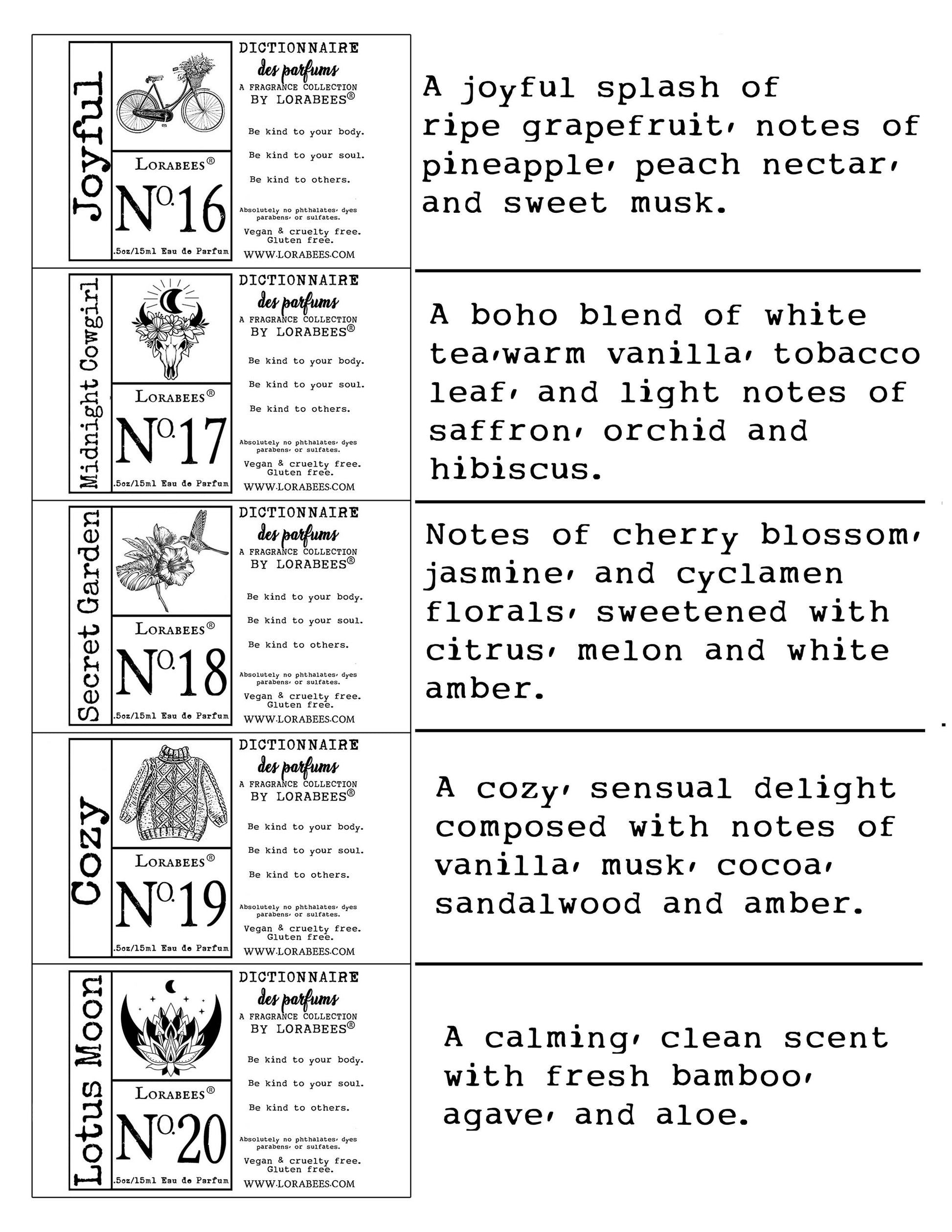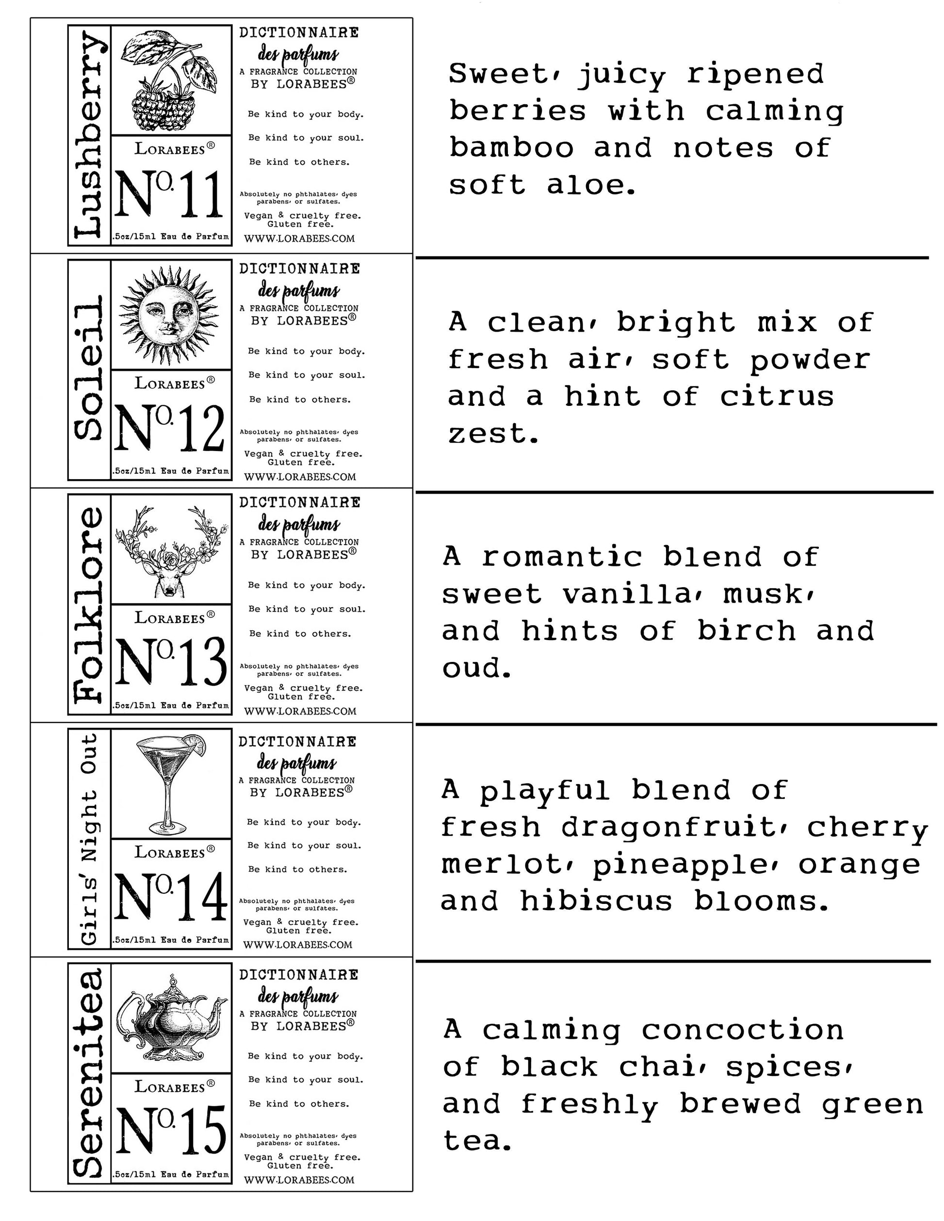 0.5 oz/15 ml parfum roll on with encyclopedia inspired labeling, in a modern glass vial and bamboo style cap. We have 20 scents to choose from that are as unique as your! Our perfume/parfum rollers are artisan crafted with no phthalates, dyes, parabens, or sulfates, with a carrier oil base of organic fractionated coconut oil. We use high quality fragrance oils and essential oils in our recipes. Each comes in a matching black box, with matching label.