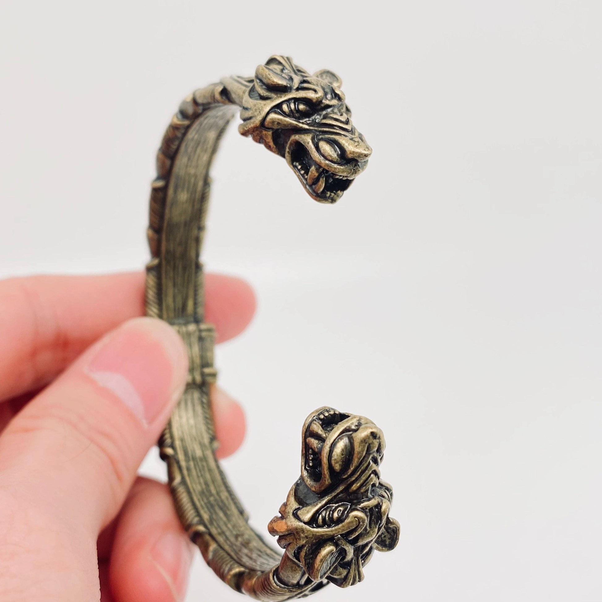 This Double Head of Dragon Bangle in bronze is a bold statement piece designed for men who want to showcase strength and style. Crafted with intricate dragon heads facing each other, it symbolizes power and protection. The durable bronze material ensures lasting wear, making it perfect for everyday use or special occasions. Elevate your accessory game with this striking bracelet that combines timeless craftsmanship with a fierce edge.