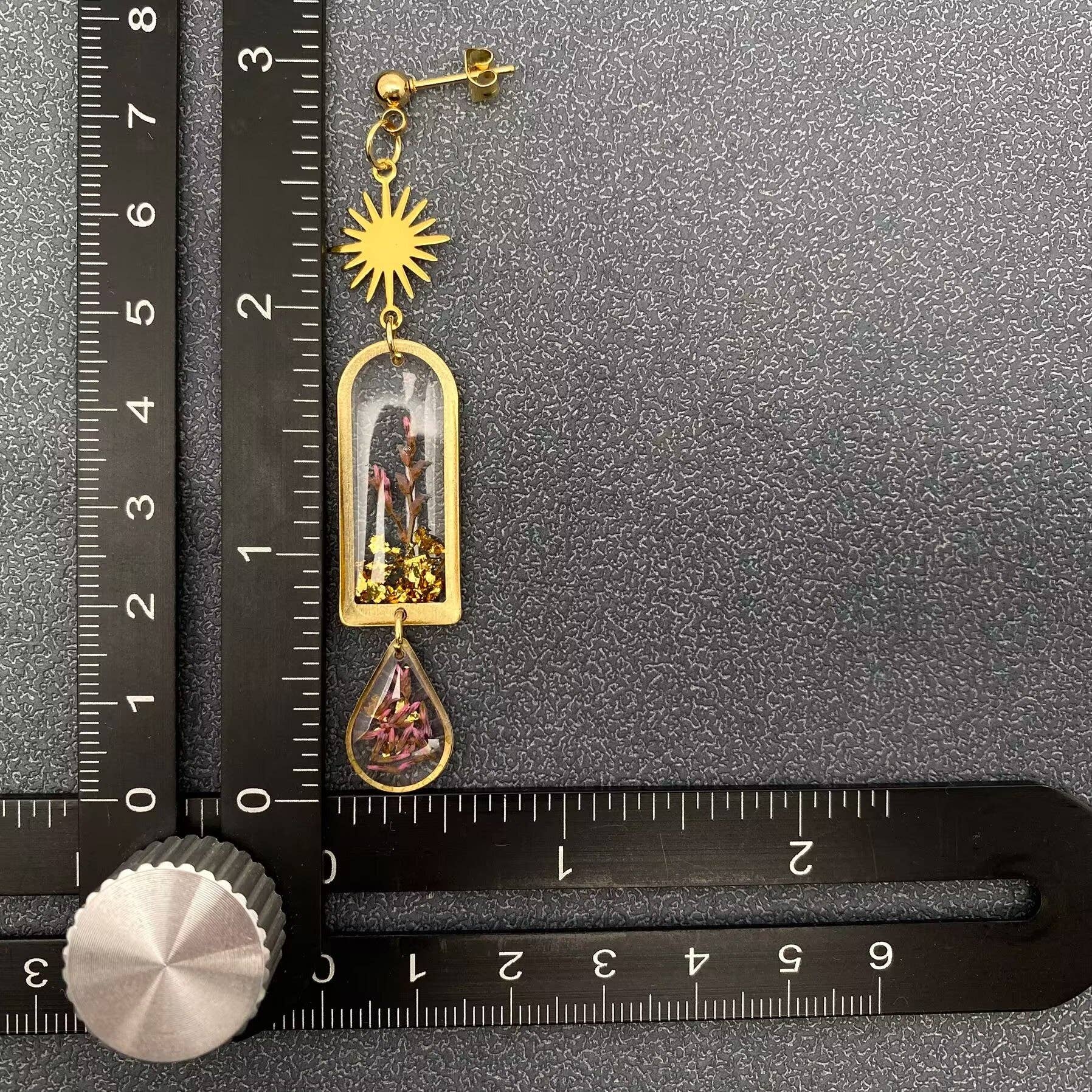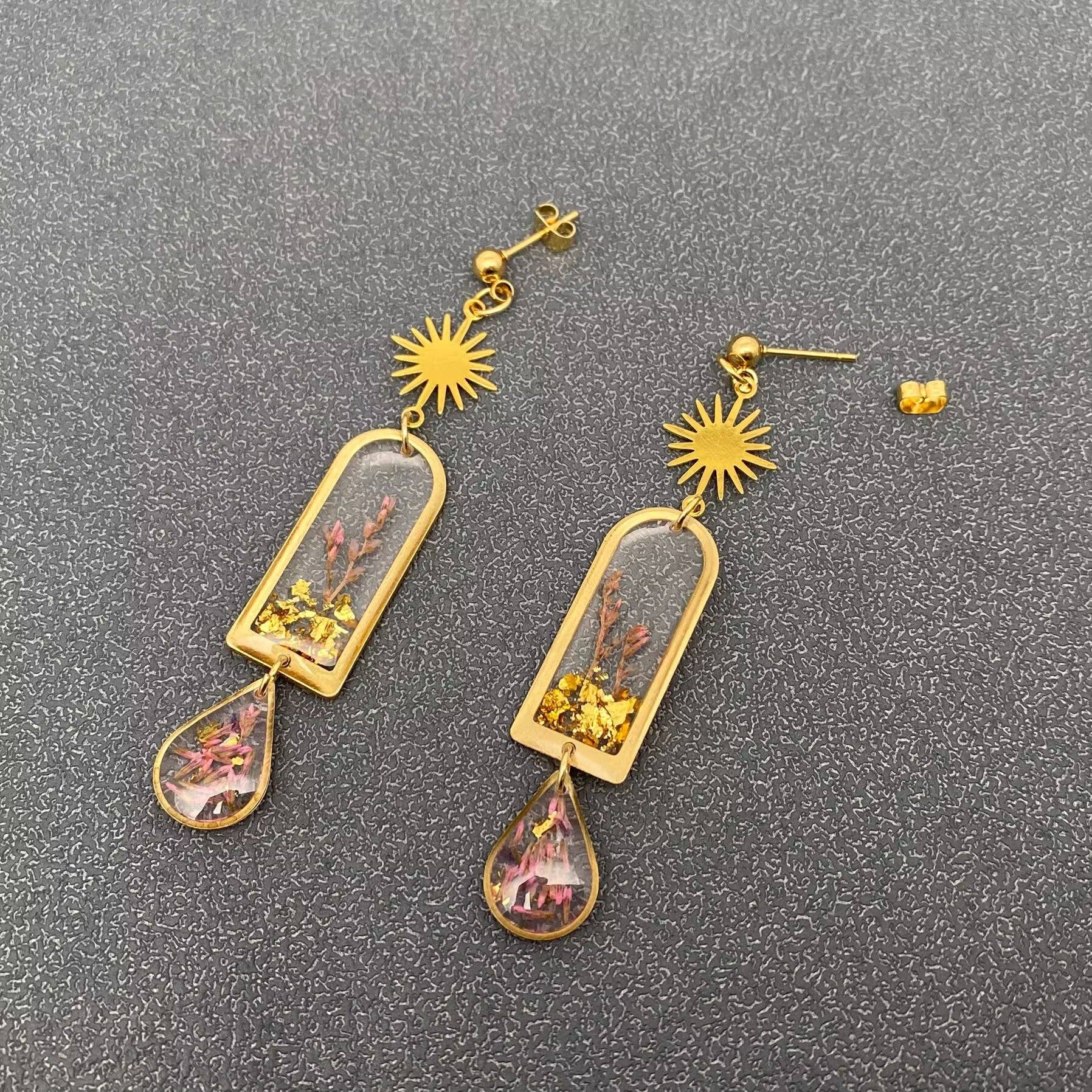 Type: Earrings Material: Dried flowers, resin, brass charm ,18K gold plated stainless steel post