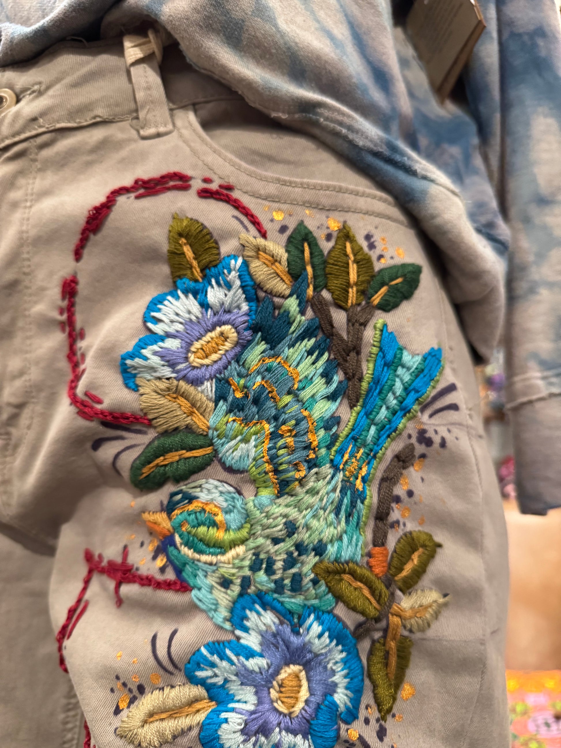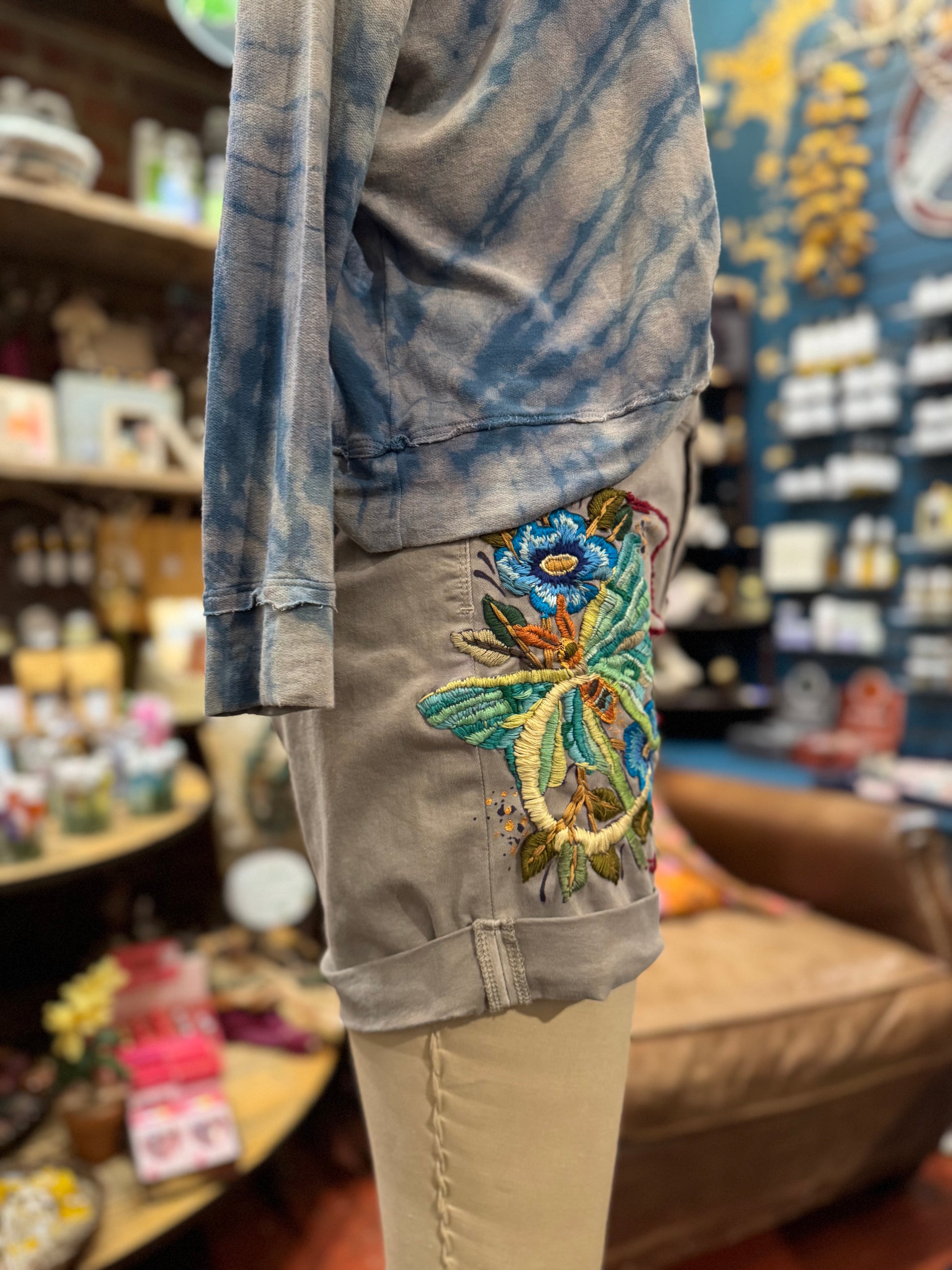 Colorful Hand-Embroidered Bird & Moth Charlie B cuffed bottom shorts