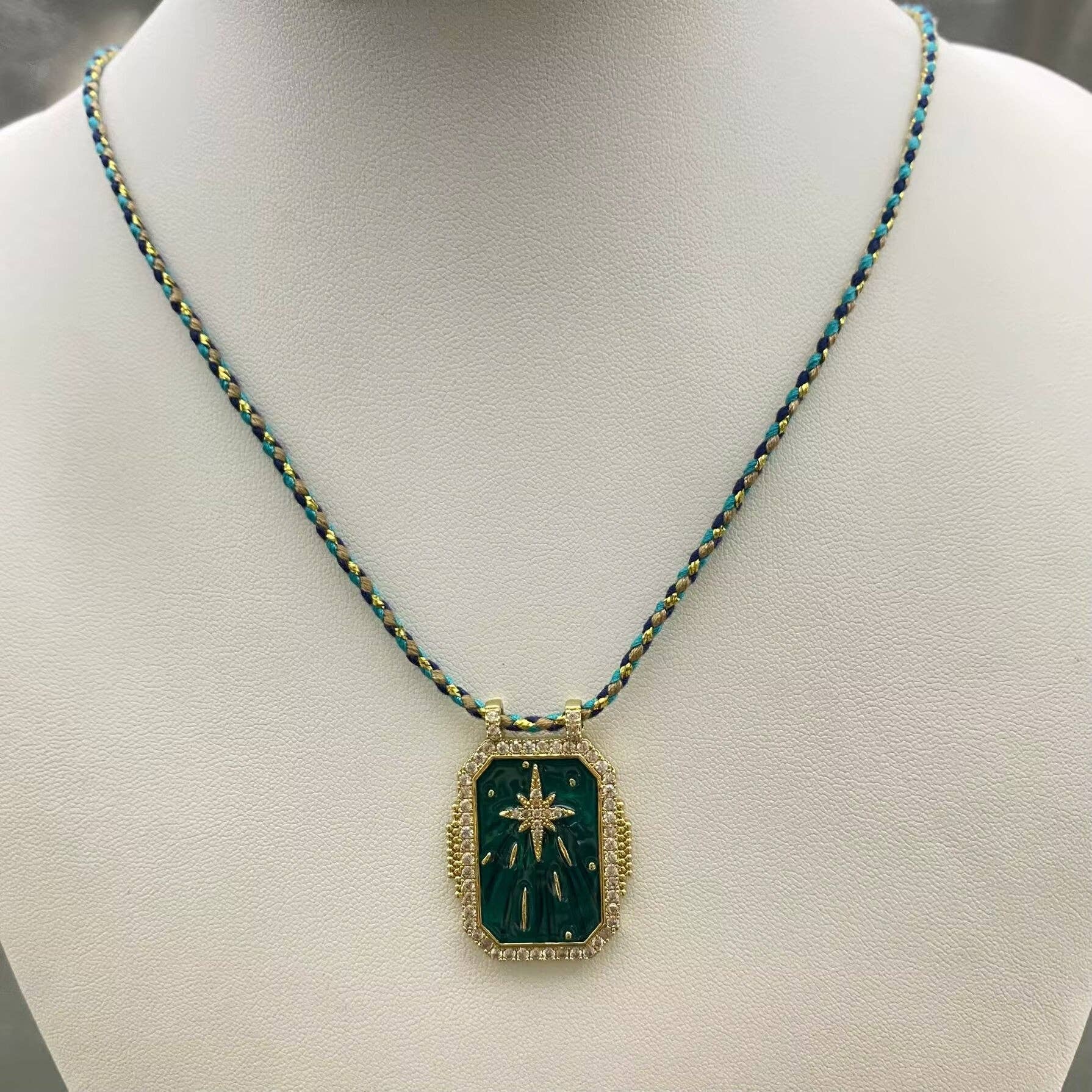Enamel Rhinestone Star Square Cahrm Braided Rope Necklace