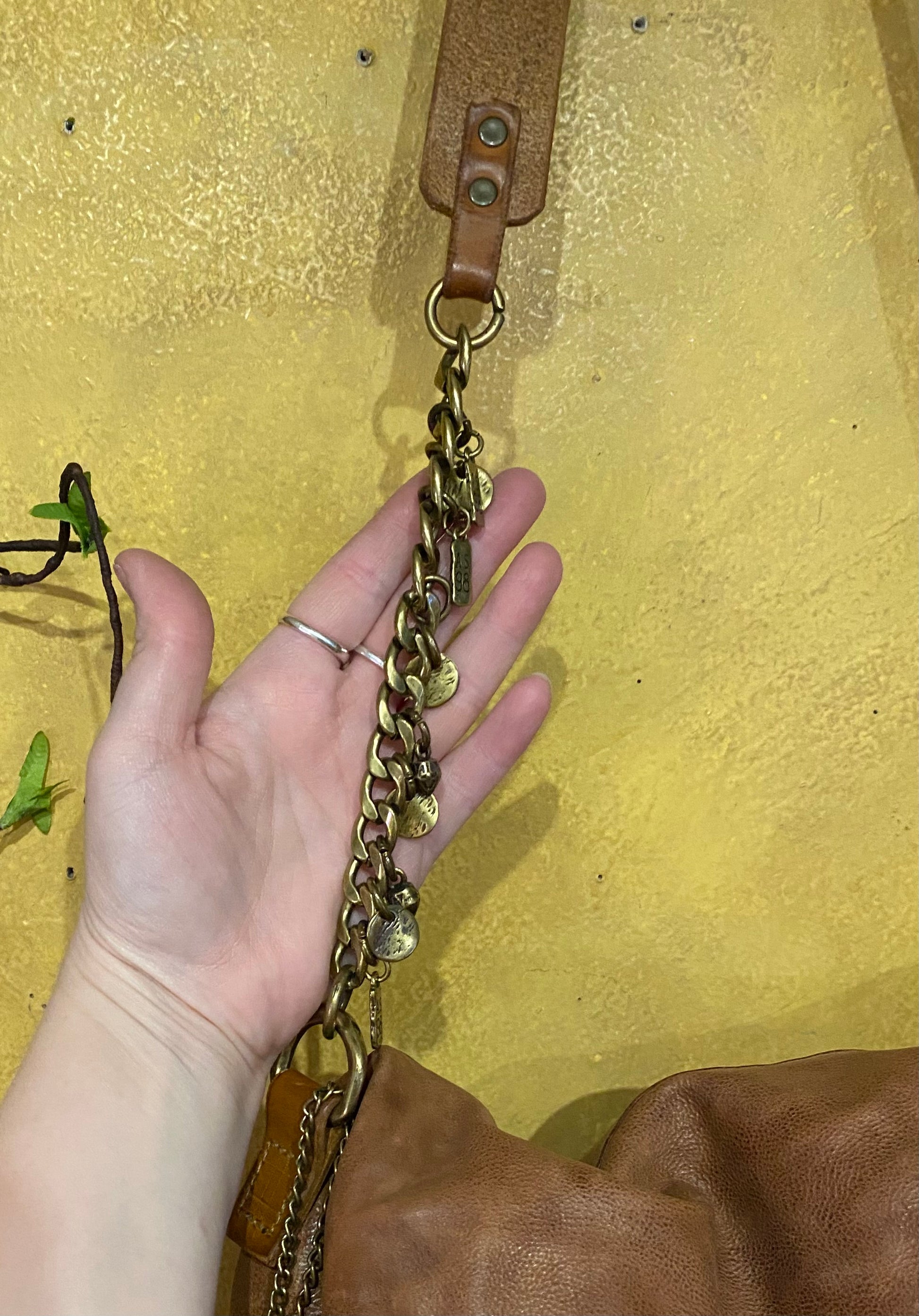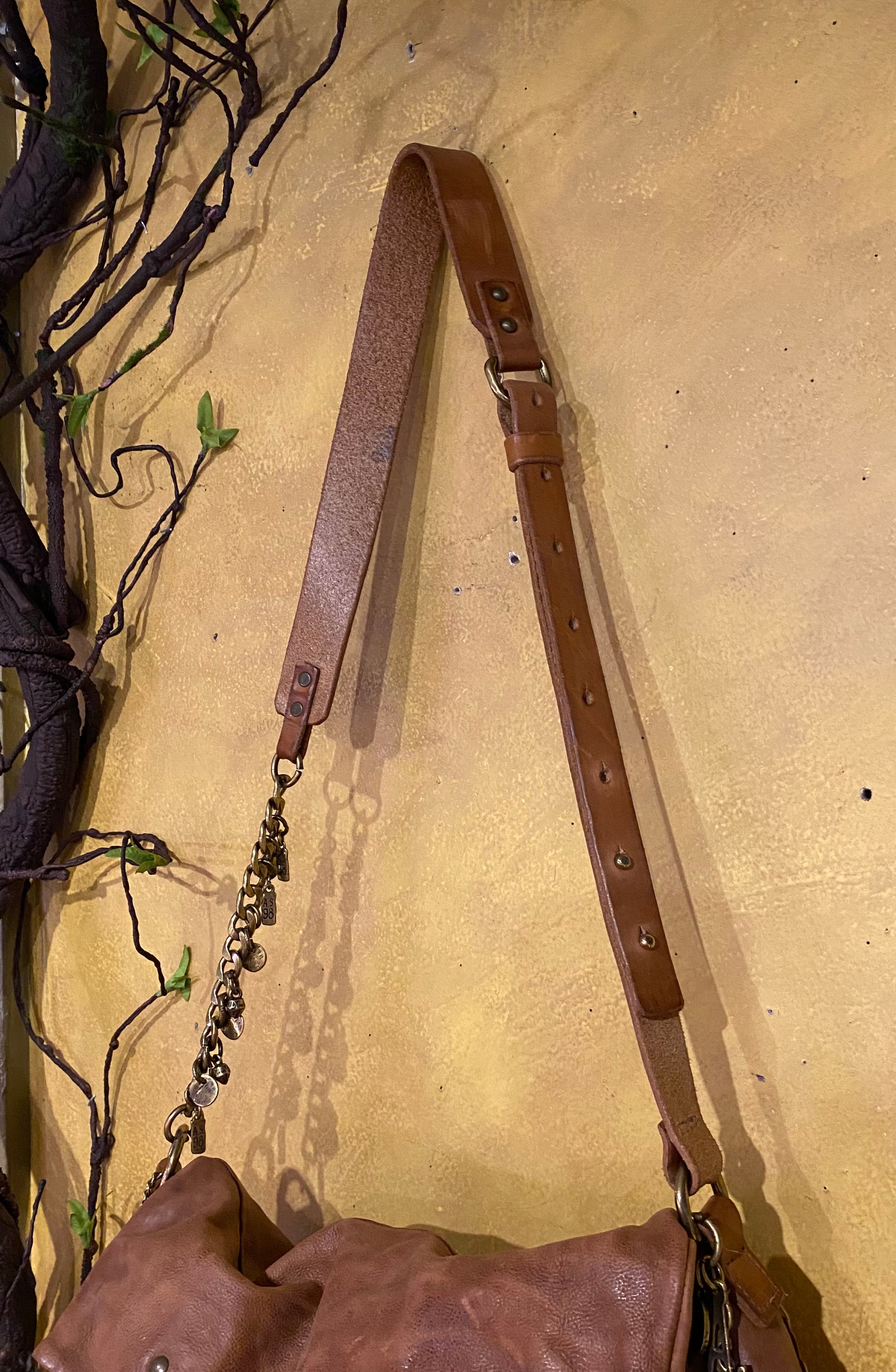 Elevate your everyday style with this folded top leather crossbody bag in camel. Featuring a secure magnetic closure and a spacious design, it offers both convenience and room for all essentials. Adorned with unique A.S. 98 charms and emblems, this bag adds a distinctive touch. Carry it your way with an adjustable crossbody strap and sturdy handles, blending functionality with bold fashion.