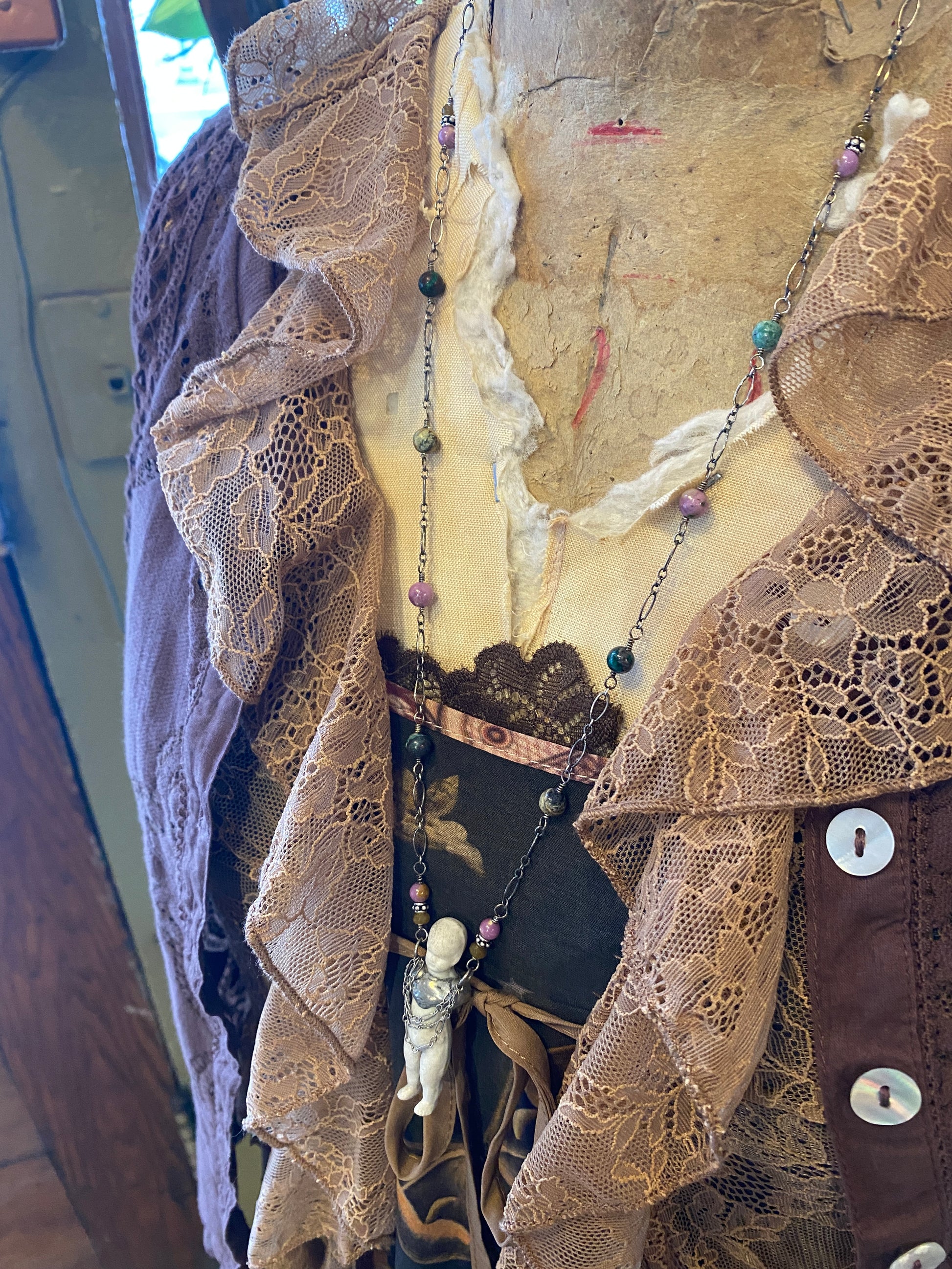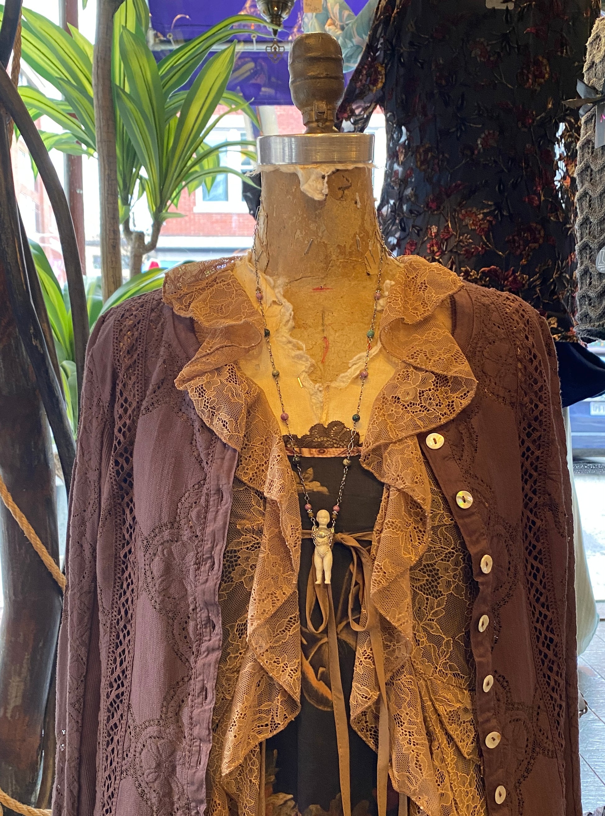 "I use vintage pieces and cicada wings in most of my work. These components are often flawed or show signs of age. This makes them even more special to me. Semi-precious stones are soldered with lead-free solder and treated with a patina so they have an aged look. Sterling is oxidized for the same reason. Nothing here is clean and perfect and mostly one of a kind." - Bijou Savvy