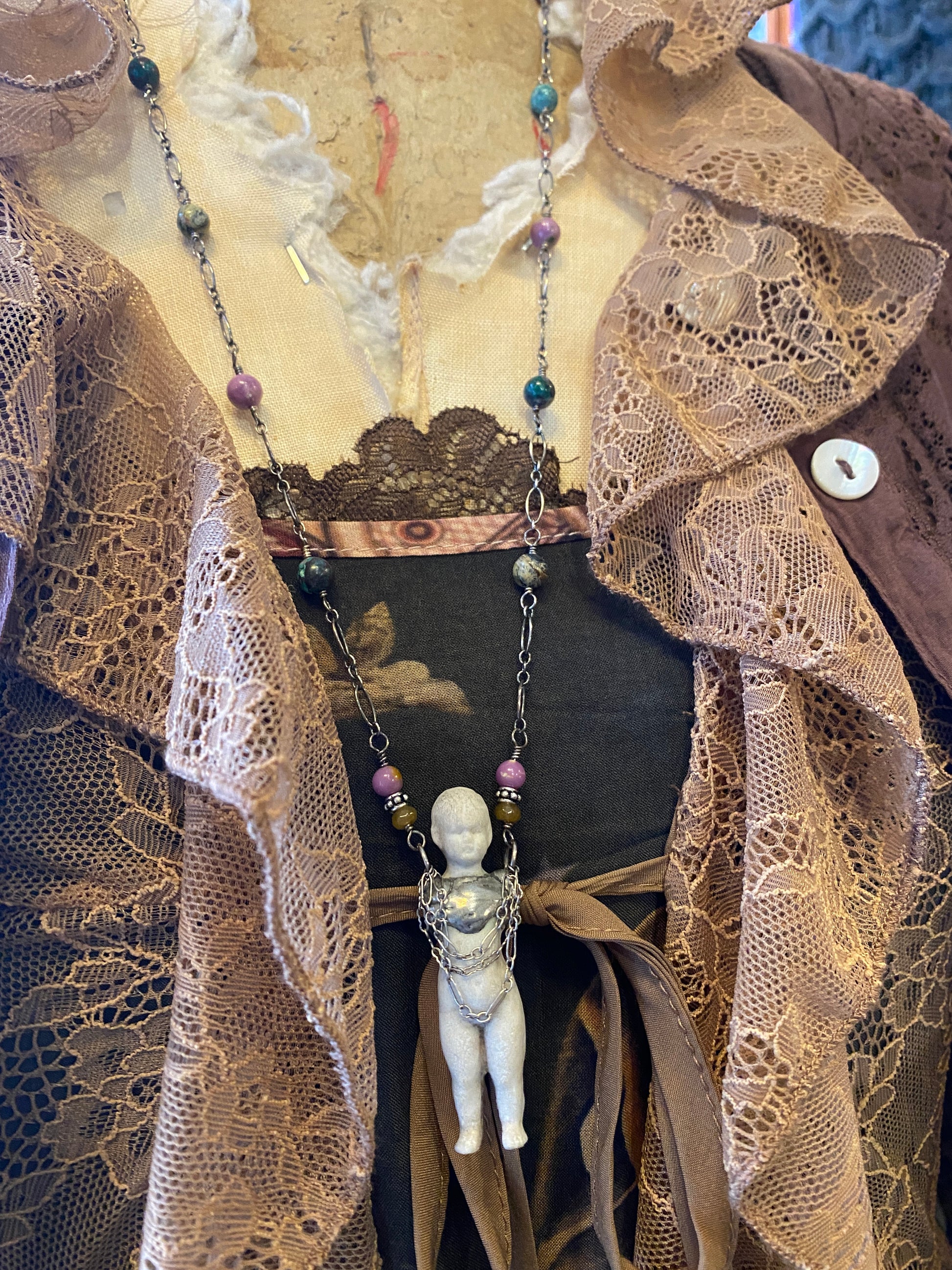 Discover the timeless charm of the Frozen Charlotte Necklace, a handmade vintage-inspired piece that captures nostalgic elegance. This delicate necklace features a frozen charlotte pendant suspended from a graceful chain, blending antique aesthetics with contemporary craftsmanship.