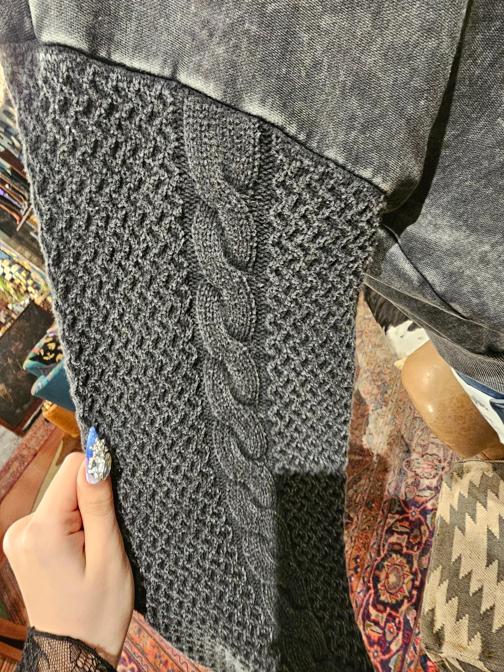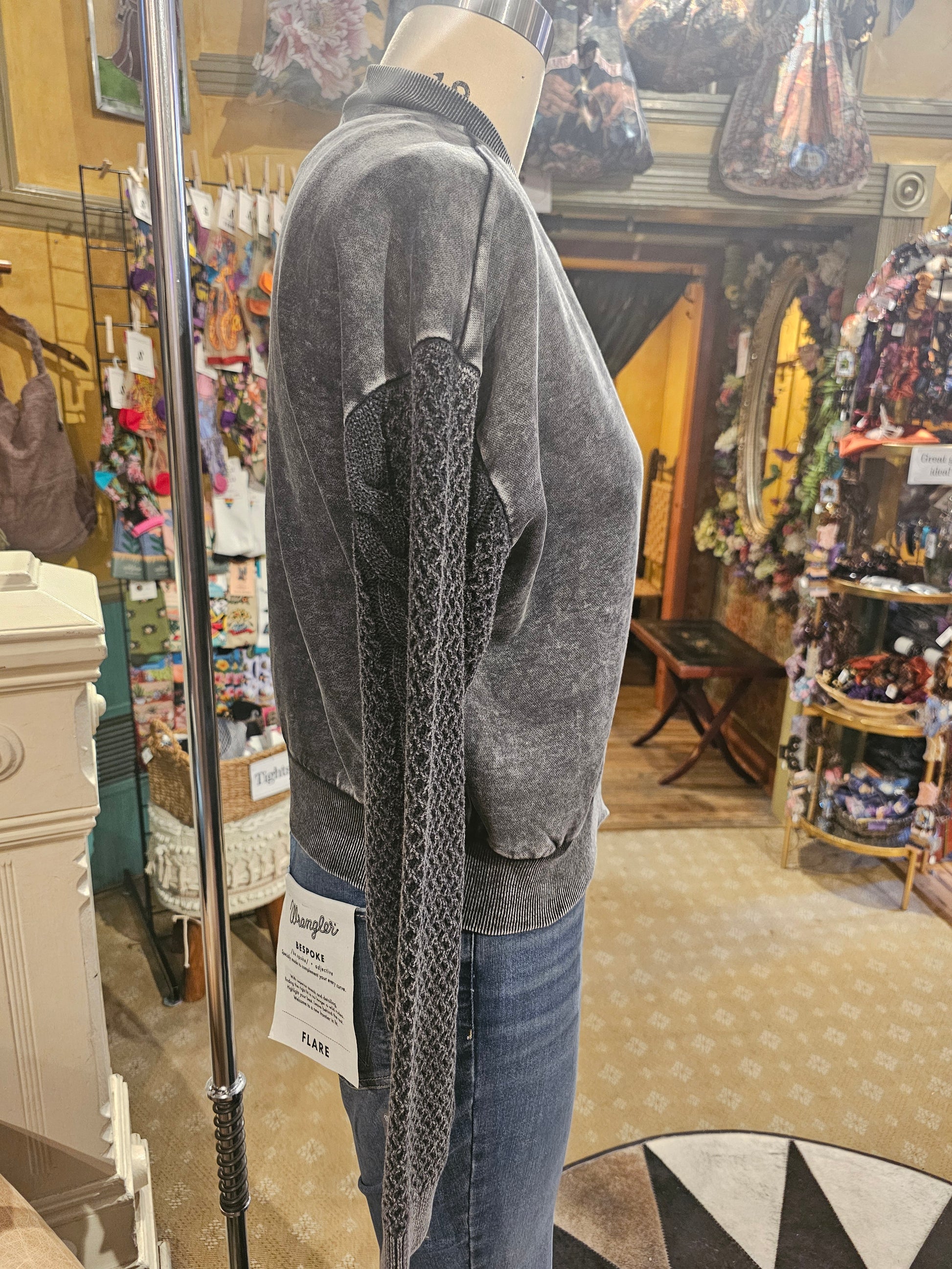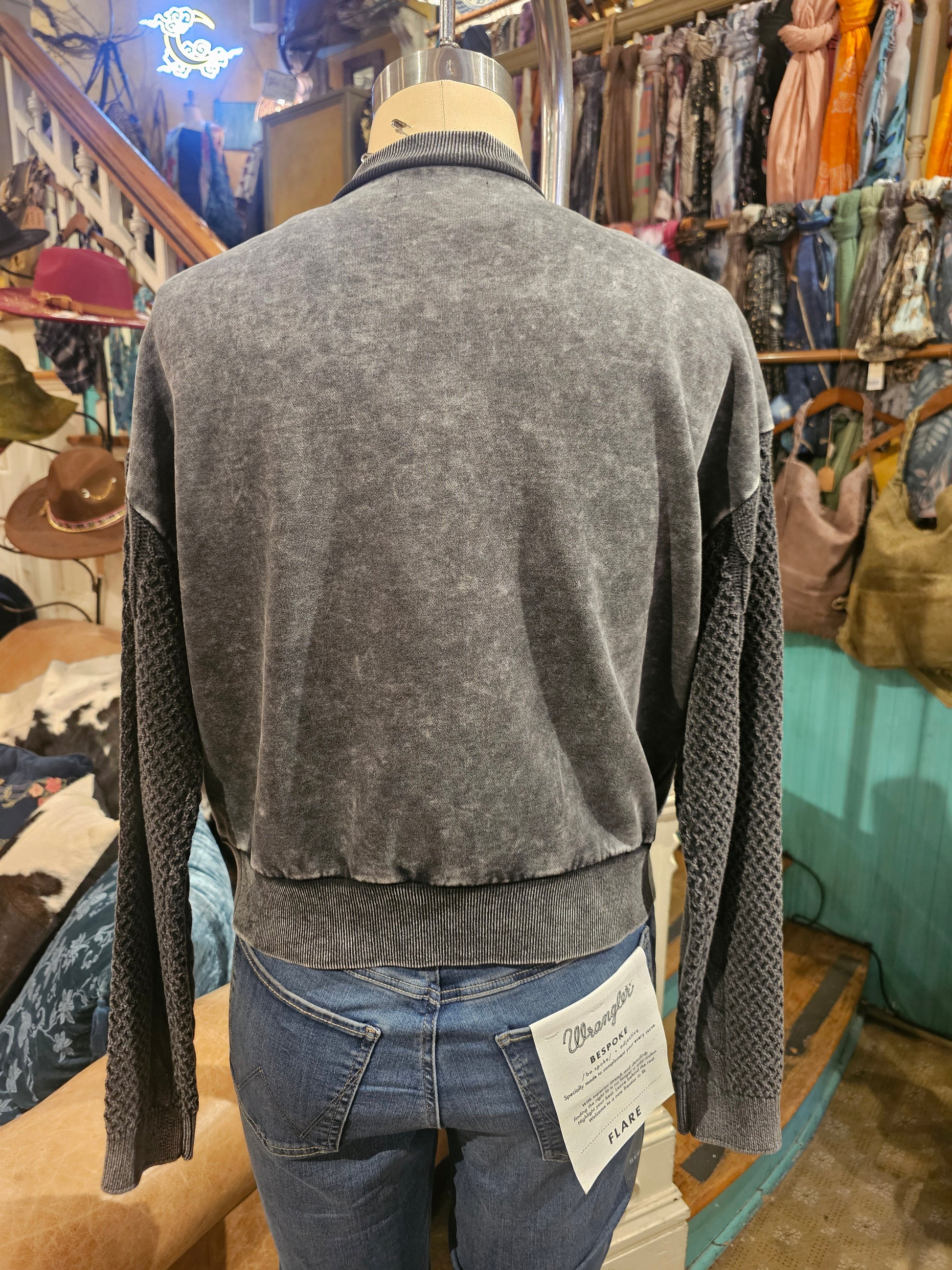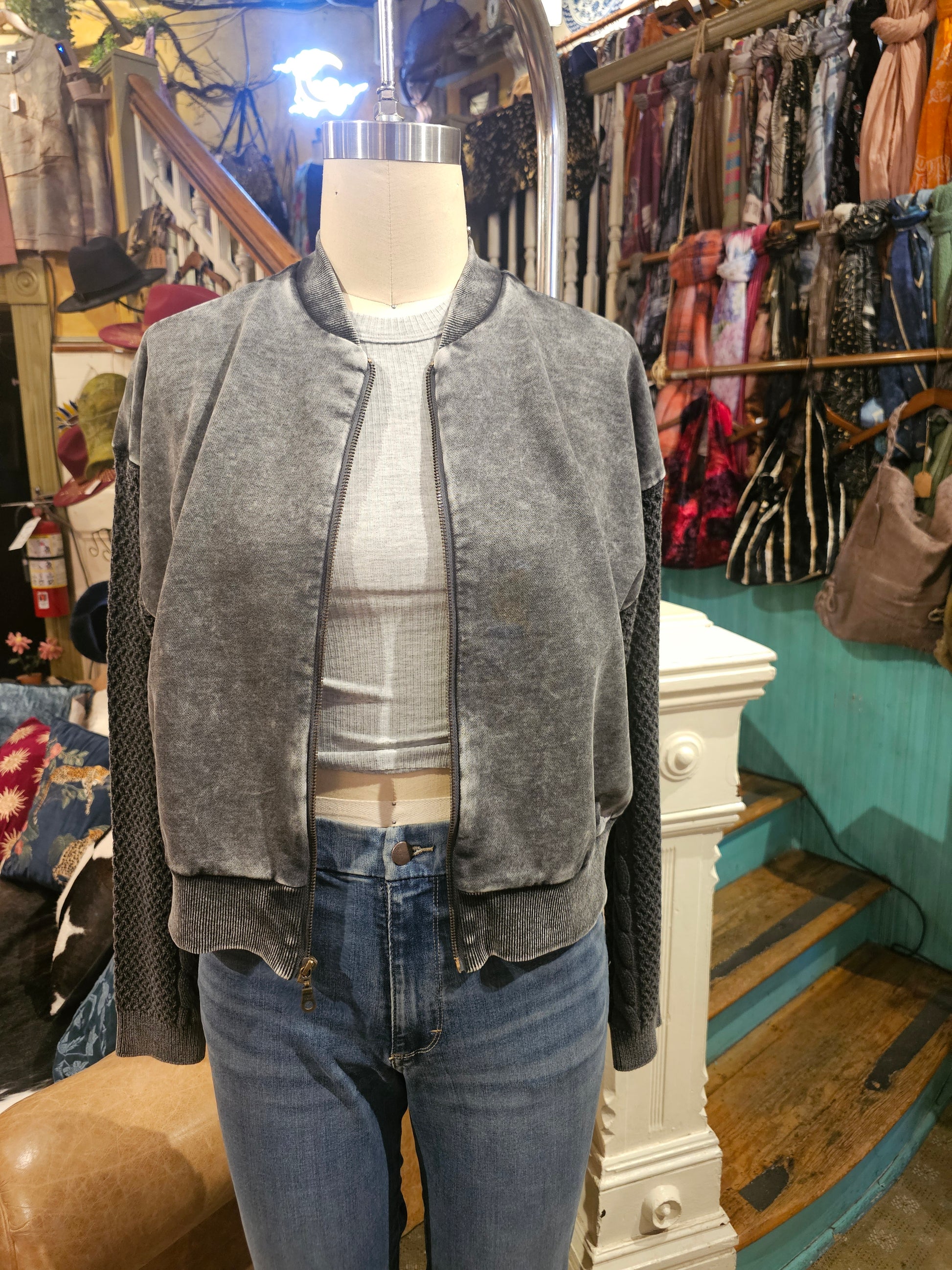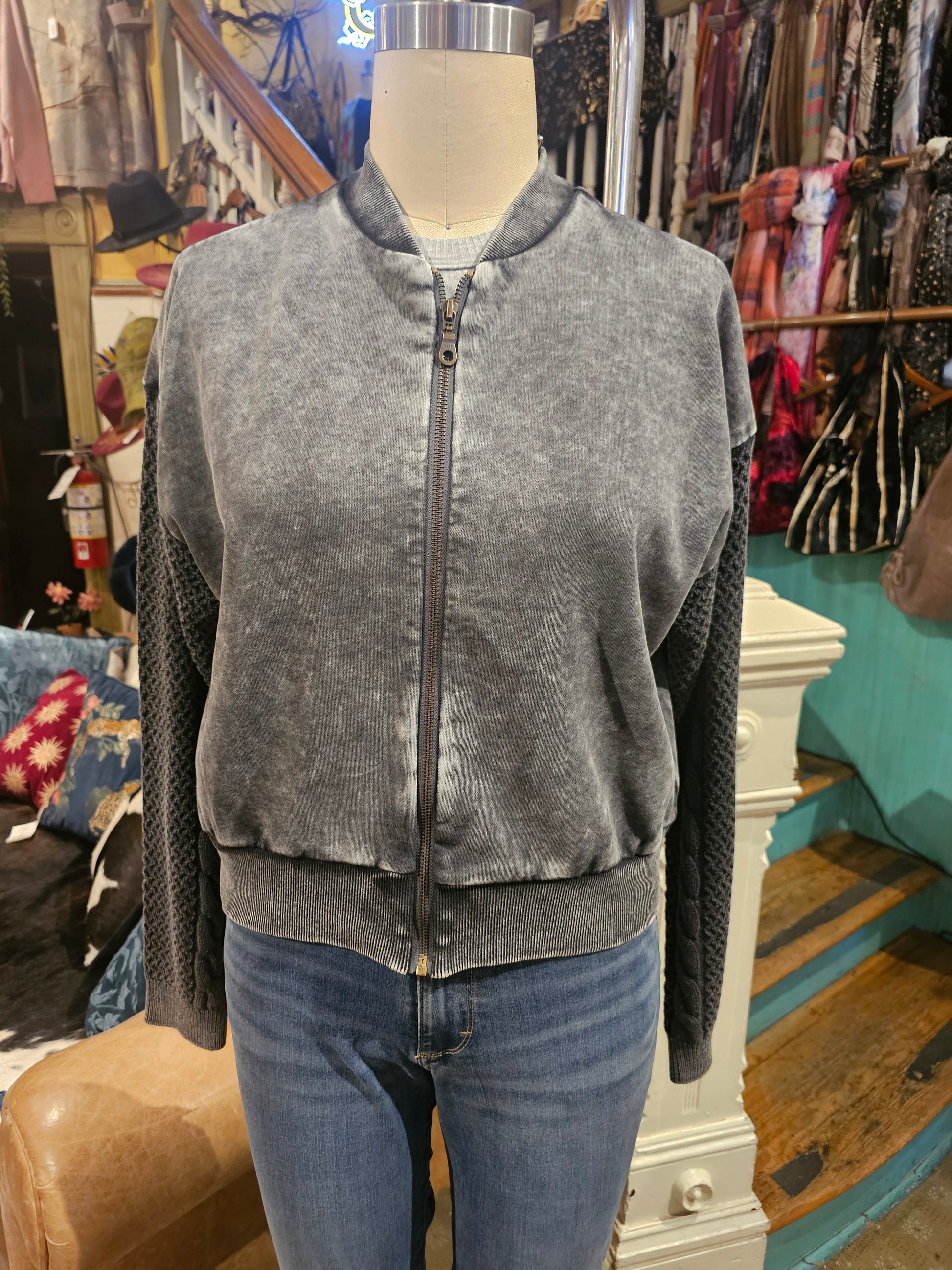 Stone wash zip up longsleeve top with knit sweater arms